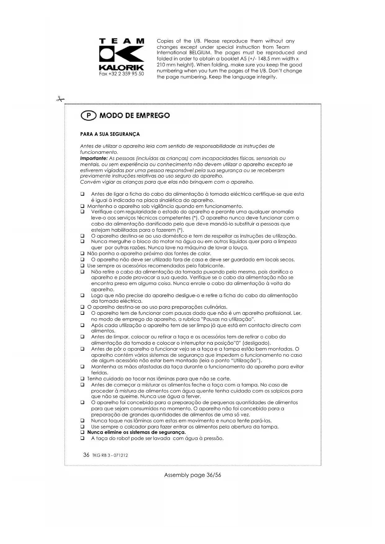 Antes de utilizar o aparelho leia com sentido de responsabilidade as instruções de funcionamento. Importante: As pessoas (incluídas as crianças) com incapacidades físicas, sensoriais ou mentais, ou sem experiência ou conhecimento não devem utilizar o aparelho excepto se estiverem vigiadas por uma pessoa responsável pela sua segurança ou se receberam previamente instruções relativas ao uso seguro do aparelho. Convém vigiar as crianças para que elas não brinquem com o aparelho. Antes de ligar a ficha do cabo da alimentação à tomada eléctrica certifique-se que esta é igual à indicada na placa sinalética do aparelho. Mantenha o aparelho sob vigilância quando em funcionamento. Verifique com regularidade o estado do aparelho e perante uma qualquer anomalia leve-o aos serviços técnicos competentes (*). O aparelho nunca deve funcionar com o cabo da alimentação danificado pelo que deve mandá-lo substituir a pessoas que estejam habilitadas para o fazerem (*). O aparelho destina-se ao uso doméstico e tem de respeitar as instruções de utilização. Nunca mergulhe o bloco do motor na água ou em outros líquidos quer para a limpeza quer por outras razões. Nunca lave na máquina de lavar a louça. Não ponha o aparelho próximo das fontes de calor. O aparelho não deve ser utilizado fora de casa e deve ser guardado em locais secos. Use sempre os acessórios recomendados pelo fabricante. Não retire o cabo da alimentação da tomada puxando pelo mesmo, pois danifica o aparelho e pode provocar a sua queda. Verifique se o cabo da alimentação não se encontra preso em alguma coisa. Nunca enrole o cabo da alimentação à volta do aparelho. Logo que não precise do aparelho desligue-o e retire a ficha do cabo da alimentação da tomada eléctrica. O aparelho destina-se ao uso para preparações culinárias. O aparelho tem de funcionar com pausas dado que não é um aparelho profissional. Ler, no modo de emprego do aparelho, a rubrica ”Pausas na utilização”. Após cada utilização o aparelho tem de ser limpo já que está em contacto directo com alimentos. Antes de limpar, colocar ou retirar a taça e os acessórios tem de retirar o cabo da alimentação da tomada e colocar o interruptor na posição”0” (desligado). Antes de pôr o aparelho a funcionar veja se a taça e a tampa estão bem montadas. O aparelho contém vários sistemas de segurança que impedem o funcionamento no caso de algum acessório não estar bem montado (leia o ponto “Utilização”). Mantenha as mãos afastadas da taça durante o funcionamento do aparelho para evitar feridas. Tenha cuidado ao tocar nas lâminas para que não se corte. Antes de começar a misturar os alimentos feche a taça com a tampa. No caso de proceder à mistura de alimentos com água quente tenha cuidado com os salpicos para que não se queime. Nunca use água a ferver. O aparelho foi concebido para a preparação de pequenas quantidades de alimentos para que sejam consumidos no momento. O aparelho não foi concebido para a preparação de grandes quantidades de alimentos de uma só vez. Nunca toque nas lâminas com estas em movimento e nunca tente pará-las. Use sempre o calcador para fazer entrar os alimentos pela abertura da tampa. Nunca elimine os sistemas de segurança. A taça do robot pode ser lavada com água à pressão. Copies of the I/B. Please reproduce them without any changes except under special instruction from Team International BELGIUM. The pages must be reproduced and folded in order to obtain a booklet A5 (+/- 148.5 mm width x 210 mm height). When folding, make sure you keep the good numbering when you turn the pages of the I/B. Don’t change the page numbering. Keep the language integrity.