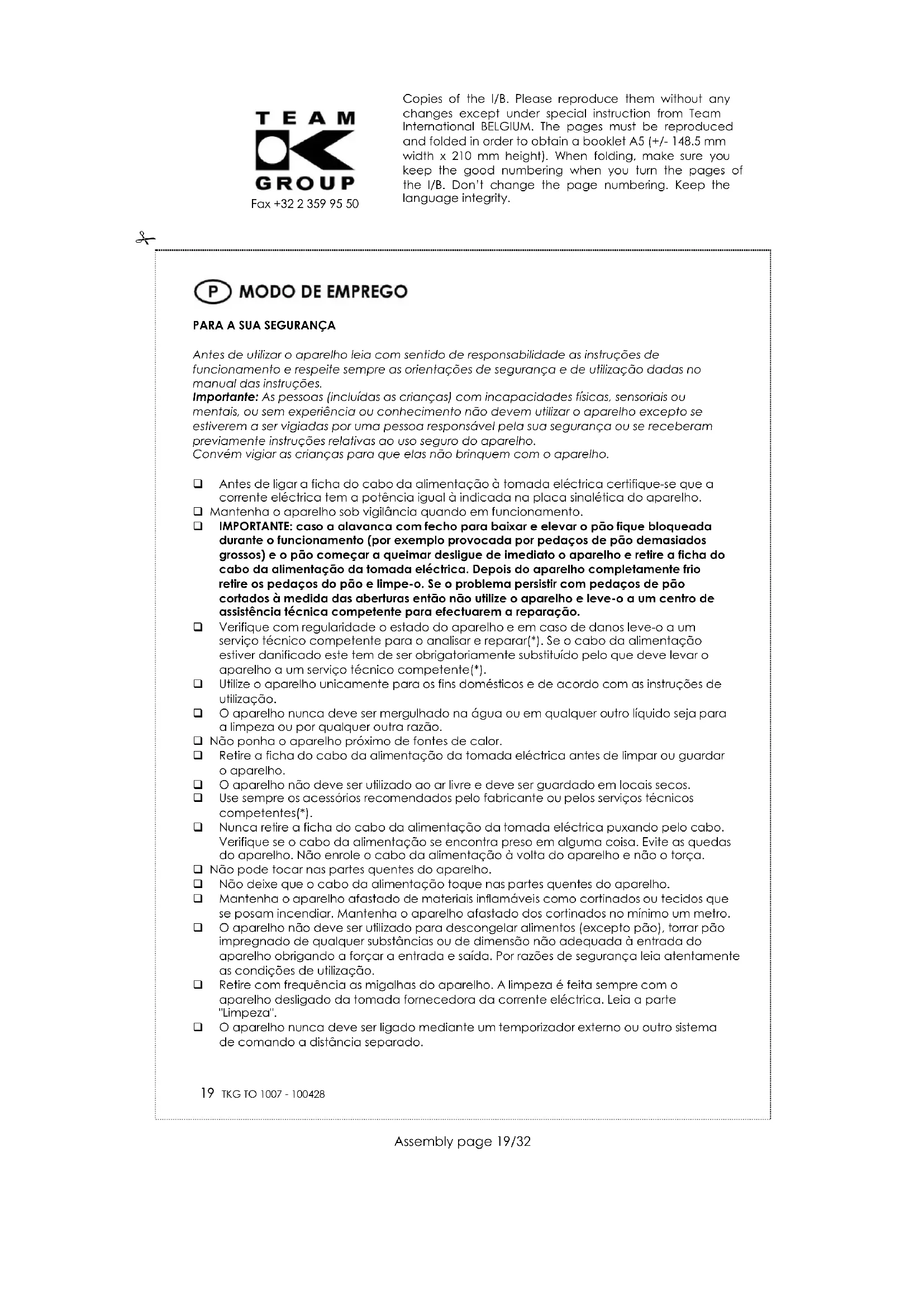 Antes de utilizar o aparelho leia com sentido de responsabilidade as instruções de funcionamento e respeite sempre as orientações de segurança e de utilização dadas no manual das instruções. Importante: As pessoas (incluídas as crianças) com incapacidades físicas, sensoriais ou mentais, ou sem experiência ou conhecimento não devem utilizar o aparelho excepto se estiverem a ser vigiadas por uma pessoa responsável pela sua segurança ou se receberam previamente instruções relativas ao uso seguro do aparelho. Convém vigiar as crianças para que elas não brinquem com o aparelho. Antes de ligar a ficha do cabo da alimentação à tomada eléctrica certifique-se que a corrente eléctrica tem a potência igual à indicada na placa sinalética do aparelho. Mantenha o aparelho sob vigilância quando em funcionamento. IMPORTANTE: caso a alavanca com fecho para baixar e elevar o pão fique bloqueada durante o funcionamento (por exemplo provocada por pedaços de pão demasiados grossos) e o pão começar a queimar desligue de imediato o aparelho e retire a ficha do cabo da alimentação da tomada eléctrica. Depois do aparelho completamente frio retire os pedaços do pão e limpe-o. Se o problema persistir com pedaços de pão cortados à medida das aberturas então não utilize o aparelho e leve-o a um centro de assistência técnica competente para efectuarem a reparação. Verifique com regularidade o estado do aparelho e em caso de danos leve-o a um serviço técnico competente para o analisar e reparar(*). Se o cabo da alimentação estiver danificado este tem de ser obrigatoriamente substituído pelo que deve levar o aparelho a um serviço técnico competente(*). Utilize o aparelho unicamente para os fins domésticos e de acordo com as instruções de utilização. O aparelho nunca deve ser mergulhado na água ou em qualquer outro líquido seja para a limpeza ou por qualquer outra razão. Não ponha o aparelho próximo de fontes de calor. Retire a ficha do cabo da alimentação da tomada eléctrica antes de limpar ou guardar o aparelho. O aparelho não deve ser utilizado ao ar livre e deve ser guardado em locais secos. Use sempre os acessórios recomendados pelo fabricante ou pelos serviços técnicos competentes(*). Nunca retire a ficha do cabo da alimentação da tomada eléctrica puxando pelo cabo. Verifique se o cabo da alimentação se encontra preso em alguma coisa. Evite as quedas do aparelho. Não enrole o cabo da alimentação à volta do aparelho e não o torça. Não pode tocar nas partes quentes do aparelho. Não deixe que o cabo da alimentação toque nas partes quentes do aparelho. Mantenha o aparelho afastado de materiais inflamáveis como cortinados ou tecidos que se posam incendiar. Mantenha o aparelho afastado dos cortinados no mínimo um metro. O aparelho não deve ser utilizado para descongelar alimentos (excepto pão), torrar pão impregnado de qualquer substâncias ou de dimensão não adequada à entrada do aparelho obrigando a forçar a entrada e saída. Por razões de segurança leia atentamente as condições de utilização. Retire com frequência as migalhas do aparelho. A limpeza é feita sempre com o aparelho desligado da tomada fornecedora da corrente eléctrica. Leia a parte "Limpeza". O aparelho nunca deve ser ligado mediante um temporizador externo ou outro sistema de comando a distância separado. Copies of the I/B. Please reproduce them without any changes except under special instruction from Team International BELGIUM. The pages must be reproduced and folded in order to obtain a booklet A5 (+/- 148.5 mm width x 210 mm height). When folding, make sure you keep the good numbering when you turn the pages of the I/B. Don’t change the page numbering. Keep the language integrity.