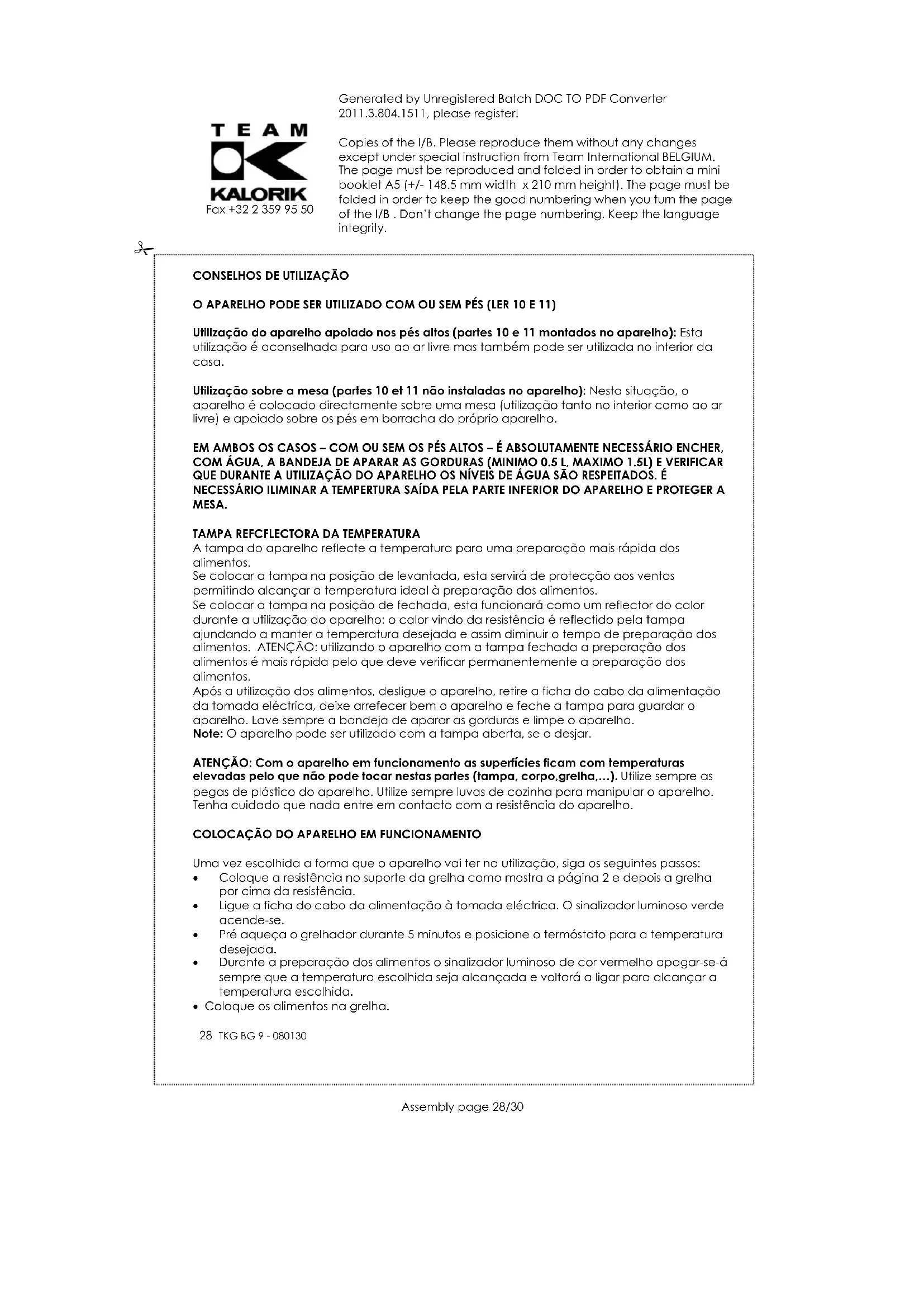 Uma vez escolhida a forma que o aparelho vai ter na utilização, siga os seguintes passos: Coloque a resistência no suporte da grelha como mostra a página 2 e depois a grelha por cima da resistência. Ligue a ficha do cabo da alimentação à tomada eléctrica. O sinalizador luminoso verde acende-se. Pré aqueça o grelhador durante 5 minutos e posicione o termóstato para a temperatura desejada. Durante a preparação dos alimentos o sinalizador luminoso de cor vermelho apagar-se-á sempre que a temperatura escolhida seja alcançada e voltará a ligar para alcançar a temperatura escolhida. Coloque os alimentos na grelha.Generated by Unregistered Batch DOC TO PDF Converter 2011.3.804.1511, please register! Copies of the I/B. Please reproduce them without any changes except under special instruction from Team International BELGIUM. The page must be reproduced and folded in order to obtain a mini booklet A5 (+/- 148.5 mm width x 210 mm height). The page must be folded in order to keep the good numbering when you turn the page of the I/B . Don’t change the page numbering. Keep the language integrity.