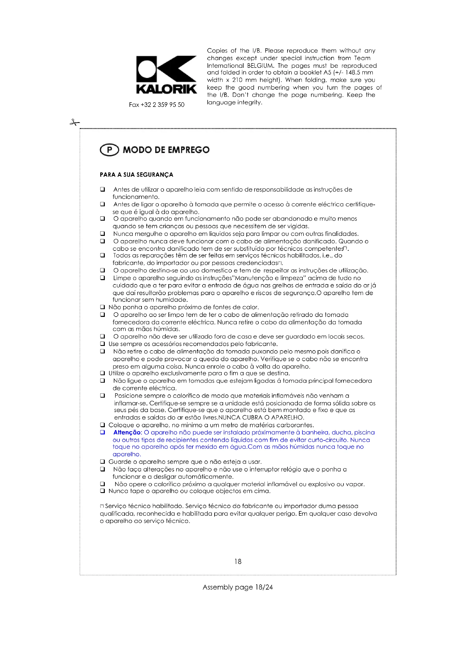 O aparelho tem instalado um sistema contra o aquecimento excessivo que em situação de sobre aquecimento, provocado por exemplo por obstrução total ou parcial das grelhas, não deixa funcionar o aparelho. Para que o aparelho volte a funcionar, tem de desobstruir as grelhas e retirar o cabo da alimentação da tomada eléctrica durante cerca de 10 minutos. Caso se mantenha a anomalia e o aparelho não funcionar,procure o apoio técnico. O segundo sistema de segurança desliga a corrente em determinadas situações como a de queda. Nestes casos retire o cabo de alimentação da tomada. Coloque o aparelho direito. Copies of the I/B. Please reproduce them without any changes except under special instruction from Team International BELGIUM. The pages must be reproduced and folded in order to obtain a booklet A5 (+/- 148.5 mm width x 210 mm height). When folding, make sure you keep the good numbering when you turn the pages of the I/B. Don’t change the page numbering. Keep the language integrity.