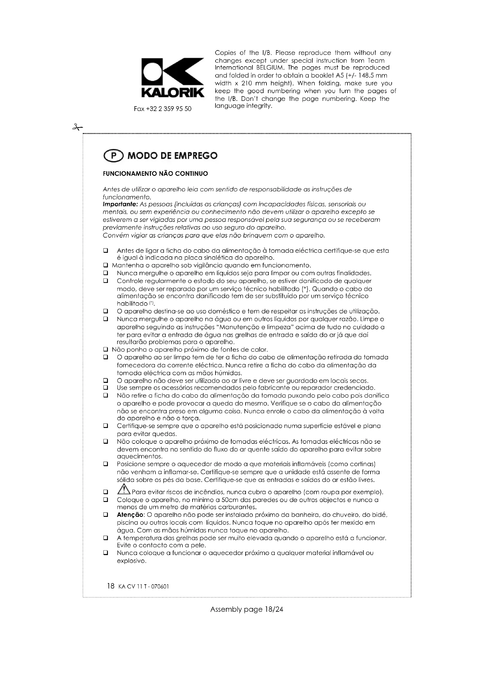 O aparelho destina-se ao uso doméstico e tem de respeitar as instruções de utilização. Nunca mergulhe o aparelho na água ou em outros líquidos por qualquer razão. Limpe o aparelho seguindo as instruções “Manutenção e limpeza” acima de tudo no cuidado a ter para evitar a entrada de água nas grelhas de entrada e saída do ar já que daí resultarão problemas para o aparelho. Não ponha o aparelho próximo de fontes de calor. O aparelho ao ser limpo tem de ter a ficha do cabo de alimentação retirada da tomada fornecedora da corrente eléctrica. Nunca retire a ficha do cabo da alimentação da tomada eléctrica com as mãos húmidas. O aparelho não deve ser utilizado ao ar livre e deve ser guardado em locais secos. Use sempre os acessórios recomendados pelo fabricante ou reparador credenciado. Não retire a ficha do cabo da alimentação da tomada puxando pelo cabo pois danifica o aparelho e pode provocar a queda do mesmo. Verifique se o cabo da alimentação não se encontra preso em alguma coisa. Nunca enrole o cabo da alimentação à volta do aparelho e não o torça. Certifique-se sempre que o aparelho está posicionado numa superfície estável e plana para evitar quedas. Não coloque o aparelho próximo de tomadas eléctricas. As tomadas eléctricas não se devem encontra no sentido do fluxo do ar quente saído do aparelho para evitar sobre aquecimentos. Posicione sempre o aquecedor de modo a que materiais inflamáveis (como cortinas) não venham a inflamar-se. Certifique-se sempre que a unidade está assente de forma sólida sobre os pés da base. Certifique-se que as entradas e saídas do ar estão livres. Para evitar riscos de incêndios, nunca cubra o aparelho (com roupa por exemplo). Coloque o aparelho, no mínimo a 50cm das paredes ou de outros objectos e nunca a menos de um metro de matérias carburantes. Atenção: O aparelho não pode ser instalado próximo da banheira, do chuveiro, do bidé, piscina ou outros locais com líquidos. Nunca toque no aparelho após ter mexido em água. Com as mãos húmidas nunca toque no aparelho. A temperatura das grelhas pode ser muito elevada quando o aparelho está a funcionar. Evite o contacto com a pele. Nunca coloque a funcionar o aquecedor próximo a qualquer material inflamável ou explosivo. Copies of the I/B. Please reproduce them without any changes except under special instruction from Team International BELGIUM. The pages must be reproduced and folded in order to obtain a booklet A5 (+/- 148.5 mm width x 210 mm height). When folding, make sure you keep the good numbering when you turn the pages of the I/B. Don’t change the page numbering. Keep the language integrity. 19 KA CV 11 T - 070601