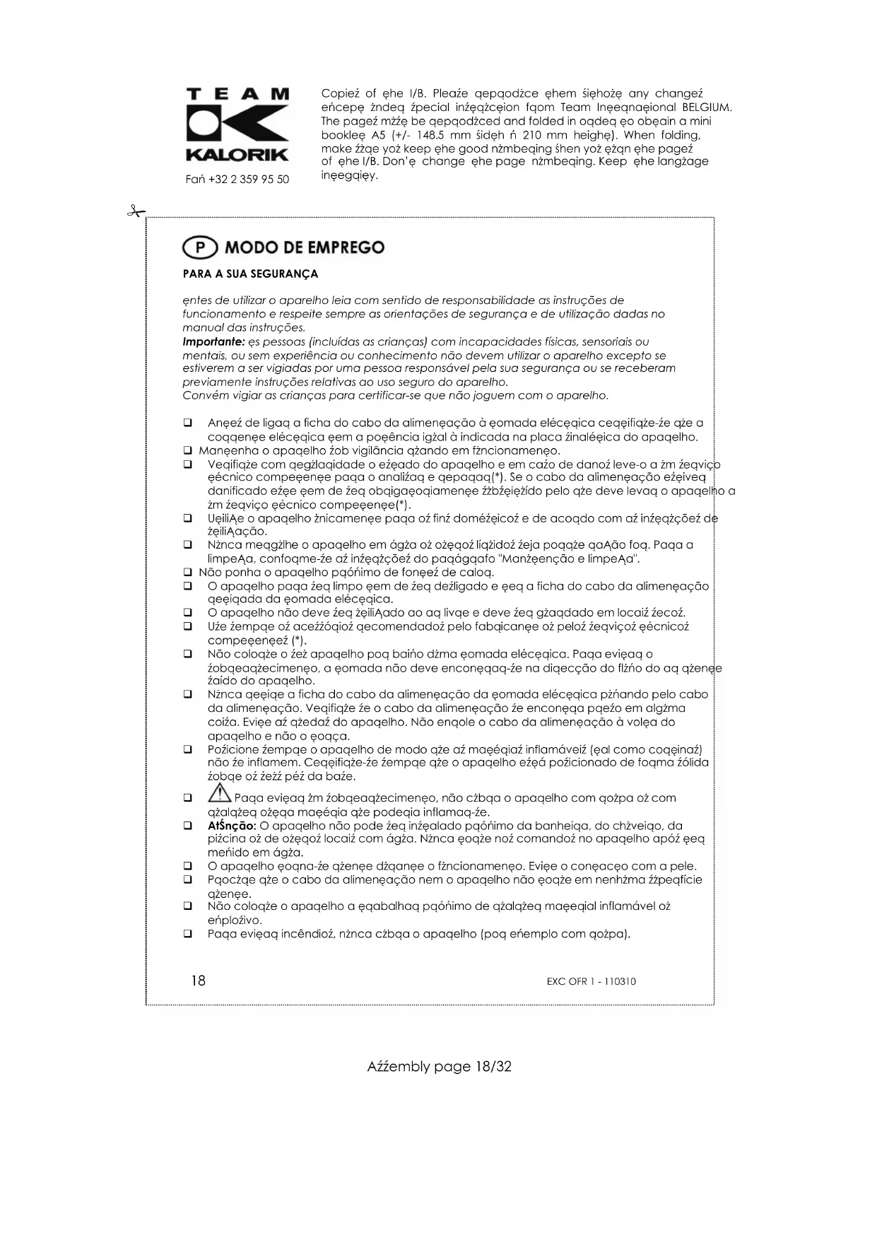 Antes de utilizar o aparelho leia com sentido de responsabilidade as instruções de funcionamento e respeite sempre as orientações de segurança e de utilização dadas no manual das instruções. Importante: As pessoas (incluídas as crianças) com incapacidades físicas, sensoriais ou mentais, ou sem experiência ou conhecimento não devem utilizar o aparelho excepto se estiverem a ser vigiadas por uma pessoa responsável pela sua segurança ou se receberam previamente instruções relativas ao uso seguro do aparelho. Convém vigiar as crianças para certificar-se que não joguem com o aparelho. Antes de ligar a ficha do cabo da alimentação à tomada eléctrica certifique-se que a corrente eléctrica tem a potência igual à indicada na placa sinalética do aparelho. Mantenha o aparelho sob vigilância quando em funcionamento. Verifique com regularidade o estado do aparelho e em caso de danos leve-o a um serviço técnico competente para o analisar e reparar(*). Se o cabo da alimentação estiver danificado este tem de ser obrigatoriamente substituído pelo que deve levar o aparelho a um serviço técnico competente(*). Utilize o aparelho unicamente para os fins domésticos e de acordo com as instruções de utilização. Nunca mergulhe o aparelho em água ou outros líquidos seja porque razão for. Para a limpeza, conforme-se as instruções do parágrafo "Manutenção e limpeza". Não ponha o aparelho próximo de fontes de calor. O aparelho para ser limpo tem de ser desligado e ter a ficha do cabo da alimentação retirada da tomada eléctrica. O aparelho não deve ser utilizado ao ar livre e deve ser guardado em locais secos. Use sempre os acessórios recomendados pelo fabricante ou pelos serviços técnicos competentes (*). Não coloque o seu aparelho por baixo duma tomada eléctrica. Para evitar o sobreaquecimento, a tomada não deve encontrar-se na direcção do fluxo do ar quente saído do aparelho. Nunca retire a ficha do cabo da alimentação da tomada eléctrica puxando pelo cabo da alimentação. Verifique se o cabo da alimentação se encontra preso em alguma coisa. Evite as quedas do aparelho. Não enrole o cabo da alimentação à volta do aparelho e não o torça. Posicione sempre o aparelho de modo que as matérias inflamáveis (tal como cortinas) não se inflamem. Certifique-se sempre que o aparelho está posicionado de forma sólida sobre os seus pés da base. Para evitar um sobreaquecimento, não cubra o aparelho com roupa ou com qualquer outra matéria que poderia inflamar-se. Atenção: O aparelho não pode ser instalado próximo da banheira, do chuveiro, da piscina ou de outros locais com água. Nunca toque nos comandos no aparelho após ter mexido em água. O aparelho torna-se quente durante o funcionamento. Evite o contacto com a pele. Procure que o cabo da alimentação nem o aparelho não toque em nenhuma superfície quente. Não coloque o aparelho a trabalhar próximo de qualquer material inflamável ou explosivo. Para evitar incêndios, nunca cubra o aparelho (por exemplo com roupa).Copies of the I/B. Please reproduce them without any changes except under special instruction from Team International BELGIUM. The pages must be reproduced and folded in order to obtain a mini booklet A5 (+/- 148.5 mm width x 210 mm height). When folding, make sure you keep the good numbering when you turn the pages of the I/B. Don’t change the page numbering. Keep the language integrity.