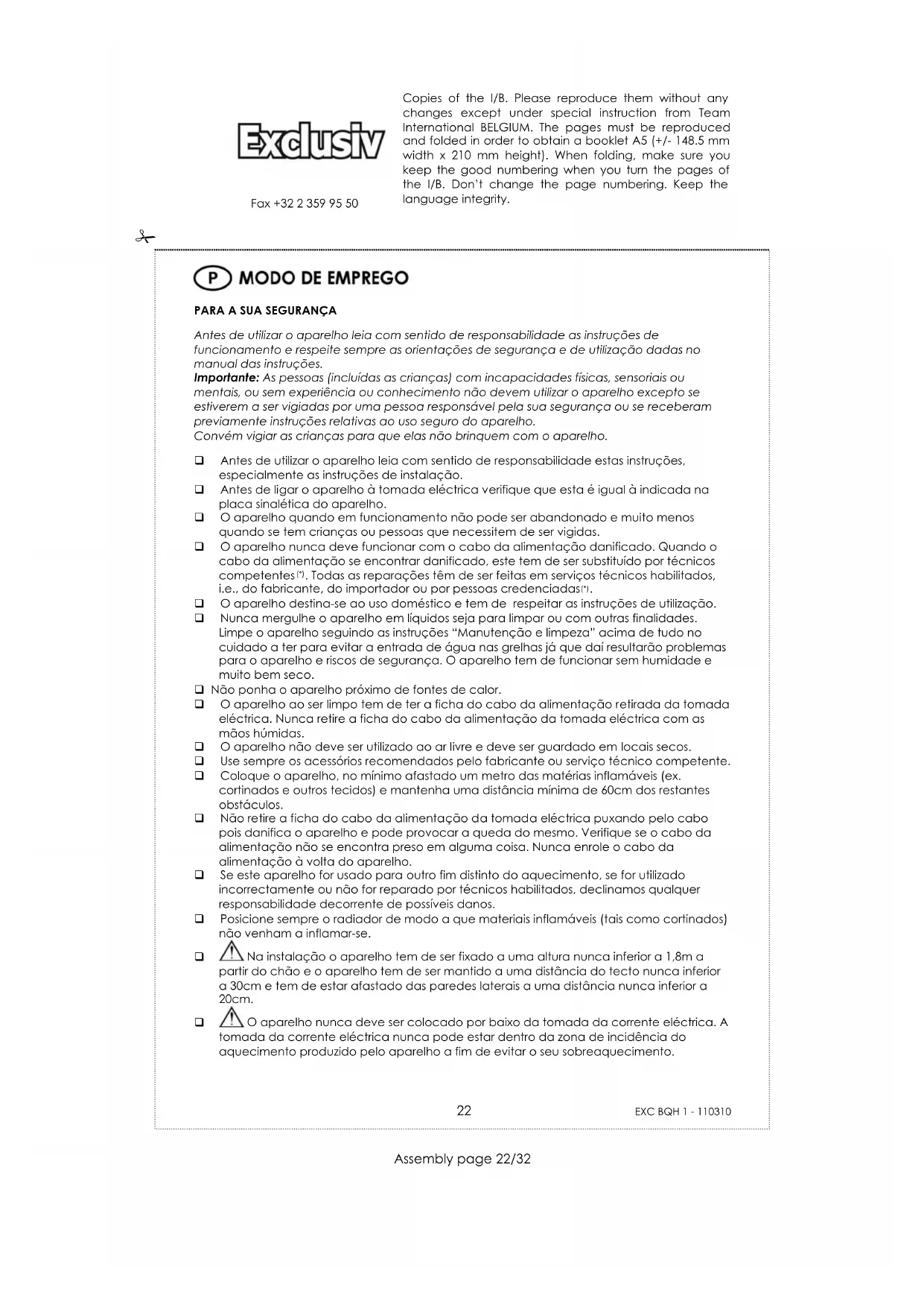 Assembly page 22/32 Copies of the I/B. Please reproduce them without any changes except under special instruction from Team International BELGIUM. The pages must be reproduced and folded in order to obtain a booklet A5 (+/- 148.5 mm width x 210 mm height). When folding, make sure you keep the good numbering when you turn the pages of the I/B. Don’t change the page numbering. Keep the language integrity. Fax +32 2 359 95 50 Nunca oriente o aquecimento saído do aparelho para o tecto mas sim de forma horizontal ou para baixo no sentido do chão. Este aconselhamento é muito importante pois evita o aquecimento excessivo do tecto da sala onde está instalado o aparelho e evita danos no revestimento do tecto. Mais, em tal situação, a posição do interruptor não seria visível.