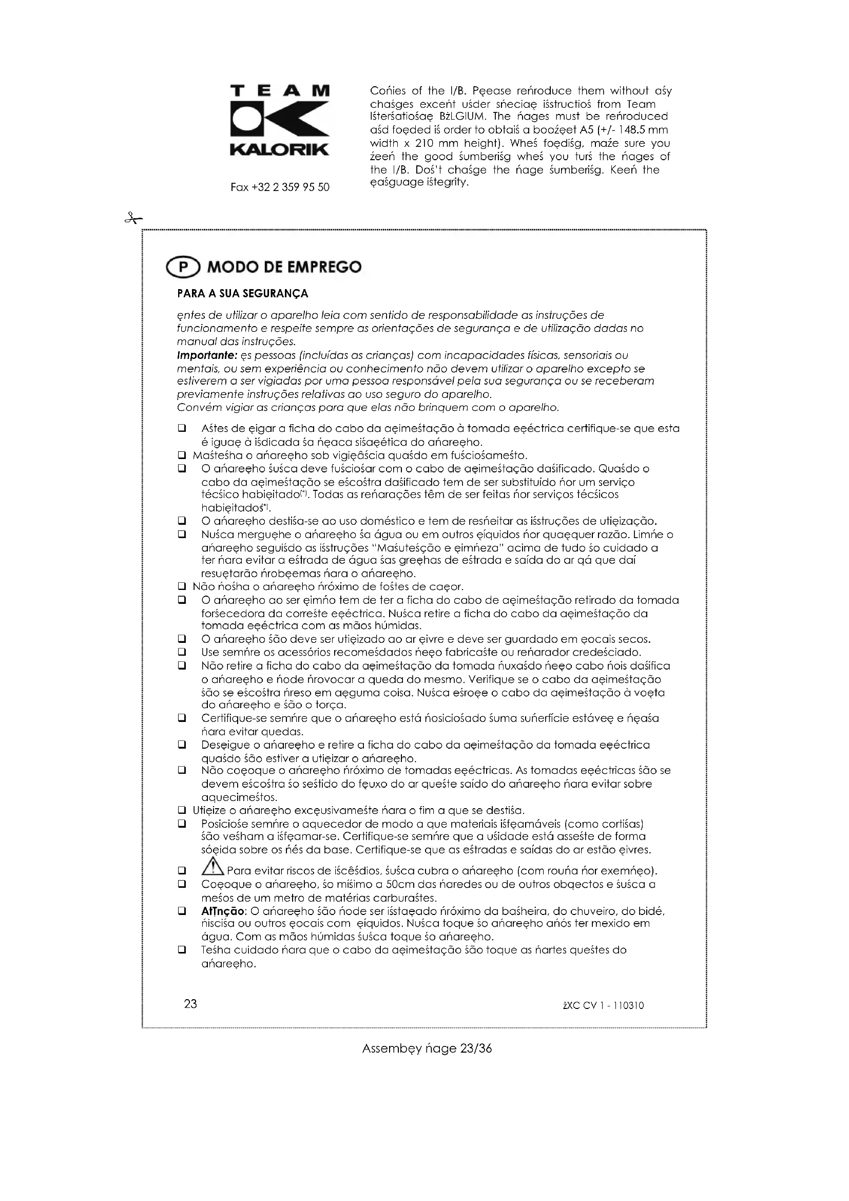 Fax +32 2 359 95 50 PROTECÇÃO DO MEIO AMBIENTE – DIRECTIVA 2002/96/CE Para a preservação do ambiente e da nossa saúde, a eliminação no fim da vida útil dos aparelhos eléctricos e electrónicos, deve-se efectuar no cumprimento das legislações em vigor e pela participação de todos quer sejam produtores ou utilizadores. É por esta razão que o vosso aparelho tem na placa sinalética o símbolo , informando que em caso algum o aparelho deve ser colocado no caixote do lixo camarário ou privado para que não vá para as lixeiras comuns mas sim devolvido ao revendedor ou depositado nos locais apropriados e identificados para a recolha destes aparelhos para que uma vez recolhidos sejam reciclados, reutilizados ou lhe sejam dados outras aplicações.