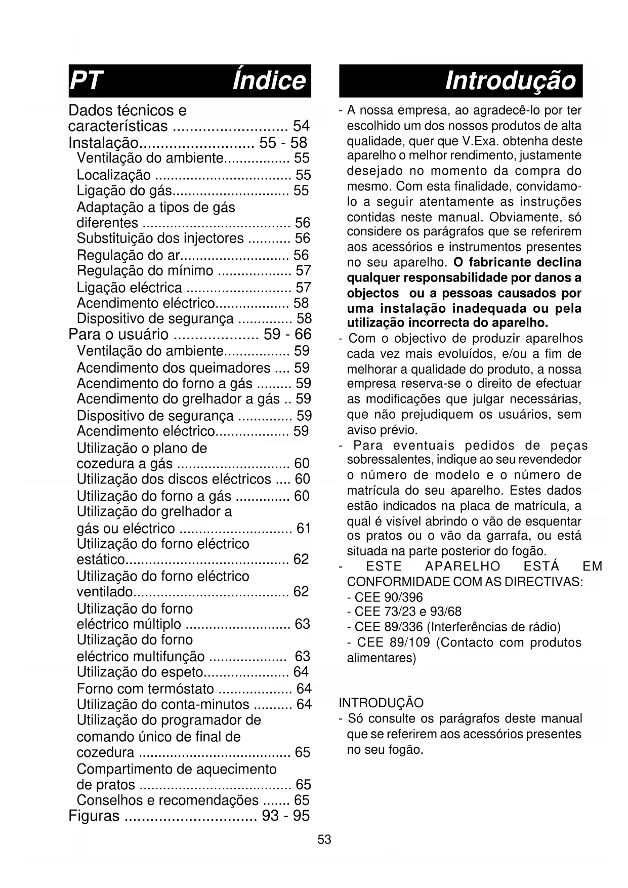 CONFORMIDADE COM AS DIRECTIVAS: - CEE 90/396 - CEE 73/23 e 93/68 - CEE 89/336 (Interferências de rádio) - CEE 89/109 (Contacto com produtos alimentares) INTRODUÇÃO - Só consulte os parágrafos deste manual que se referirem aos acessórios presentes no seu fogão. Introdução Índice PT54