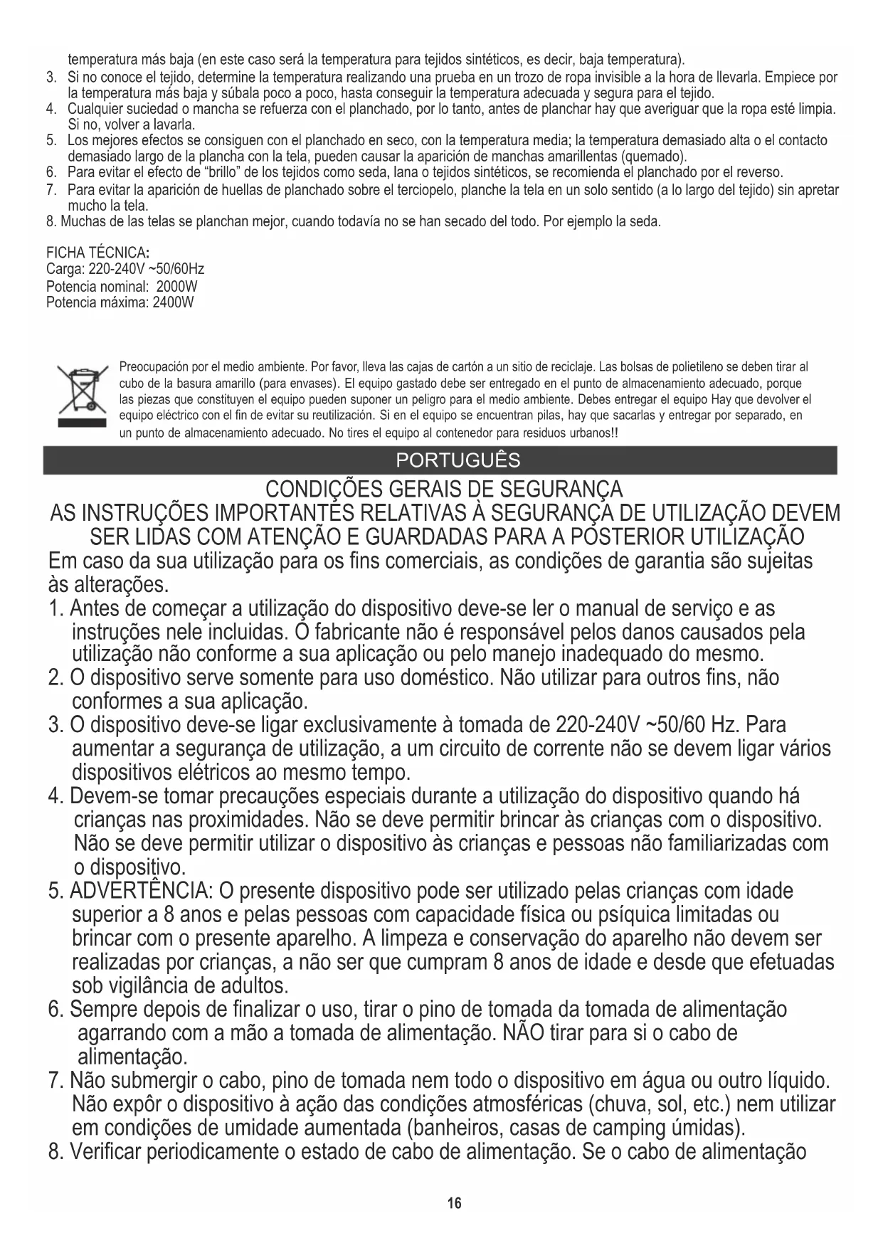 7. A luz-piloto do termóstato indica que o ferro está a aquecer. Espere que a luz-piloto se apague para começar a engomar. Aviso: durante o funcionamento a luz-piloto acende-se e apaga-se várias vezes, para indicar que a temperatura desejada mantém-se constante. Se diminuir a temperatura, espere até que a luz-piloto volte a acender. 8. O vapor regula-se com o comando de vapor (C). Coloque o comando de vapor na posição entre o máximo e o mínimo, regulando a sua intensidade conforme a necessidade e a temperatura. Aviso: O vapor é emitido constantemente só se mantém o ferro na posição horizontal. Para interromper a sua emissão coloque o ferro na posição vertical ou coloque o comando do vapor na posição “0”. Consoante as indicações no termóstato e quadro técnico da página anterior, a função de vapor pôde utilizar-se só a temperaturas mais altas. Caso a temperatura for demasiado baixa, o ferro pôde “pingar”. Botão Super Vapor. Engomar na vertical. Carregue no comando Super Vapor para lançar um jacto de vapor concentrado que penetra nos tecidos para remover as rugas mais resistentes. Espere uns segundos antes de carregar de novo. Utilizando o comando Super Vapor (por impulsos) é possível engomar na posição vertical (cortinas, roupa pendurada, etc.). Aviso: A função Super Vapor pôde utilizar-se só com temperaturas altas. Não utilize a função quando a luz-piloto do termóstato estiver acesa. Volte a engomar só quando a luz-piloto apagar. Engomar a seco Coloque o comando de vapor na posição “0”. Função de pulverizador Assegure-se de que o depósito (M) contém água. Carregue no botão de pulverizador (lentamente se quiser um jacto de água forte) ouSAUGOS SĄLYGOS. SVARBŪS NAUDOJIMO SAUGOS INSTRUKCIJOS PRAŠOME ATSITIKTINIAI ATSISKAITYTI IR ATSIŽVELGTI Į BŪSIMĄ REFERENCE Garantijos sąlygos skiriasi, jei prietaisas naudojamas komerciniais tikslais.