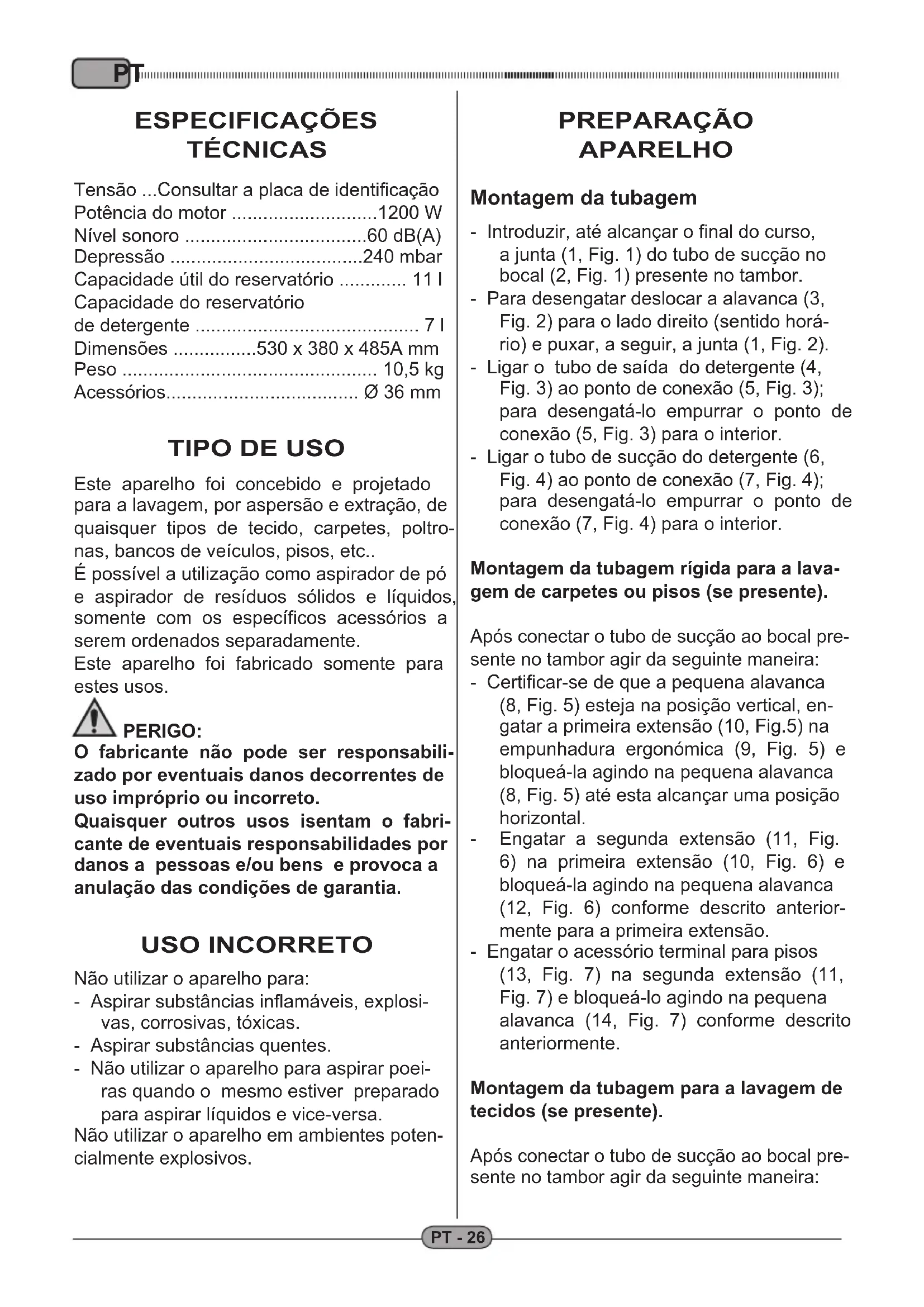 Este aparelho foi concebido e projetado para a lavagem, por aspersão e extração, de quaisquer tipos de tecido, carpetes, poltro- nas, bancos de veículos, pisos, etc.. É possível a utilização como aspirador de pó e aspirador de resíduos sólidos e líquidos, somente com os específicos acessórios a serem ordenados separadamente. Este aparelho foi fabricado somente para estes usos. PERIGO: O fabricante não pode ser responsabili- zado por eventuais danos decorrentes de uso impróprio ou incorreto. Quaisquer outros usos isentam o fabri- cante de eventuais responsabilidades por danos a pessoas e/ou bens e provoca a anulação das condições de garantia. USO INCORRETO Não utilizar o aparelho para: - Aspirar substâncias inflamáveis, explosi- vas, corrosivas, tóxicas. - Aspirar substâncias quentes. - Não utilizar o aparelho para aspirar poei- ras quando o mesmo estiver preparado para aspirar líquidos e vice-versa. Não utilizar o aparelho em ambientes poten- cialmente explosivos. PREPARAÇÃO APARELHO Montagem da tubagem - Introduzir, até alcançar o final do curso, a junta (1, Fig. 1) do tubo de sucção no bocal (2, Fig. 1) presente no tambor. - Para desengatar deslocar a alavanca (3, Fig. 2) para o lado direito (sentido horá- rio) e puxar, a seguir, a junta (1, Fig. 2). - Ligar o tubo de saída do detergente (4, Fig. 3) ao ponto de conexão (5, Fig. 3); para desengatá-lo empurrar o ponto de conexão (5, Fig. 3) para o interior. - Ligar o tubo de sucção do detergente (6, Fig. 4) ao ponto de conexão (7, Fig. 4); para desengatá-lo empurrar o ponto de conexão (7, Fig. 4) para o interior. Montagem da tubagem rígida para a lava- gem de carpetes ou pisos (se presente). Após conectar o tubo de sucção ao bocal pre- sente no tambor agir da seguinte maneira: - Certificar-se de que a pequena alavanca (8, Fig. 5) esteja na posição vertical, en- gatar a primeira extensão (10, Fig.5) na empunhadura ergonómica (9, Fig. 5) e bloqueá-la agindo na pequena alavanca (8, Fig. 5) até esta alcançar uma posição horizontal. - Engatar a segunda extensão (11, Fig.