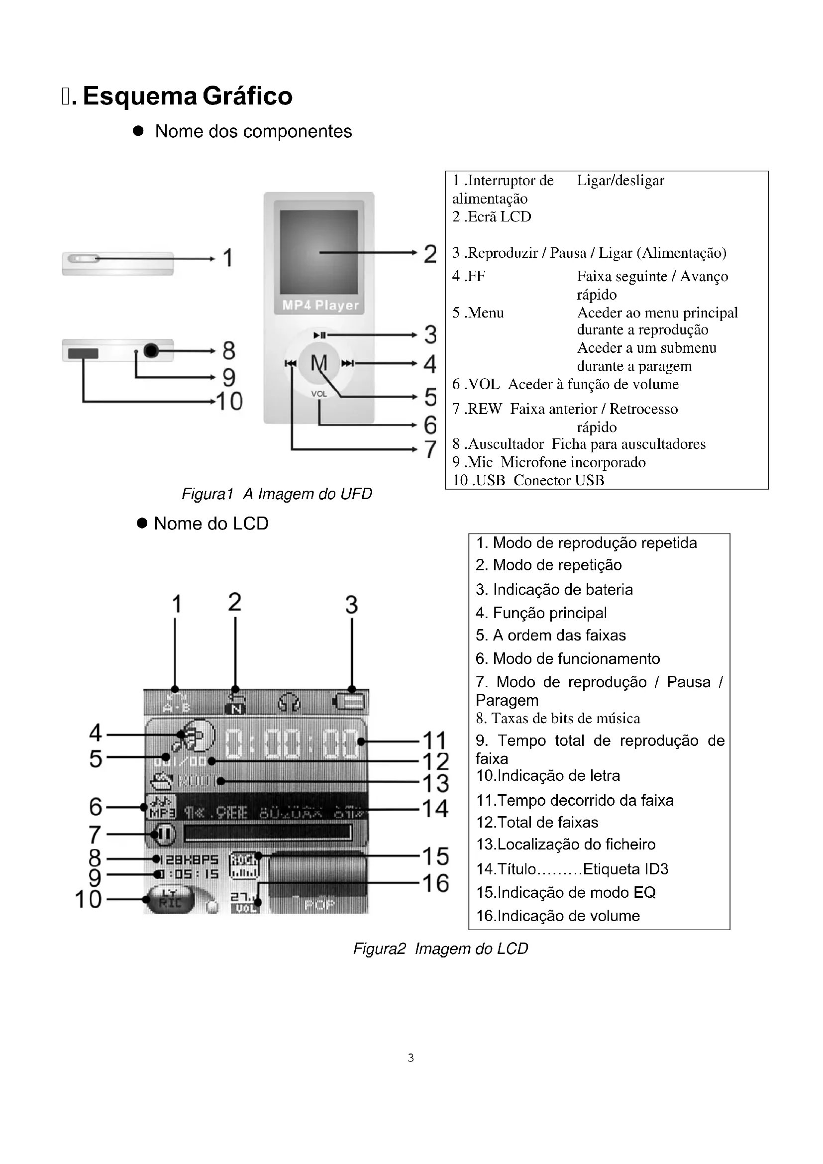 3 .Reproduzir / Pausa / Ligar (Alimentação) 4 .FF Faixa seguinte / Avanço rápido 5 .Menu Aceder ao menu principal durante a reprodução Aceder a um submenu durante a paragem 6 .VOL Aceder à função de volume 7 .REW Faixa anterior / Retrocesso rápido 8 .Auscultador Ficha para auscultadores 9 .Mic Microfone incorporado 10 .USB Conector USB