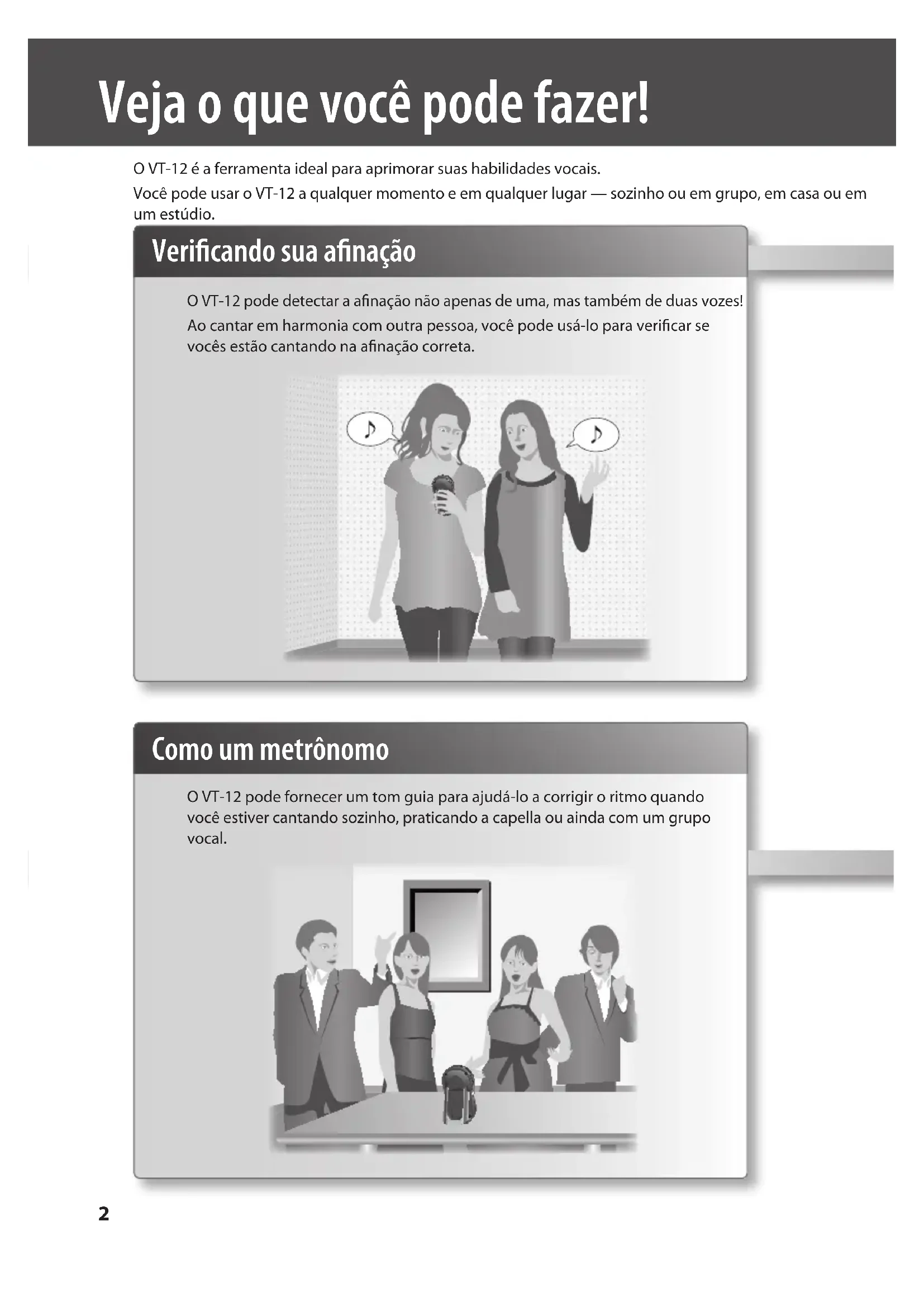 - No apague la unidad mientras el indicador de tono y estén iluminándose alternativamente. ENG DEU FRA ITA ESL POR NLDENG DEU FRA ITA ESL POR NLDVeja o que você pode fazer! Vericando sua anação O VT-12 pode detectar a anação não apenas de uma, mas também de duas vozes! Ao cantar em harmonia com outra pessoa, você pode usá-lo para vericar se vocês estão cantando na anação correta. O VT-12 é a ferramenta ideal para aprimorar suas habilidades vocais. Você pode usar o VT-12 a qualquer momento e em qualquer lugar — sozinho ou em grupo, em casa ou em um estúdio. Como um metrônomo O VT-12 pode fornecer um tom guia para ajudá-lo a corrigir o ritmo quando você estiver cantando sozinho, praticando a capella ou ainda com um grupo vocal. 2O que são faixas? O VT-12 contém faixas embutidas que você pode usar para praticar (aquecendo ou exercitando). Além das faixas embutidas, você também pode gravar suas músicas favoritas (pág. 14). Treinamento vocal O VT-12 oferece uma maneira eciente de aquecer ou praticar exercícios vocais. Você pode usar as faixas embutidas para praticar vocalizações antes de um coro ou de uma performance ao vivo, ou usá-las para melhorar sua expressão e técnica vocal.