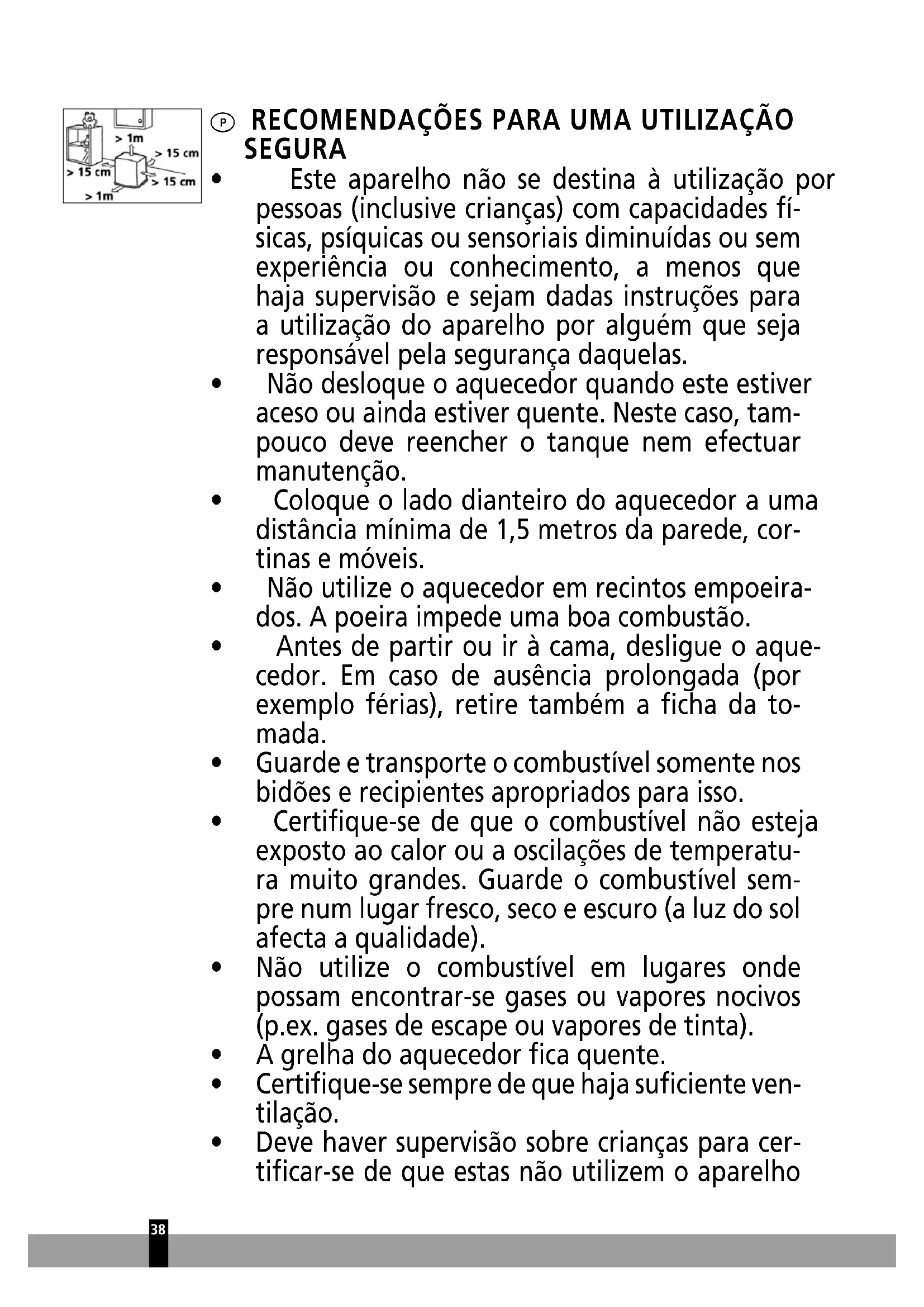 O seu aquecedor foi projectado para a utilização de combustível livre de água, puro e de alta qualidade. Somente assim estará garantida uma combustão limpa e eficaz. Combustíveis de má qualidade podem ter como consequência: E maior probabilidade de falhas E combustão incompleta E vida útil do aquecedor limitada E fumo e/ou mau cheiro E resíduo branco na grelha ou no revestimento Portanto o combustível apropriado é essencial para uma utilização segura, eficaz e confortável do seu aquecedor. Dano e/ou falhas do aquecedor em virtude do uso de um combustível que não seja óleo de parafina sem água de alta qualidade não estão cobertos pela garantia. Consulte sempre o seu vendedor mais próximo sobre o combustível apropriado para o seu aquecedor.