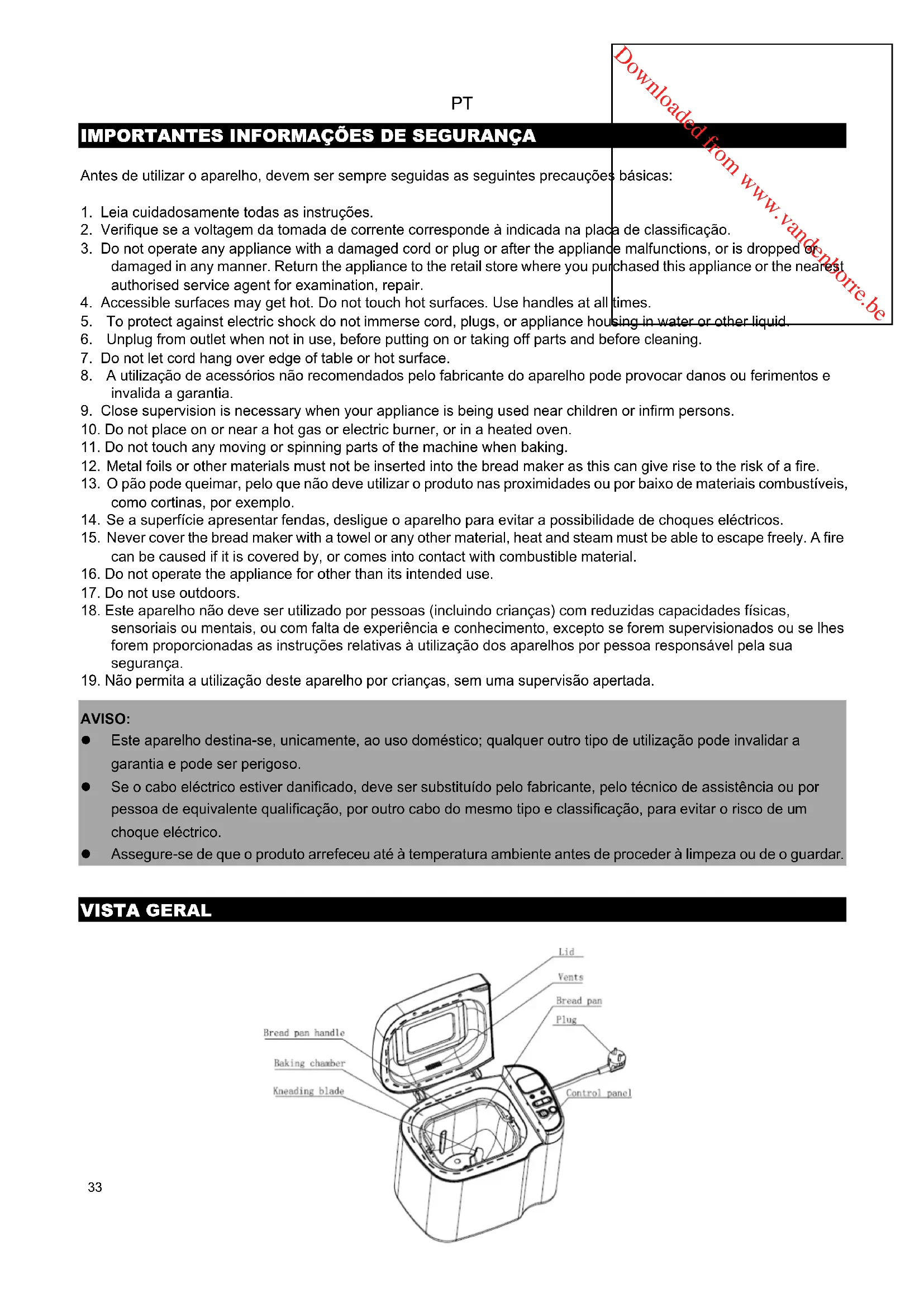 AVISO: z Este aparelho destina-se, unicamente, ao uso doméstico; qualquer outro tipo de utilização pode invalidar a garantia e pode ser perigoso. z Se o cabo eléctrico estiver danificado, deve ser substituído pelo fabricante, pelo técnico de assistência ou por pessoa de equivalente qualificação, por outro cabo do mesmo tipo e classificação, para evitar o risco de um choque eléctrico. z Assegure-se de que o produto arrefeceu até à temperatura ambiente antes de proceder à limpeza ou de o guardar. VISTA GERAL 33Downloaded from www.vandenborre.be