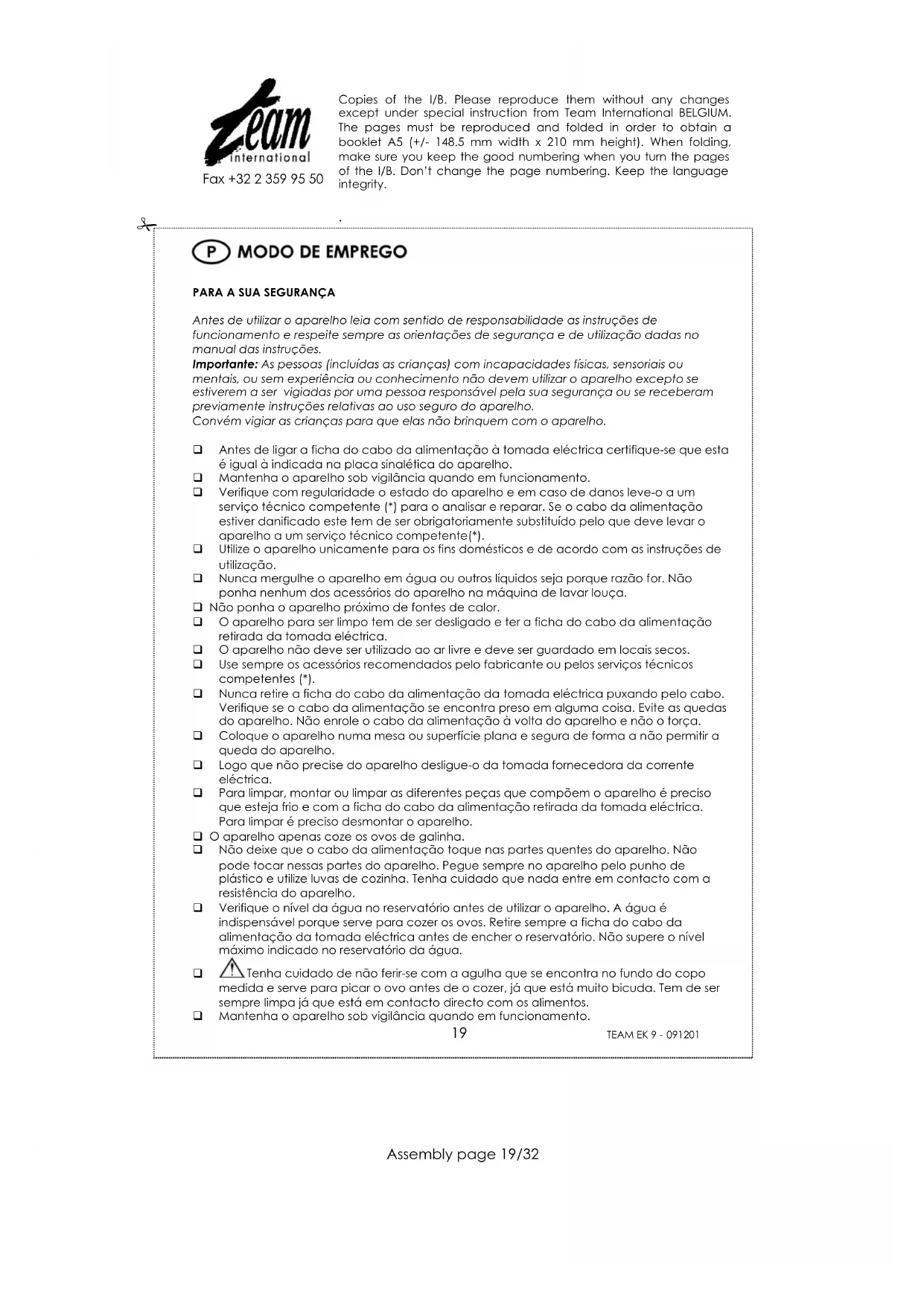Tenha cuidado de não ferir-se com a agulha que se encontra no fundo do copo medida e serve para picar o ovo antes de o cozer, já que está muito bicuda. Tem de ser sempre limpa já que está em contacto directo com os alimentos. Mantenha o aparelho sob vigilância quando em funcionamento.Copies of the I/B. Please reproduce them without any changes except under special instruction from Team International BELGIUM. The pages must be reproduced and folded in order to obtain a booklet A5 (+/- 148.5 mm width x 210 mm height). When folding, make sure you keep the good numbering when you turn the pages of the I/B. Don’t change the page numbering. Keep the language integrity. Fax +32 2 359 95 50