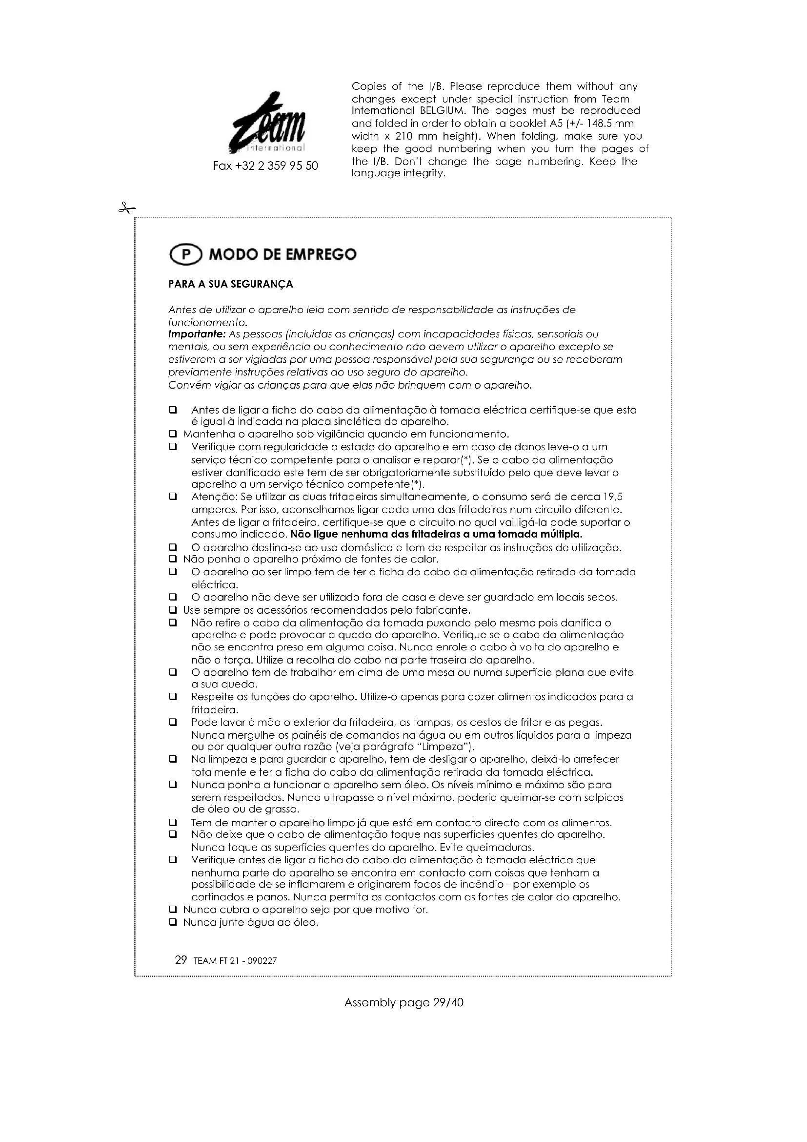 Seque bem os alimentos antes de os colocar a fritar. Os alimentos muito húmidos podem provocar salpicos de óleo quente ou originar o derrame do óleo. Para que tenha uma fritura homogénea prepare os alimentos com a mesma dimensão, espessura e do mesmo tipo. Alguns alimentos podem ser enfarinhados ou panados. Antes de colocar os alimentos a fritar, espere que a temperatura seja alcançada e que o sinalizador se apague. Nunca encha o cesto em demasia. ATENÇÃO: O aparelho está munido de um sistema de segurança que o desliga em caso de sobre aquecimento acidental (Exemplos: uma avaria no termostato, fritadeira sem óleo ou óleo abaixo do nível mínimo). Copies of the I/B. Please reproduce them without any changes except under special instruction from Team International BELGIUM. The pages must be reproduced and folded in order to obtain a booklet A5 (+/- 148.5 mm width x 210 mm height). When folding, make sure you keep the good numbering when you turn the pages of the I/B. Don‟t change the page numbering. Keep the language integrity.