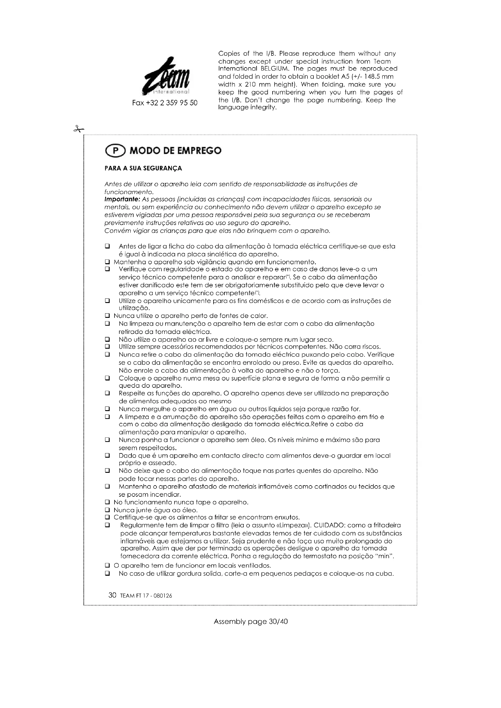 PROTECÇÃO DO MEIO AMBIENTE – DIRECTIVA 2002/96/CE Para a preservação do ambiente e da nossa saúde, a eliminação no fim da vida útil dos aparelhos eléctricos e electrónicos, deve-se efectuar no cumprimento das legislações em vigor e pela participação de todos quer sejam produtores ou utilizadores. É por esta razão que o vosso aparelho tem na placa sinalética o simbolo , informando que em caso algum o aparelho deve ser colocado no caixote do lixo camarário ou privado para que não vá para as lixeiras comuns mas sim devolvido ao revendedor ou depositado nos locais apropriados e identificados para a recolha destes aparelhos para que uma vez recolhidos sejam reciclados, reutilizados ou lhe sejam dados outras aplicações. Copies of the I/B. Please reproduce them without any changes except under special instruction from Team International BELGIUM. The pages must be reproduced and folded in order to obtain a booklet A5 (+/- 148.5 mm width x 210 mm height). When folding, make sure you keep the good numbering when you turn the pages of the I/B. Don‟t change the page numbering. Keep the language integrity.