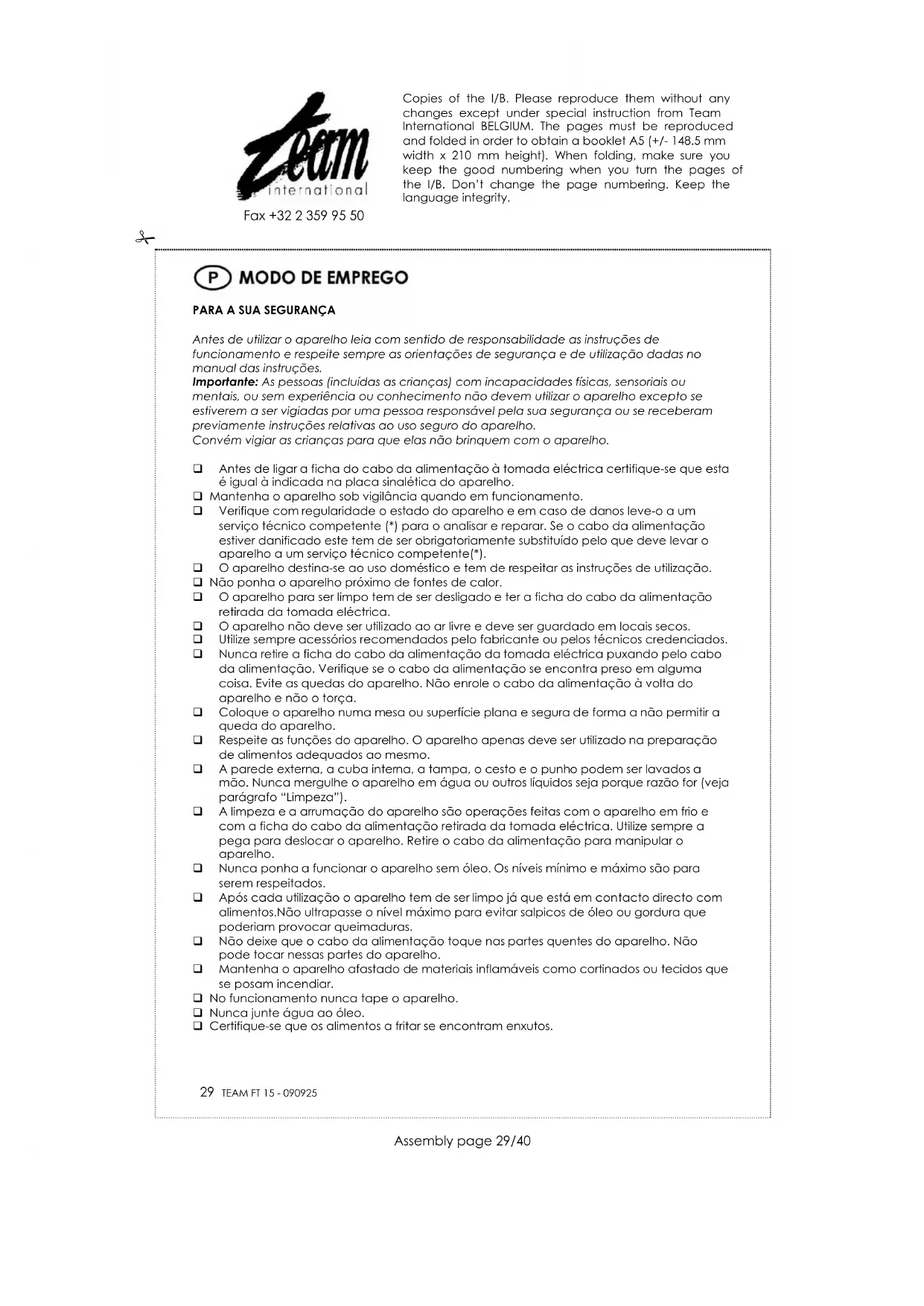Antes de utilizar o aparelho leia com sentido de responsabilidade as instruções de funcionamento e respeite sempre as orientações de segurança e de utilização dadas no manual das instruções. Importante: As pessoas (incluídas as crianças) com incapacidades físicas, sensoriais ou mentais, ou sem experiência ou conhecimento não devem utilizar o aparelho excepto se estiverem a ser vigiadas por uma pessoa responsável pela sua segurança ou se receberam previamente instruções relativas ao uso seguro do aparelho. Convém vigiar as crianças para que elas não brinquem com o aparelho. Antes de ligar a ficha do cabo da alimentação à tomada eléctrica certifique-se que esta é igual à indicada na placa sinalética do aparelho. Mantenha o aparelho sob vigilância quando em funcionamento. Verifique com regularidade o estado do aparelho e em caso de danos leve-o a um serviço técnico competente (*) para o analisar e reparar. Se o cabo da alimentação estiver danificado este tem de ser obrigatoriamente substituído pelo que deve levar o aparelho a um serviço técnico competente(*). O aparelho destina-se ao uso doméstico e tem de respeitar as instruções de utilização. Não ponha o aparelho próximo de fontes de calor. O aparelho para ser limpo tem de ser desligado e ter a ficha do cabo da alimentação retirada da tomada eléctrica. O aparelho não deve ser utilizado ao ar livre e deve ser guardado em locais secos. Utilize sempre acessórios recomendados pelo fabricante ou pelos técnicos credenciados. Nunca retire a ficha do cabo da alimentação da tomada eléctrica puxando pelo cabo da alimentação. Verifique se o cabo da alimentação se encontra preso em alguma coisa. Evite as quedas do aparelho. Não enrole o cabo da alimentação à volta do aparelho e não o torça. Coloque o aparelho numa mesa ou superfície plana e segura de forma a não permitir a queda do aparelho. Respeite as funções do aparelho. O aparelho apenas deve ser utilizado na preparação de alimentos adequados ao mesmo. A parede externa, a cuba interna, a tampa, o cesto e o punho podem ser lavados a mão. Nunca mergulhe o aparelho em água ou outros líquidos seja porque razão for (veja parágrafo “Limpeza”). A limpeza e a arrumação do aparelho são operações feitas com o aparelho em frio e com a ficha do cabo da alimentação retirada da tomada eléctrica. Utilize sempre a pega para deslocar o aparelho. Retire o cabo da alimentação para manipular o aparelho. Nunca ponha a funcionar o aparelho sem óleo. Os níveis mínimo e máximo são para serem respeitados. Após cada utilização o aparelho tem de ser limpo já que está em contacto directo com alimentos.Não ultrapasse o nível máximo para evitar salpicos de óleo ou gordura que poderiam provocar queimaduras. Não deixe que o cabo da alimentação toque nas partes quentes do aparelho. Não pode tocar nessas partes do aparelho. Mantenha o aparelho afastado de materiais inflamáveis como cortinados ou tecidos que se posam incendiar. No funcionamento nunca tape o aparelho. Nunca junte água ao óleo. Certifique-se que os alimentos a fritar se encontram enxutos. Copies of the I/B. Please reproduce them without any changes except under special instruction from Team International BELGIUM. The pages must be reproduced and folded in order to obtain a booklet A5 (+/- 148.5 mm width x 210 mm height). When folding, make sure you keep the good numbering when you turn the pages of the I/B. Don‟t change the page numbering. Keep the language integrity.