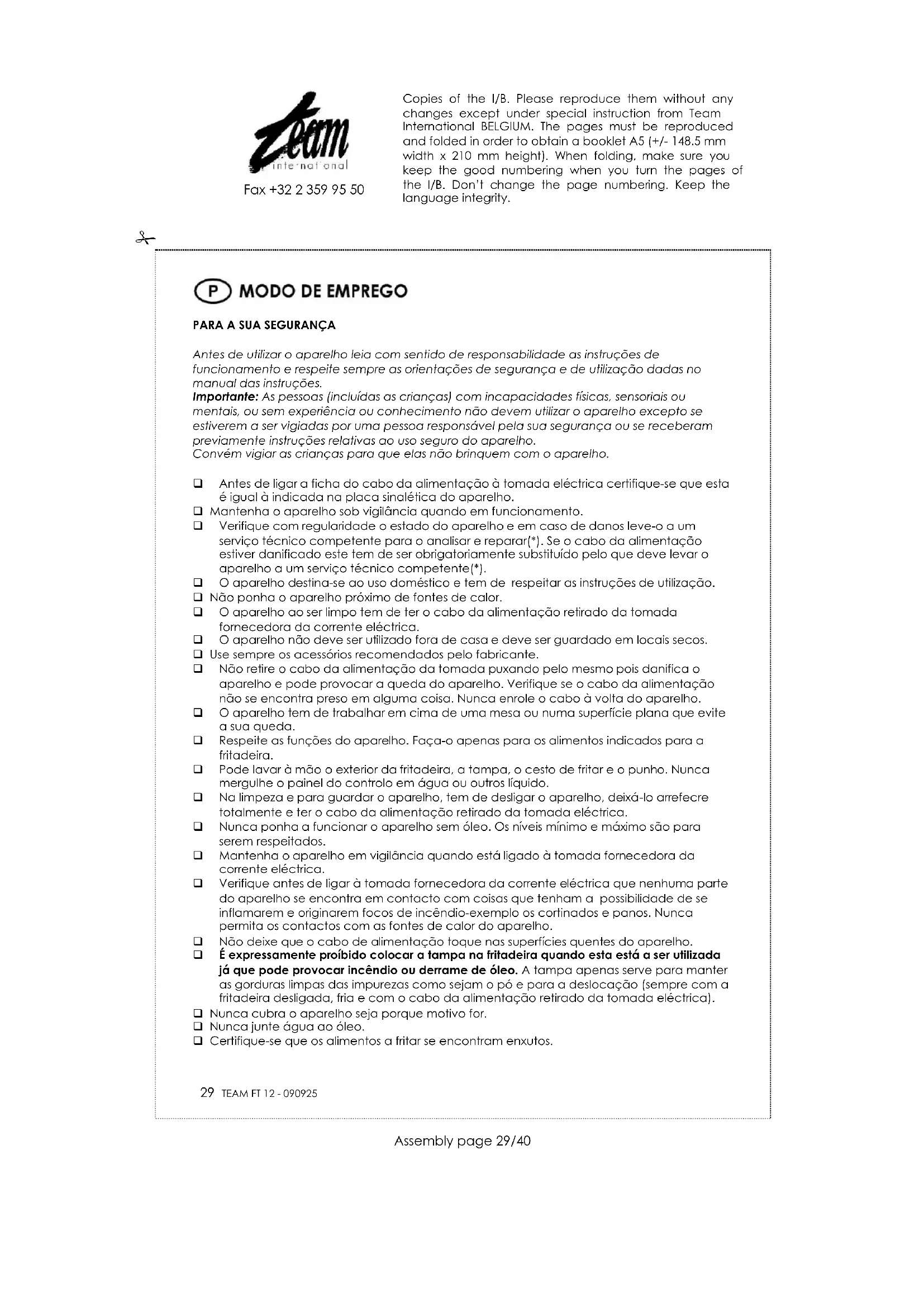 Antes de utilizar o aparelho leia com sentido de responsabilidade as instruções de funcionamento e respeite sempre as orientações de segurança e de utilização dadas no manual das instruções. Importante: As pessoas (incluídas as crianças) com incapacidades físicas, sensoriais ou mentais, ou sem experiência ou conhecimento não devem utilizar o aparelho excepto se estiverem a ser vigiadas por uma pessoa responsável pela sua segurança ou se receberam previamente instruções relativas ao uso seguro do aparelho. Convém vigiar as crianças para que elas não brinquem com o aparelho. Antes de ligar a ficha do cabo da alimentação à tomada eléctrica certifique-se que esta é igual à indicada na placa sinalética do aparelho. Mantenha o aparelho sob vigilância quando em funcionamento. Verifique com regularidade o estado do aparelho e em caso de danos leve-o a um serviço técnico competente para o analisar e reparar(*). Se o cabo da alimentação estiver danificado este tem de ser obrigatoriamente substituído pelo que deve levar o aparelho a um serviço técnico competente(*). O aparelho destina-se ao uso doméstico e tem de respeitar as instruções de utilização. Não ponha o aparelho próximo de fontes de calor. O aparelho ao ser limpo tem de ter o cabo da alimentação retirado da tomada fornecedora da corrente eléctrica. O aparelho não deve ser utilizado fora de casa e deve ser guardado em locais secos. Use sempre os acessórios recomendados pelo fabricante. Não retire o cabo da alimentação da tomada puxando pelo mesmo pois danifica o aparelho e pode provocar a queda do aparelho. Verifique se o cabo da alimentação não se encontra preso em alguma coisa. Nunca enrole o cabo à volta do aparelho. O aparelho tem de trabalhar em cima de uma mesa ou numa superfície plana que evite a sua queda. Respeite as funções do aparelho. Faça-o apenas para os alimentos indicados para a fritadeira. Pode lavar à mão o exterior da fritadeira, a tampa, o cesto de fritar e o punho. Nunca mergulhe o painel do controlo em água ou outros líquido. Na limpeza e para guardar o aparelho, tem de desligar o aparelho, deixá-lo arrefecre totalmente e ter o cabo da alimentação retirado da tomada eléctrica. Nunca ponha a funcionar o aparelho sem óleo. Os níveis mínimo e máximo são para serem respeitados. Mantenha o aparelho em vigilância quando está ligado à tomada fornecedora da corrente eléctrica. Verifique antes de ligar à tomada fornecedora da corrente eléctrica que nenhuma parte do aparelho se encontra em contacto com coisas que tenham a possibilidade de se inflamarem e originarem focos de incêndio-exemplo os cortinados e panos. Nunca permita os contactos com as fontes de calor do aparelho. Não deixe que o cabo de alimentação toque nas superfícies quentes do aparelho. É expressamente proíbido colocar a tampa na fritadeira quando esta está a ser utilizada já que pode provocar incêndio ou derrame de óleo. A tampa apenas serve para manter as gorduras limpas das impurezas como sejam o pó e para a deslocação (sempre com a fritadeira desligada, fria e com o cabo da alimentação retirado da tomada eléctrica). Nunca cubra o aparelho seja porque motivo for. Nunca junte água ao óleo. Certifique-se que os alimentos a fritar se encontram enxutos. Copies of the I/B. Please reproduce them without any changes except under special instruction from Team International BELGIUM. The pages must be reproduced and folded in order to obtain a booklet A5 (+/- 148.5 mm width x 210 mm height). When folding, make sure you keep the good numbering when you turn the pages of the I/B. Don‟t change the page numbering. Keep the language integrity.