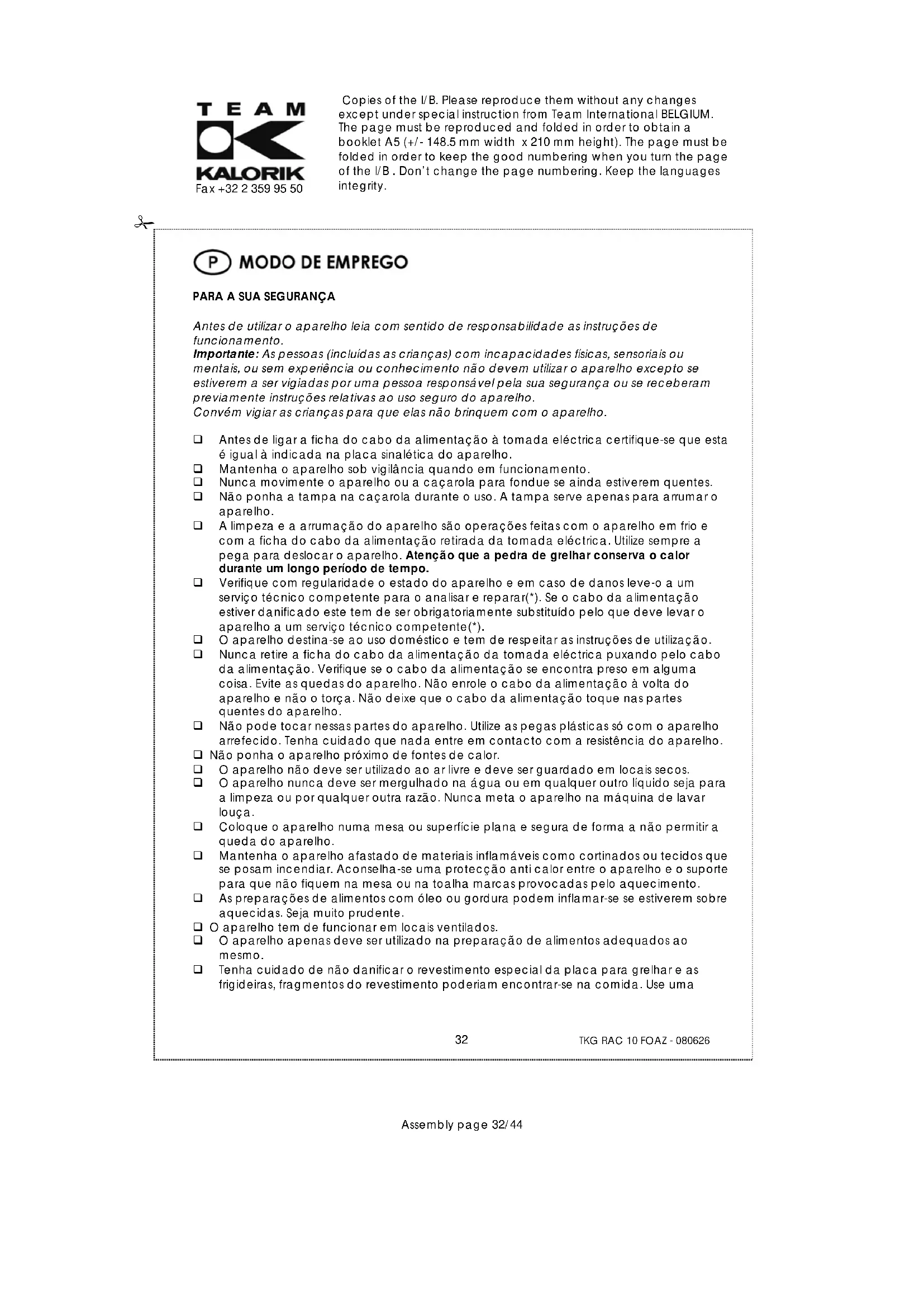 Antes de utilizar o aparelho leia com sentido de responsabilidade as instruções de funcionamento. Importante: As pessoas (incluídas as crianças) com incapacidades físicas, sensoriais ou mentais, ou sem experiência ou conhecimento não devem utilizar o aparelho excepto se estiverem a ser vigiadas por uma pessoa responsável pela sua segurança ou se receberam previamente instruções relativas ao uso seguro do aparelho. Convém vigiar as crianças para que elas não brinquem com o aparelho. Antes de ligar a ficha do cabo da alimentação à tomada eléctrica certifique-se que esta é igual à indicada na placa sinalética do aparelho. Mantenha o aparelho sob vigilância quando em funcionamento. Nunca movimente o aparelho ou a caçarola para fondue se ainda estiverem quentes. Não ponha a tampa na caçarola durante o uso. A tampa serve apenas para arrumar o aparelho. A limpeza e a arrumação do aparelho são operações feitas com o aparelho em frio e com a ficha do cabo da alimentação retirada da tomada eléctrica. Utilize sempre a pega para deslocar o aparelho. Atenção que a pedra de grelhar conserva o calor durante um longo período de tempo. Verifique com regularidade o estado do aparelho e em caso de danos leve-o a um serviço técnico competente para o analisar e reparar(*). Se o cabo da alimentação estiver danificado este tem de ser obrigatoriamente substituído pelo que deve levar o aparelho a um serviço técnico competente(*). O aparelho destina-se ao uso doméstico e tem de respeitar as instruções de utilização. Nunca retire a ficha do cabo da alimentação da tomada eléctrica puxando pelo cabo da alimentação. Verifique se o cabo da alimentação se encontra preso em alguma coisa. Evite as quedas do aparelho. Não enrole o cabo da alimentação à volta do aparelho e não o torça. Não deixe que o cabo da alimentação toque nas partes quentes do aparelho. Não pode tocar nessas partes do aparelho. Utilize as pegas plásticas só com o aparelho arrefecido. Tenha cuidado que nada entre em contacto com a resistência do aparelho. Não ponha o aparelho próximo de fontes de calor. O aparelho não deve ser utilizado ao ar livre e deve ser guardado em locais secos. O aparelho nunca deve ser mergulhado na água ou em qualquer outro líquido seja para a limpeza ou por qualquer outra razão. Nunca meta o aparelho na máquina de lavar louça. Coloque o aparelho numa mesa ou superfície plana e segura de forma a não permitir a queda do aparelho. Mantenha o aparelho afastado de materiais inflamáveis como cortinados ou tecidos que se posam incendiar. Aconselha-se uma protecção anti calor entre o aparelho e o suporte para que não fiquem na mesa ou na toalha marcas provocadas pelo aquecimento. As preparações de alimentos com óleo ou gordura podem inflamar-se se estiverem sobre aquecidas. Seja muito prudente. O aparelho tem de funcionar em locais ventilados. O aparelho apenas deve ser utilizado na preparação de alimentos adequados ao mesmo. Tenha cuidado de não danificar o revestimento especial da placa para grelhar e as frigideiras, fragmentos do revestimento poderiam encontrar-se na comida. Use uma