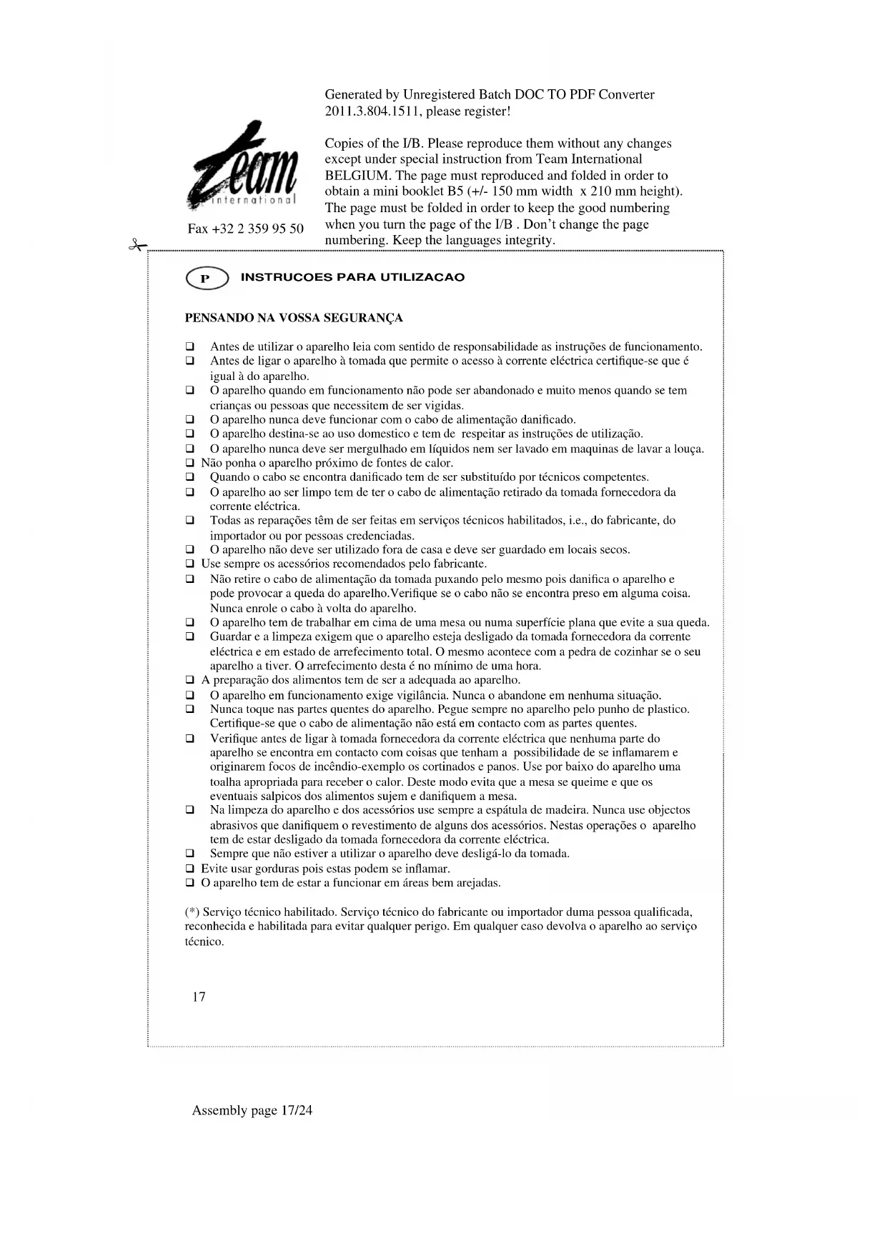 - Todas as reparacoes tem de ser feitas em serviços Tecnicos habilidos, i.e., do fabricante, do importador ou por pessoas credenciadas.