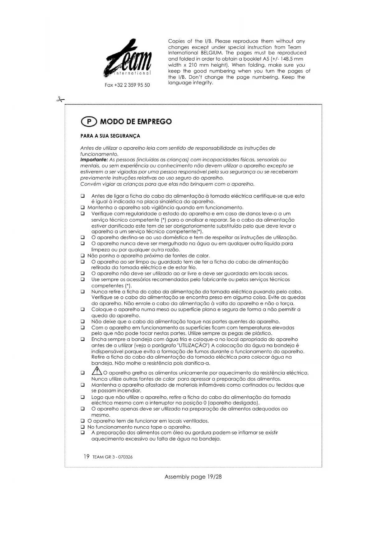 Fax +32 2 359 95 50 EVITE QUEIMADURAS. MANTENHA O CABO DA ALIMENTAÇÃO AFASTADO DA RESISTÊNCIA. - Retire a gordura da bandeja. - Volte a colocar as várias peças procedendo no modo inverso. LIMPEZA Antes de limpar o aparelho, coloque o interruptor ligado/desligado na posição 0 e retire a ficha do cabo da alimentação da tomada eléctrica. Deixe o aparelho arrefecer antes de o limpar, retire a grelha dos alimentos, a bandeja e despeje o resto da água. Limpe o suporte do aparelho, a grelha e a bandeja com água quente em sabonária, passe-os por água e seque-os. ATENÇÃO: A RESISTÊNCIA E O PAINEL DE CONTROLO NÃO DEVEM SER MOLHADOS DURANTE ESTAS OPERAÇÕES. Limpe a superfícies exteriores do grelhador com um pano macio ligeiramente humedecido. PROTECÇÃO DO MEIO AMBIENTE – DIRECTIVA 2002/96/CE Para a preservação do ambiente e da nossa saúde, a eliminação no fim da vida útil dos aparelhos eléctricos e electrónicos, deve-se efectuar no cumprimento das legislações em vigor e pela participação de todos quer sejam produtores ou utilizadores. É por esta razão que o vosso aparelho tem na placa sinalética o símbolo , informando que em caso algum o aparelho deve ser colocado no caixote do lixo camarário ou privado para que não vá para as lixeiras comuns mas sim devolvido ao revendedor ou depositado nos locais apropriados e identificados para a recolha destes aparelhos para que uma vez recolhidos sejam reciclados, reutilizados ou lhe sejam dados outras aplicações. Copies of the I/B. Please reproduce them without any changes except under special instruction from Team International BELGIUM. The pages must be reproduced and folded in order to obtain a booklet A5 (+/- 148.5 mm width x 210 mm height). When folding, make sure you keep the good numbering when you turn the pages of the I/B. Don’t change the page numbering. Keep the language integrity.