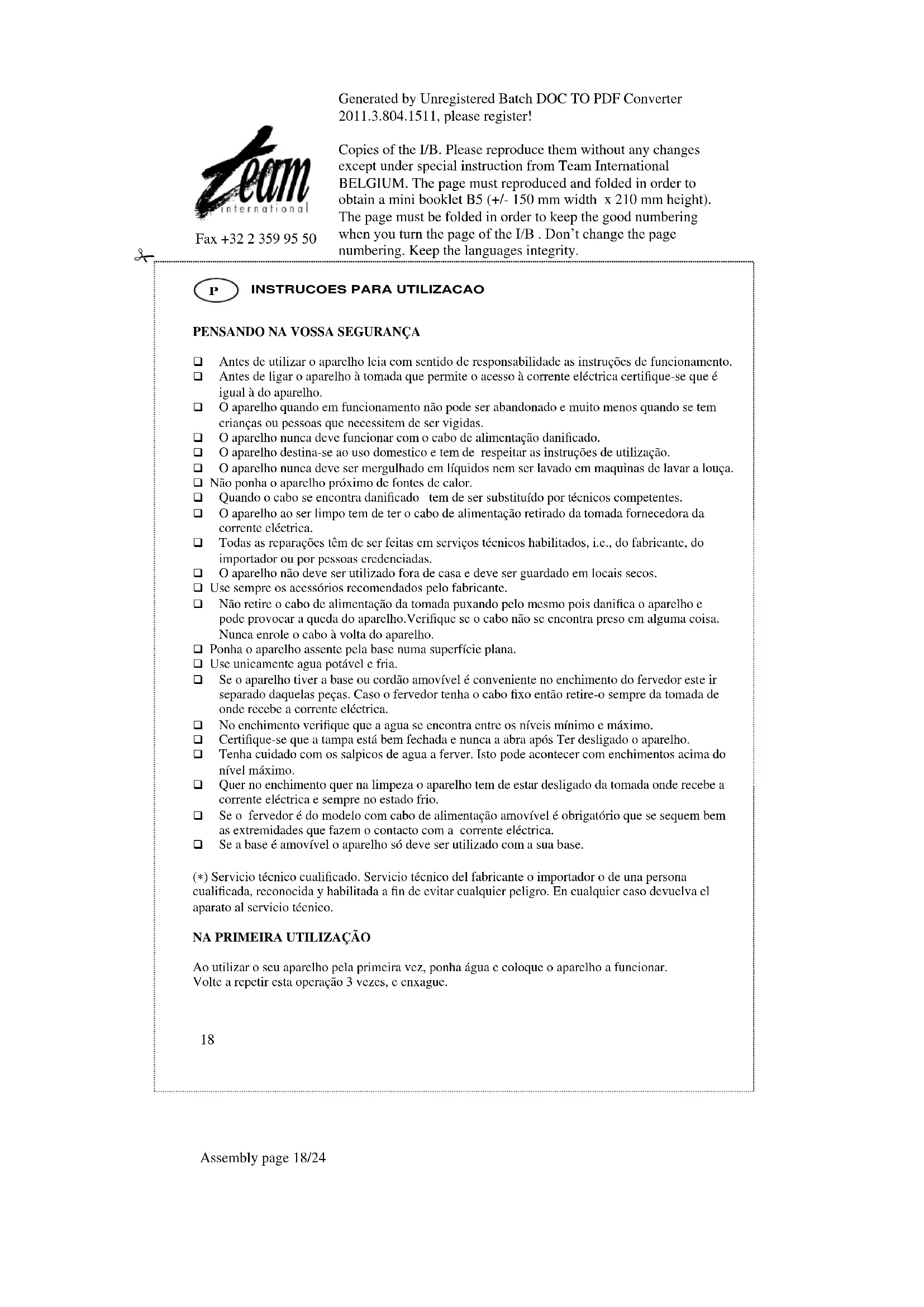 Este aparelho está equipado com um sistema de protecção a sobreaquecimento, que desliga o aparelho automaticame-te caso este seja ligado acidentalmente. Se isto acontecer, desligue a ficha da corrente, espere 10 minutos, antes de encher a chaleira, afim de desligar o sistema de protecção. LIMPEZA Desligue a chaleira antes de a limpar, e deixe-a arrefecer. Limpe-a com um esfregão suave, e retire os depósitos de calcário das paredes interiores. Não utilize produtos abrasivos. Nunca meta a chaleira dentro de agua. FILTRO O aparelho tenha o filtro. É importante que o filtro esteja bem colocado. A limpeza do filtro tem de ser feita regularmente. DESCALCIFICAÇÃO Para suprimir os depósitos de calcário eventuais, utilizes um descalcificante apropriado, seguindo as suas instruções.Generated by Unregistered Batch DOC TO PDF Converter 2011.3.804.1511, please register! Copies of the I/B. Please reproduce them without any changes except under special instruction from Team International BELGIUM. The page must reproduced and folded in order to obtain a mini booklet B5 (+/- 150 mm width x 210 mm height). The page must be folded in order to keep the good numbering when you turn the page of the I/B . Don’t change the page numbering. Keep the languages integrity.