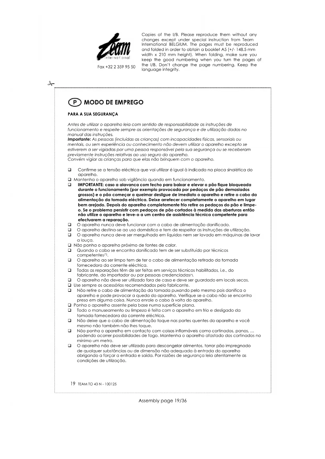 O aparelho não deve ser utilizado fora de casa e deve ser guardado em locais secos. Use sempre os acessórios recomendados pelo fabricante. Não retire o cabo de alimentação da tomada puxando pelo mesmo pois danifica o aparelho e pode provocar a queda do aparelho. Verifique se o cabo não se encontra preso em alguma coisa. Nunca enrole o cabo à volta do aparelho. Ponha o aparelho assente pela base numa superfície plana. Todo o manuseamento ou limpeza é feita com o aparelho em frio e desligado da tomada fornecedora da corrente eléctrica. Não deixe que o cabo de alimentação toque nas partes quentes do aparelho e você mesmo não também não lhes toque. Não ponha o aparelho em contacto com coisas inflamáveis como cortinados, panos, … podendo ocorrer possibilidades de fogo. Mantenha o aparelho afastado dos cortinados no mínimo um metro. O aparelho não deve ser utilizado para descongelar alimentos, torrar pão impregnado de qualquer substâncias ou de dimensão não adequada à entrada do aparelho obrigando a forçar a entrada e saida. Por razões de segurança leia atentamente as condições de utilização. Copies of the I/B. Please reproduce them without any changes except under special instruction from Team International BELGIUM. The pages must be reproduced and folded in order to obtain a booklet A5 (+/- 148.5 mm width x 210 mm height). When folding, make sure you keep the good numbering when you turn the pages of the I/B. Don’t change the page numbering. Keep the language integrity.