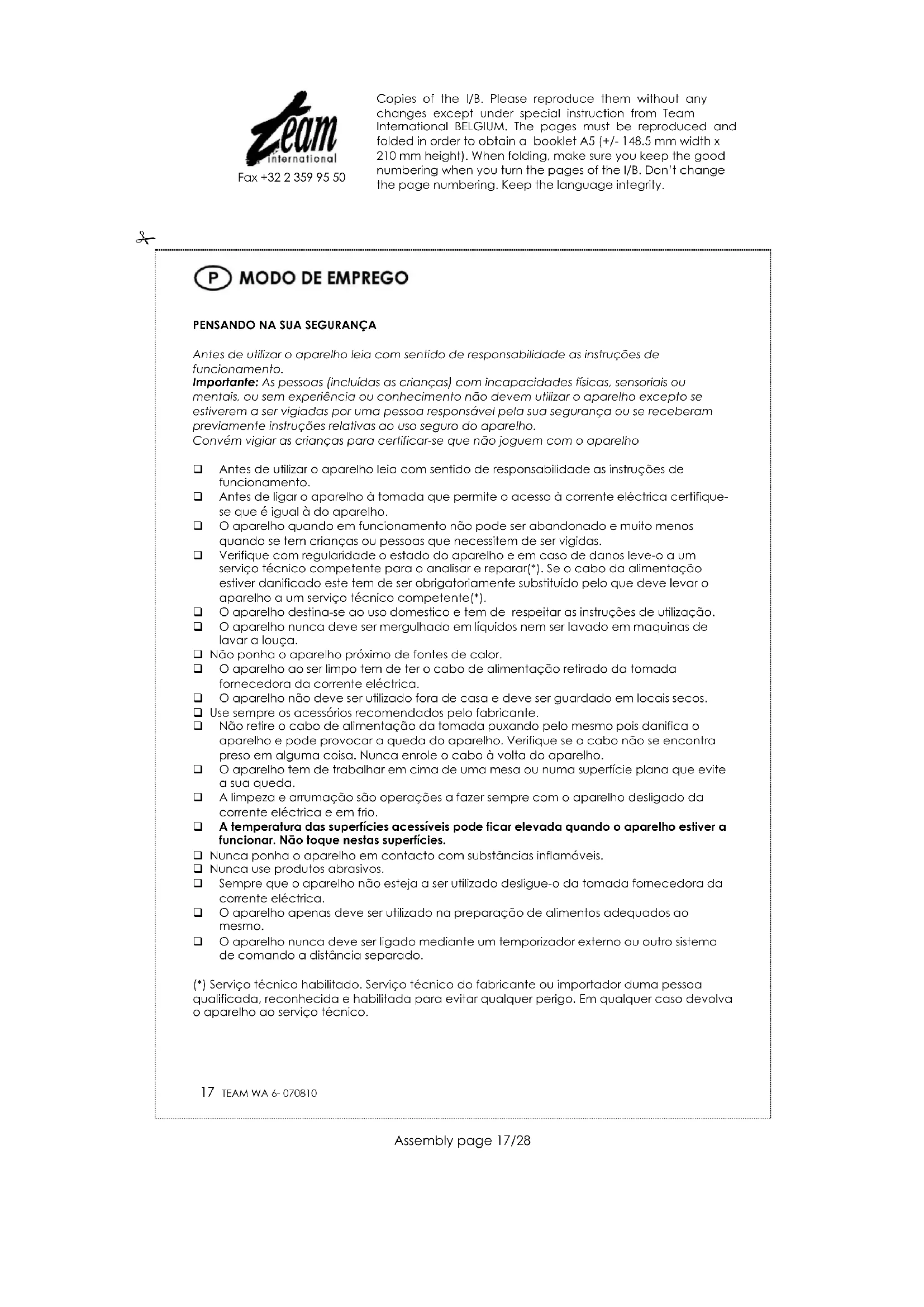 Antes de utilizar o aparelho leia com sentido de responsabilidade as instruções de funcionamento. Importante: As pessoas (incluídas as crianças) com incapacidades físicas, sensoriais ou mentais, ou sem experiência ou conhecimento não devem utilizar o aparelho excepto se estiverem a ser vigiadas por uma pessoa responsável pela sua segurança ou se receberam previamente instruções relativas ao uso seguro do aparelho. Convém vigiar as crianças para certificar-se que não joguem com o aparelho Antes de utilizar o aparelho leia com sentido de responsabilidade as instruções de funcionamento. Antes de ligar o aparelho à tomada que permite o acesso à corrente eléctrica certifique- se que é igual à do aparelho. O aparelho quando em funcionamento não pode ser abandonado e muito menos quando se tem crianças ou pessoas que necessitem de ser vigidas. Verifique com regularidade o estado do aparelho e em caso de danos leve-o a um serviço técnico competente para o analisar e reparar(*). Se o cabo da alimentação estiver danificado este tem de ser obrigatoriamente substituído pelo que deve levar o aparelho a um serviço técnico competente(*). O aparelho destina-se ao uso domestico e tem de respeitar as instruções de utilização. O aparelho nunca deve ser mergulhado em líquidos nem ser lavado em maquinas de lavar a louça. Não ponha o aparelho próximo de fontes de calor. O aparelho ao ser limpo tem de ter o cabo de alimentação retirado da tomada fornecedora da corrente eléctrica. O aparelho não deve ser utilizado fora de casa e deve ser guardado em locais secos. Use sempre os acessórios recomendados pelo fabricante. Não retire o cabo de alimentação da tomada puxando pelo mesmo pois danifica o aparelho e pode provocar a queda do aparelho. Verifique se o cabo não se encontra preso em alguma coisa. Nunca enrole o cabo à volta do aparelho. O aparelho tem de trabalhar em cima de uma mesa ou numa superfície plana que evite a sua queda. A limpeza e arrumação são operações a fazer sempre com o aparelho desligado da corrente eléctrica e em frio. A temperatura das superfícies acessíveis pode ficar elevada quando o aparelho estiver a funcionar. Não toque nestas superfícies. Nunca ponha o aparelho em contacto com substâncias inflamáveis. Nunca use produtos abrasivos. Sempre que o aparelho não esteja a ser utilizado desligue-o da tomada fornecedora da corrente eléctrica. O aparelho apenas deve ser utilizado na preparação de alimentos adequados ao mesmo. O aparelho nunca deve ser ligado mediante um temporizador externo ou outro sistema de comando a distância separado. (*) Serviço técnico habilitado. Serviço técnico do fabricante ou importador duma pessoa qualificada, reconhecida e habilitada para evitar qualquer perigo. Em qualquer caso devolva o aparelho ao serviço técnico. Copies of the I/B. Please reproduce them without any changes except under special instruction from Team International BELGIUM. The pages must be reproduced and folded in order to obtain a booklet A5 (+/- 148.5 mm width x 210 mm height). When folding, make sure you keep the good numbering when you turn the pages of the I/B. Don’t change the page numbering. Keep the language integrity.