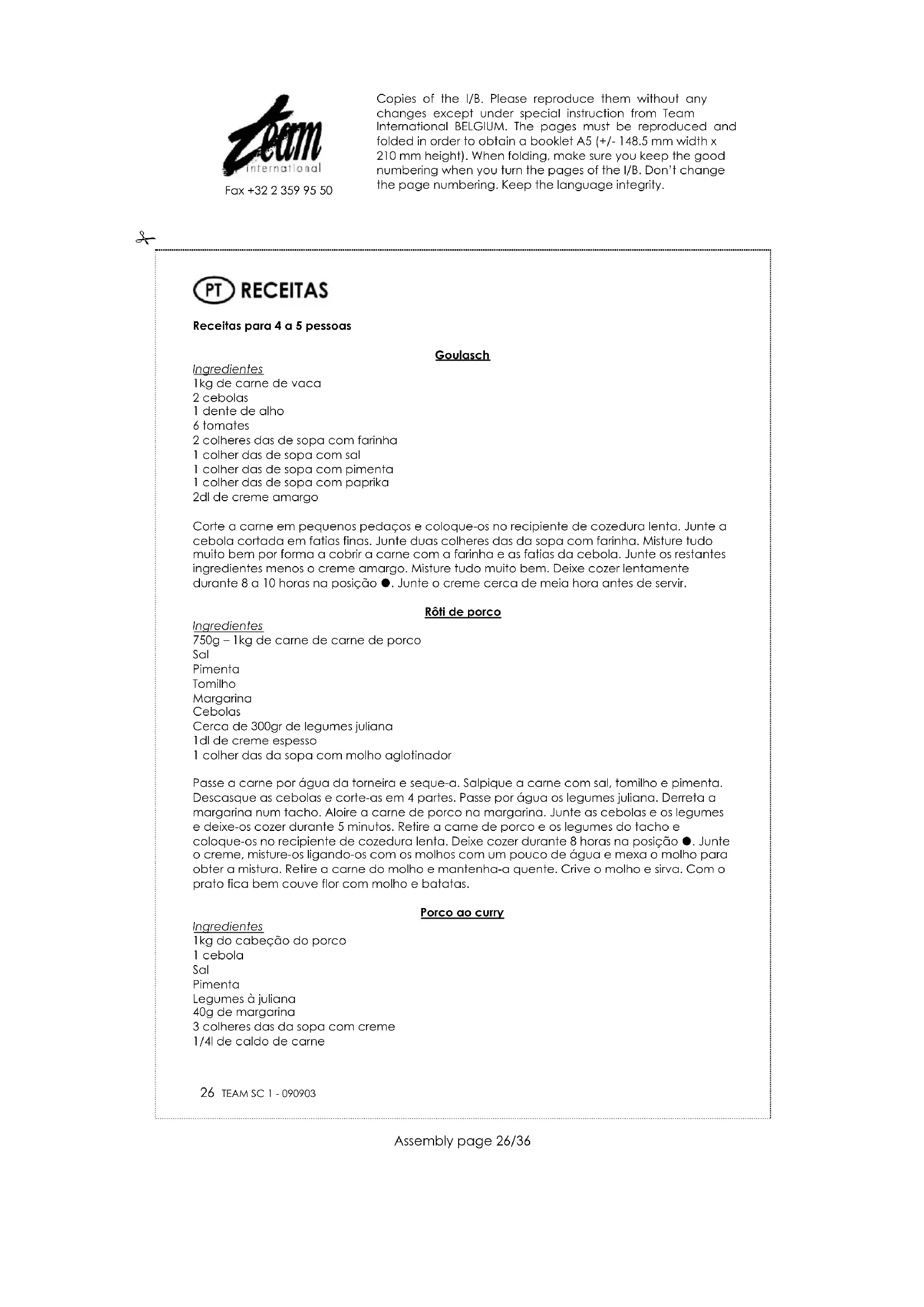 Lave a carne e seque-a. Salpique-a com sal, com pimenta e com curry. Derreta a margarina numa frigideira e aloire a carne na margarina. Junte as cebolas cortadas em fatias. Lave os legumes juliana e coloque-os no recipiente de cozedura lenta. Junte as cebolas e a carne aloirada. Deixe cozer durante 8 horas na posição . Retire a carne do recipiente. Guarde o molho da carne no recipiente. Junte a raspa do limão, o sumo do ananás, o sumo do limão, o açúcar, o curry unindo tudo com o molho e 3 colheres das da sopa com creme e misture tudo até à obtenção de um molho espesso. Crive o molho. Aloire os pedaços de ananás na manteiga. Sirva a carne e o ananás com arroz e junte o molho a gosto. Carne de vaca à Bourguignon Ingredientes 750g - 1kg de carne de vaca Sal Pimenta Paprika Alho em pó 50 g de tiras de toucinho 1 copo de Bourgogne 1 de 250g cogumelos Cebolinho Passe a carne por água e seque-a. Salpique-a com sal, com paprika e alho em pó e mete-a no recipiente de cozedura lenta. Junte as tiras de toucinho. Tampe e deixe cozer lentamente durante 6 a 8 horas na posição . Junte os cogumelos e o vinho uma hora antes de terminar a cozedura. Junte o molho de ligação para engrossar e decore com cebolinho antes de servir. Pode acompanhar com tagliatelles ou batatas. Stroganov de carne de vaca Ingredientes 50 gr de margarina 300 g de cebolas 250 g de cogumelos 1 pitada de sal 1 colher das de café com açúcar 1 colher das de sopa com mostarda Pimenta negra 750 gr de carne de vaca ¼ l de creme agre Derreta a margarina numa frigideira. Junto as fatias de cebola e os cogumelos cortados em finas fatias. Deixe cozer durante cerca de 5 minutos. Misture o sal, o açúcar, a mostarda e a pimenta misturando tudo na frigideira. Corte o bocado inteiro da carne de vaca em fatias de 1 cm de espessura e com 5 cm de comprimento. Ponha a carne e os legumes no recipiente de cozedura lenta e deixe cozer durante cerca de 6 a 8 horas na posição . Junte o creme antes de servir. Copies of the I/B. Please reproduce them without any changes except under special instruction from Team International BELGIUM. The pages must be reproduced and folded in order to obtain a booklet A5 (+/- 148.5 mm width x 210 mm height). When folding, make sure you keep the good numbering when you turn the pages of the I/B. Don’t change the page numbering. Keep the language integrity.
