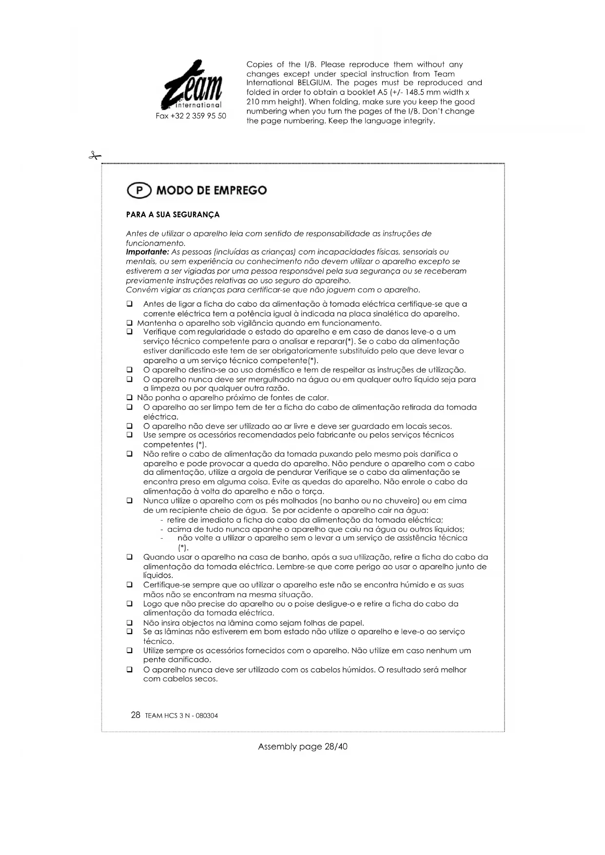 Quando usar o aparelho na casa de banho, após a sua utilização, retire a ficha do cabo da alimentação da tomada eléctrica. Lembre-se que corre perigo ao usar o aparelho junto de líquidos. Certifique-se sempre que ao utilizar o aparelho este não se encontra húmido e as suas mãos não se encontram na mesma situação. Logo que não precise do aparelho ou o poise desligue-o e retire a ficha do cabo da alimentação da tomada eléctrica. Não insira objectos na lâmina como sejam folhas de papel. Se as lâminas não estiverem em bom estado não utilize o aparelho e leve-o ao serviço técnico. Utilize sempre os acessórios fornecidos com o aparelho. Não utilize em caso nenhum um pente danificado. O aparelho nunca deve ser utilizado com os cabelos húmidos. O resultado será melhor com cabelos secos. Copies of the I/B. Please reproduce them without any changes except under special instruction from Team International BELGIUM. The pages must be reproduced and folded in order to obtain a booklet A5 (+/- 148.5 mm width x 210 mm height). When folding, make sure you keep the good numbering when you turn the pages of the I/B. Don’t change the page numbering. Keep the language integrity.