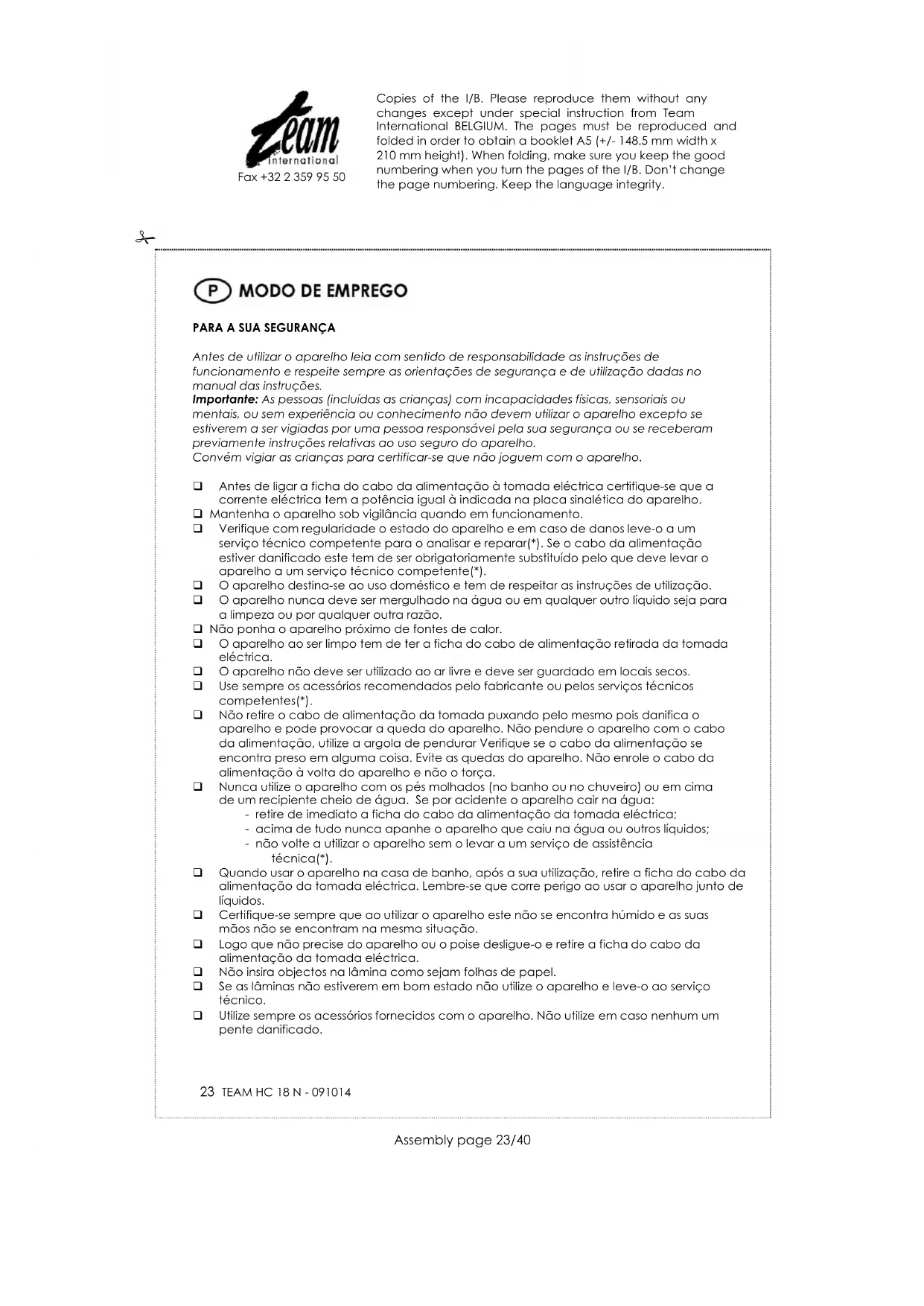 Fax +32 2 359 95 50 que o vosso aparelho tem na placa sinalética o símbolo , informando que em caso algum o aparelho deve ser colocado no caixote do lixo camarário ou privado para que não vá para as lixeiras comuns mas sim devolvido ao revendedor ou depositado nos locais apropriados e identificados para a recolha destes aparelhos para que uma vez recolhidos sejam reciclados, reutilizados ou lhe sejam dados outras aplicações. Copies of the I/B. Please reproduce them without any changes except under special instruction from Team International BELGIUM. The pages must be reproduced and folded in order to obtain a booklet A5 (+/- 148.5 mm width x 210 mm height). When folding, make sure you keep the good numbering when you turn the pages of the I/B. Don’t change the page numbering. Keep the language integrity.