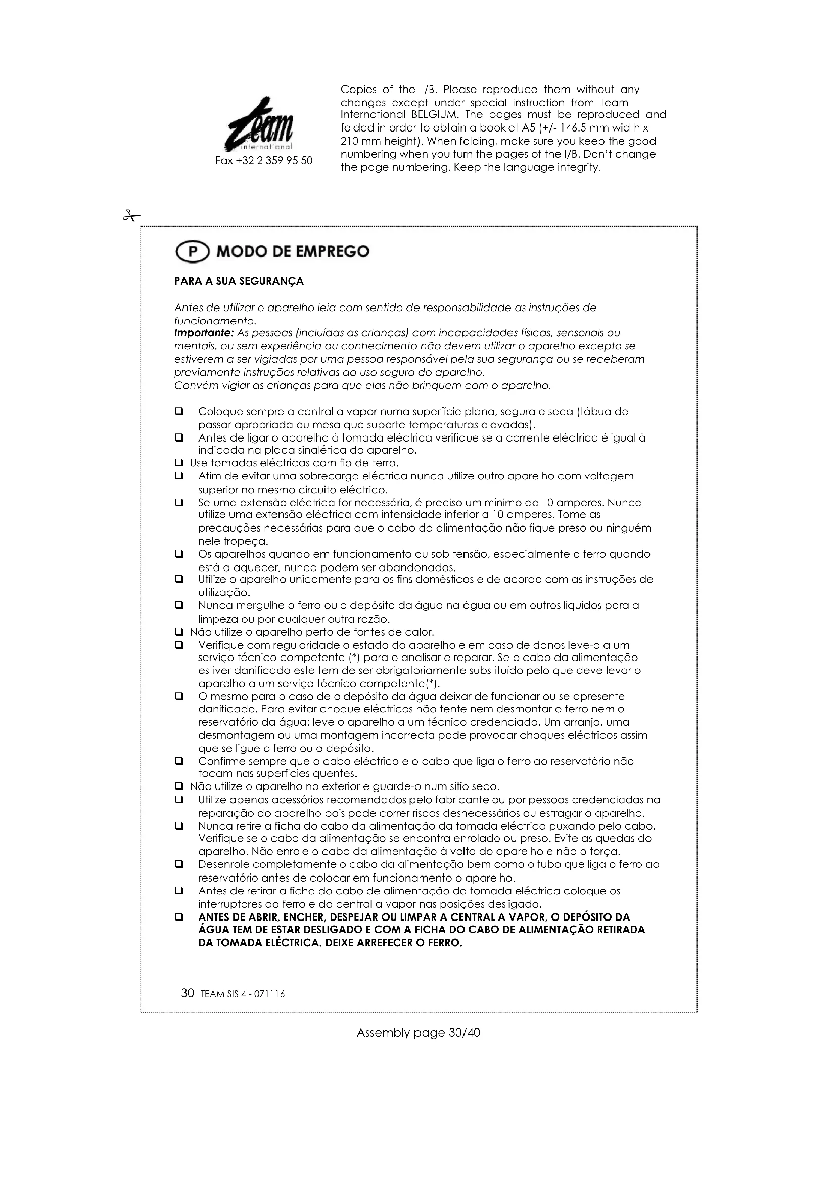Antes de utilizar o aparelho leia com sentido de responsabilidade as instruções de funcionamento. Importante: As pessoas (incluídas as crianças) com incapacidades físicas, sensoriais ou mentais, ou sem experiência ou conhecimento não devem utilizar o aparelho excepto se estiverem a ser vigiadas por uma pessoa responsável pela sua segurança ou se receberam previamente instruções relativas ao uso seguro do aparelho. Convém vigiar as crianças para que elas não brinquem com o aparelho. Coloque sempre a central a vapor numa superfície plana, segura e seca (tábua de passar apropriada ou mesa que suporte temperaturas elevadas). Antes de ligar o aparelho à tomada eléctrica verifique se a corrente eléctrica é igual à indicada na placa sinalética do aparelho. Use tomadas eléctricas com fio de terra. Afim de evitar uma sobrecarga eléctrica nunca utilize outro aparelho com voltagem superior no mesmo circuito eléctrico. Se uma extensão eléctrica for necessária, é preciso um mínimo de 10 amperes. Nunca utilize uma extensão eléctrica com intensidade inferior a 10 amperes. Tome as precauções necessárias para que o cabo da alimentação não fique preso ou ninguém nele tropeça. Os aparelhos quando em funcionamento ou sob tensão, especialmente o ferro quando está a aquecer, nunca podem ser abandonados. Utilize o aparelho unicamente para os fins domésticos e de acordo com as instruções de utilização. Nunca mergulhe o ferro ou o depósito da água na água ou em outros líquidos para a limpeza ou por qualquer outra razão. Não utilize o aparelho perto de fontes de calor. Verifique com regularidade o estado do aparelho e em caso de danos leve-o a um serviço técnico competente (*) para o analisar e reparar. Se o cabo da alimentação estiver danificado este tem de ser obrigatoriamente substituído pelo que deve levar o aparelho a um serviço técnico competente(*). O mesmo para o caso de o depósito da água deixar de funcionar ou se apresente danificado. Para evitar choque eléctricos não tente nem desmontar o ferro nem o reservatório da água: leve o aparelho a um técnico credenciado. Um arranjo, uma desmontagem ou uma montagem incorrecta pode provocar choques eléctricos assim que se ligue o ferro ou o depósito. Confirme sempre que o cabo eléctrico e o cabo que liga o ferro ao reservatório não tocam nas superfícies quentes. Não utilize o aparelho no exterior e guarde-o num sítio seco. Utilize apenas acessórios recomendados pelo fabricante ou por pessoas credenciadas na reparação do aparelho pois pode correr riscos desnecessários ou estragar o aparelho. Nunca retire a ficha do cabo da alimentação da tomada eléctrica puxando pelo cabo. Verifique se o cabo da alimentação se encontra enrolado ou preso. Evite as quedas do aparelho. Não enrole o cabo da alimentação à volta do aparelho e não o torça. Desenrole completamente o cabo da alimentação bem como o tubo que liga o ferro ao reservatório antes de colocar em funcionamento o aparelho. Antes de retirar a ficha do cabo de alimentação da tomada eléctrica coloque os interruptores do ferro e da central a vapor nas posições desligado. ANTES DE ABRIR, ENCHER, DESPEJAR OU LIMPAR A CENTRAL A VAPOR, O DEPÓSITO DA ÁGUA TEM DE ESTAR DESLIGADO E COM A FICHA DO CABO DE ALIMENTAÇÃO RETIRADA DA TOMADA ELÉCTRICA. DEIXE ARREFECER O FERRO. Copies of the I/B. Please reproduce them without any changes except under special instruction from Team International BELGIUM. The pages must be reproduced and folded in order to obtain a booklet A5 (+/- 146.5 mm width x 210 mm height). When folding, make sure you keep the good numbering when you turn the pages of the I/B. Don‟t change the page numbering. Keep the language integrity.