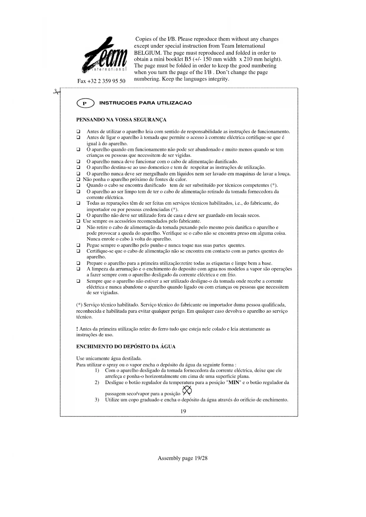 O spray humidifica a roupa ajundando a desfazer os fincos. O spray pode ser utilizado em qualquer temperatura escolhida com ou sem vapor. ! Leia atentamente a etiqueta do vestuário antes de passar. Alguns tecidos danificam-se em contacto com o vapor ou água. DOBRO VAPOR Usa-se em tecidos mais dificeis de passar ou vincos mais pronunciados. LIMPEZA A limpeza do interior faz-se deslocando o botäo SECOR/VAPOR para a posiçäo “ ”. Mantenha o ferro na horizontal e na posiçäo de máximo vapor faça sair todo o vapor. Quando o botão regulador do vapor está na posição , levanta-se devaguar e pode-se tirá-lo. Isto não põe nenhum problema. Faça com que o botão esteja na posição inicial antes duma nova utilização do aparelho. Pela esta razão, só está necessário pregá-lo (na posição correcta) e virá-lo no sentido do ponteiro do relógio. CUIDADOS A TER QUANDO TERMINA A PASSAGEM A FERRO Rode o botão da temperatura para a posição "MIN" e desligue o cabo de alimentação da tomada fornecedora da corrente eléctrica. Vire o ferro com cuidado por forma a não se queimar na base e deixe saír a água do depósito. Pouse o ferro na vertical assente pela trazeira e deixe que ele arrefeça.Copies of the I/B. Please reproduce them without any changes except under special instruction from Team International BELGIUM. The page must reproduced and folded in order to obtain a mini booklet B5 (+/- 150 mm width x 210 mm height). The page must be folded in order to keep the good numbering when you turn the page of the I/B . Don‟t change the page numbering. Keep the languages integrity.