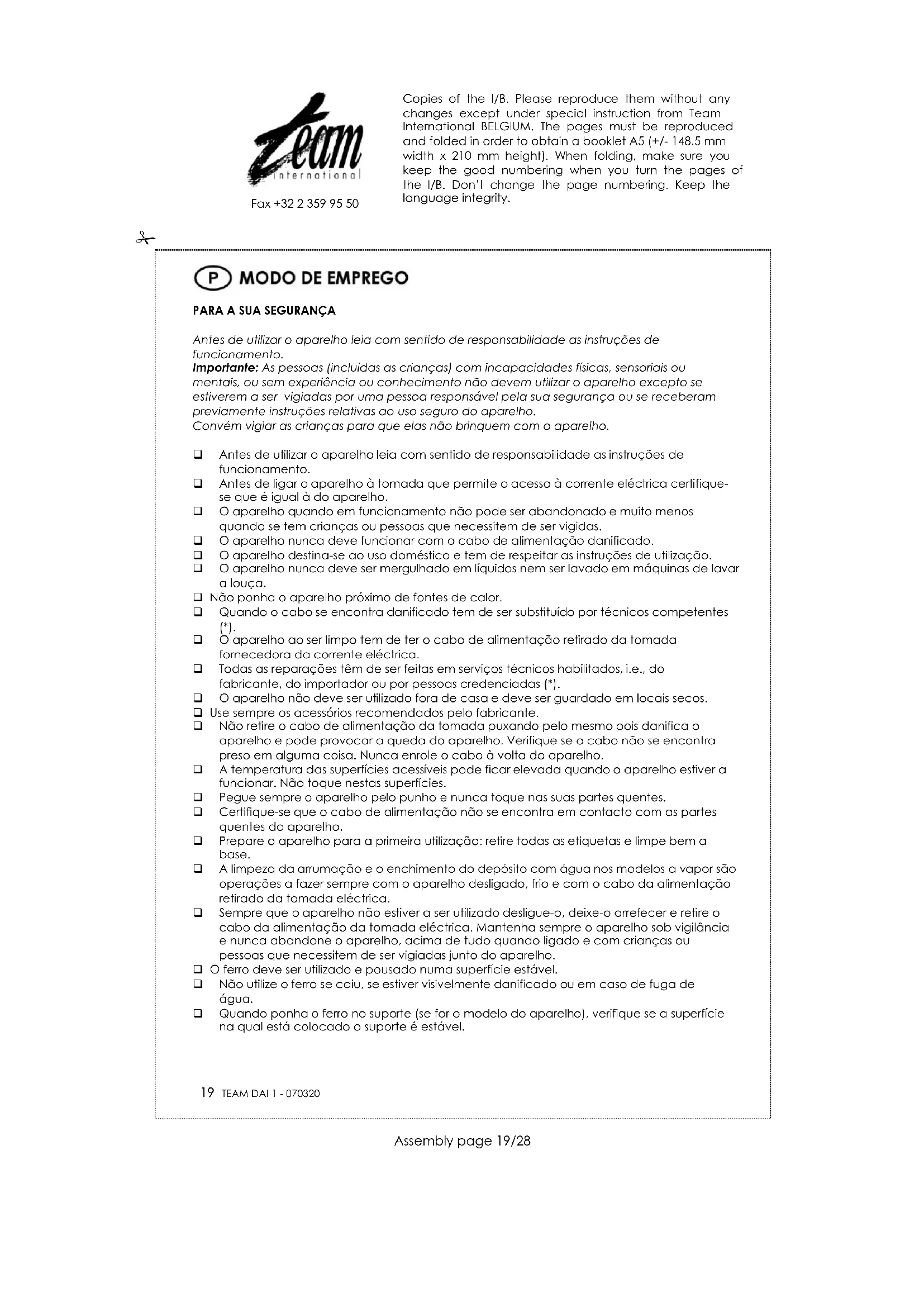 O aparelho ao ser limpo tem de ter o cabo de alimentação retirado da tomada fornecedora da corrente eléctrica. Todas as reparações têm de ser feitas em serviços técnicos habilitados, i.e., do fabricante, do importador ou por pessoas credenciadas (*). O aparelho não deve ser utilizado fora de casa e deve ser guardado em locais secos. Use sempre os acessórios recomendados pelo fabricante. Não retire o cabo de alimentação da tomada puxando pelo mesmo pois danifica o aparelho e pode provocar a queda do aparelho. Verifique se o cabo não se encontra preso em alguma coisa. Nunca enrole o cabo à volta do aparelho. A temperatura das superfícies acessíveis pode ficar elevada quando o aparelho estiver a funcionar. Não toque nestas superfícies. Pegue sempre o aparelho pelo punho e nunca toque nas suas partes quentes. Certifique-se que o cabo de alimentação não se encontra em contacto com as partes quentes do aparelho. Prepare o aparelho para a primeira utilização: retire todas as etiquetas e limpe bem a base. A limpeza da arrumação e o enchimento do depósito com água nos modelos a vapor são operações a fazer sempre com o aparelho desligado, frio e com o cabo da alimentação retirado da tomada eléctrica. Sempre que o aparelho não estiver a ser utilizado desligue-o, deixe-o arrefecer e retire o cabo da alimentação da tomada eléctrica. Mantenha sempre o aparelho sob vigilância e nunca abandone o aparelho, acima de tudo quando ligado e com crianças ou pessoas que necessitem de ser vigiadas junto do aparelho. O ferro deve ser utilizado e pousado numa superfície estável. Não utilize o ferro se caiu, se estiver visivelmente danificado ou em caso de fuga de água. Quando ponha o ferro no suporte (se for o modelo do aparelho), verifique se a superfície na qual está colocado o suporte é estável. Copies of the I/B. Please reproduce them without any changes except under special instruction from Team International BELGIUM. The pages must be reproduced and folded in order to obtain a booklet A5 (+/- 148.5 mm width x 210 mm height). When folding, make sure you keep the good numbering when you turn the pages of the I/B. Don’t change the page numbering. Keep the language integrity.