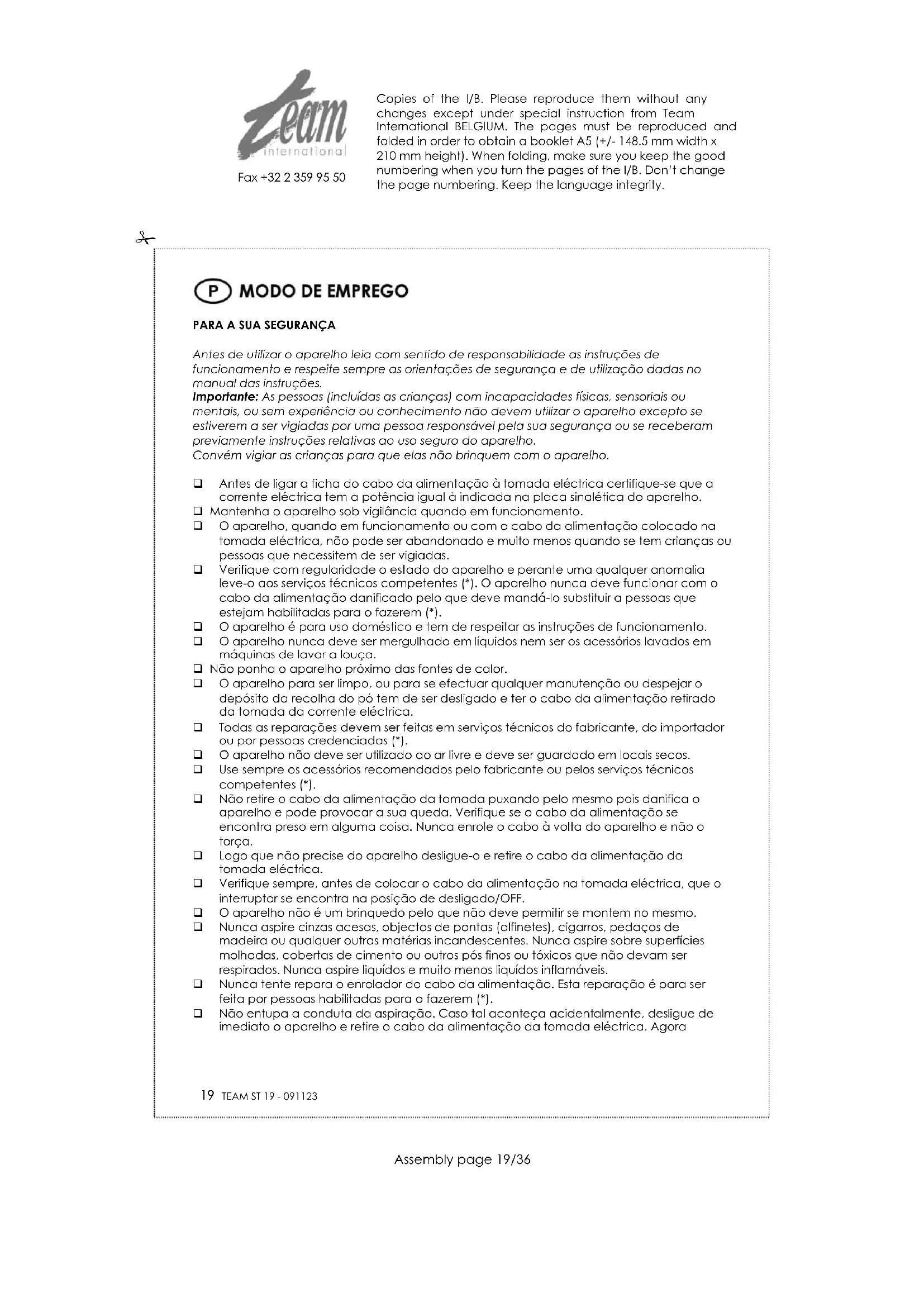 PROTECÇÃO DO MEIO AMBIENTE – DIRECTIVA 2002/96/CE Para a preservação do ambiente e da nossa saúde, a eliminação no fim da vida útil dos aparelhos eléctricos e electrónicos, deve-se efectuar no cumprimento das legislações em vigor e pela participação de todos quer sejam produtores ou utilizadores. É por esta razão que o vosso aparelho tem na placa sinalética o simbolo , informando que em caso algum o aparelho deve ser colocado no caixote do lixo camarário ou privado para que não vá para as lixeiras comuns mas sim devolvido ao revendedor ou depositado nos locais apropriados e identificados para a recolha destes aparelhos para que uma vez recolhidos sejam reciclados, reutilizados ou lhe sejam dados outras aplicações. Copies of the I/B. Please reproduce them without any changes except under special instruction from Team International BELGIUM. The pages must be reproduced and folded in order to obtain a booklet A5 (+/- 148.5 mm width x 210 mm height). When folding, make sure you keep the good numbering when you turn the pages of the I/B. Don’t change the page numbering. Keep the language integrity.