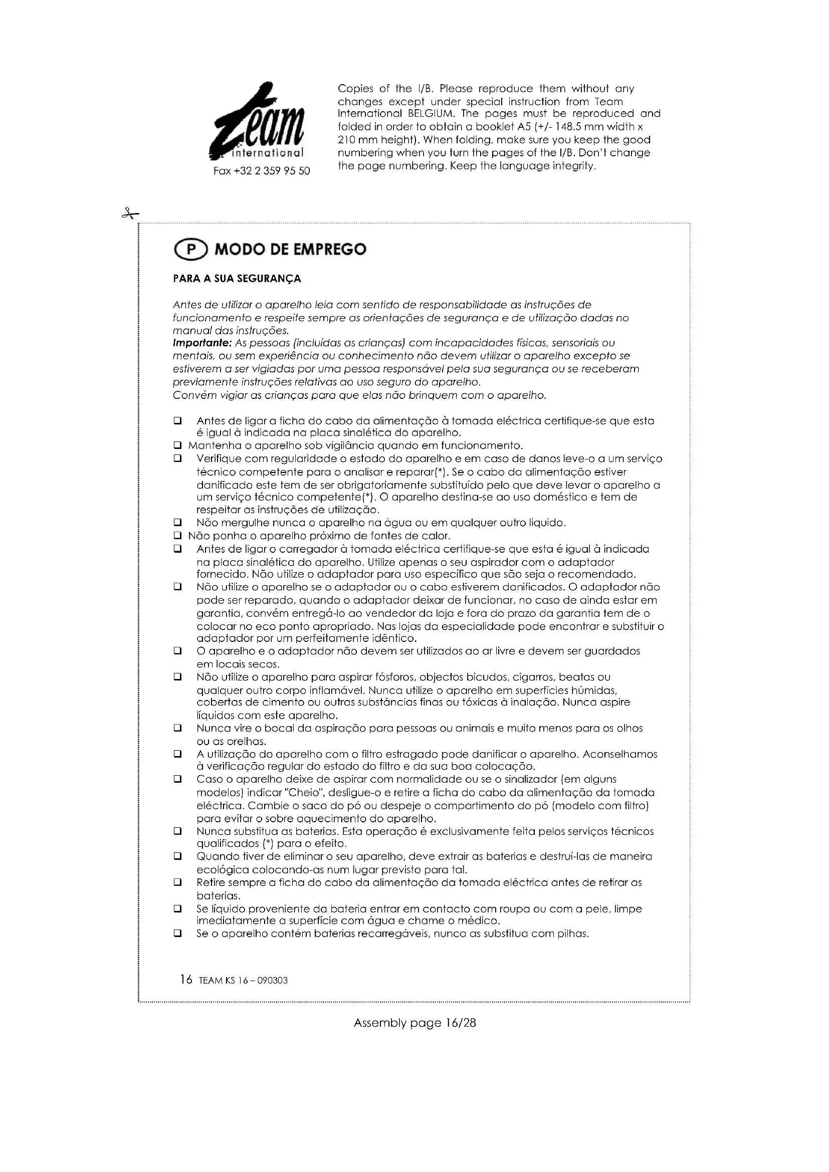 Limpe as mãos depois de ter tirado a bateria. Não deixe a bateria ao alcance das crianças. Coloque a bateria utilizada ou que esteja a deixar escapar líquido num saco e coloque-o num lugar previsto para tal para ser reciclada ou destruída de maneira ecológica. Informe-se na sua câmara municipal como proceder. PROTECÇÃO DO MEIO AMBIENTE – DIRECTIVA 2002/96/CE Para a preservação do ambiente e da nossa saúde, a eliminação no fim da vida útil dos aparelhos eléctricos e electrónicos, deve-se efectuar no cumprimento das legislações em vigor e pela participação de todos quer sejam produtores ou utilizadores. É por esta razão que o vosso aparelho tem na placa sinalética o símbolo , informando que em caso algum o aparelho deve ser colocado no caixote do lixo camarário ou privado para que não vá para as lixeiras comuns mas sim devolvido ao revendedor ou depositado nos locais apropriados e identificados para a recolha destes aparelhos para que uma vez recolhidos sejam reciclados, reutilizados ou lhe sejam dados outras aplicações. Copies of the I/B. Please reproduce them without any changes except under special instruction from Team International BELGIUM. The pages must be reproduced and folded in order to obtain a booklet A5 (+/- 148.5 mm width x 210 mm height). When folding, make sure you keep the good numbering when you turn the pages of the I/B. Don’t change the page numbering. Keep the language integrity. 19 TEAM KS 16 – 090303