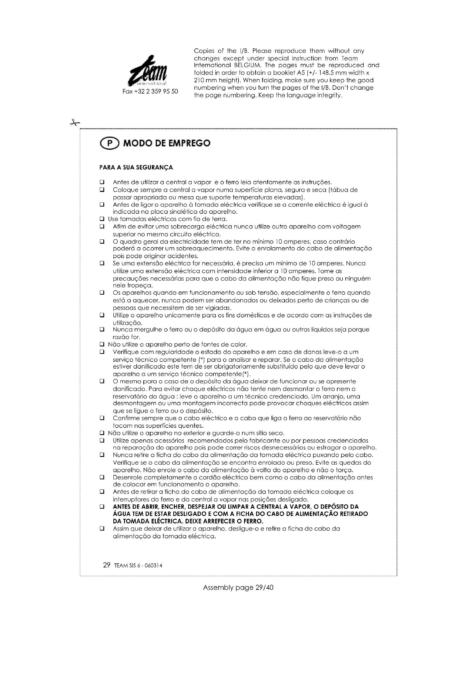 Antes de utilizar a central a vapor e o ferro leia atentamente as instruções. Coloque sempre a central a vapor numa superfície plana, segura e seca (tábua de passar apropriada ou mesa que suporte temperaturas elevadas). Antes de ligar o aparelho à tomada eléctrica verifique se a corrente eléctrica é igual à indicada na placa sinalética do aparelho. Use tomadas eléctricas com fio de terra. Afim de evitar uma sobrecarga eléctrica nunca utilize outro aparelho com voltagem superior no mesmo circuito eléctrico. O quadro geral da electricidade tem de ter no mínimo 10 amperes, caso contrário poderá a ocorrer um sobreaquecimento. Evite o enrolamento do cabo de alimentação pois pode originar acidentes. Se uma extensão eléctrica for necessária, é preciso um mínimo de 10 amperes. Nunca utilize uma extensão eléctrica com intensidade inferior a 10 amperes. Tome as precauções necessárias para que o cabo da alimentação não fique preso ou ninguém nele tropeça. Os aparelhos quando em funcionamento ou sob tensão, especialmente o ferro quando está a aquecer, nunca podem ser abandonados ou deixados perto de crianças ou de pessoas que necessitem de ser vigiadas. Utilize o aparelho unicamente para os fins domésticos e de acordo com as instruções de utilização. Nunca mergulhe o ferro ou o depósito da água em água ou outros líquidos seja porque razão for. Não utilize o aparelho perto de fontes de calor. Verifique com regularidade o estado do aparelho e em caso de danos leve-o a um serviço técnico competente (*) para o analisar e reparar. Se o cabo da alimentação estiver danificado este tem de ser obrigatoriamente substituído pelo que deve levar o aparelho a um serviço técnico competente(*). O mesmo para o caso de o depósito da água deixar de funcionar ou se apresente danificado. Para evitar choque eléctricos não tente nem desmontar o ferro nem o reservatório da água : leve o aparelho a um técnico credenciado. Um arranjo, uma desmontagem ou uma montagem incorrecta pode provocar choques eléctricos assim que se ligue o ferro ou o depósito. Confirme sempre que o cabo eléctrico e o cabo que liga o ferro ao reservatório não tocam nas superfícies quentes. Não utilize o aparelho no exterior e guarde-o num sítio seco. Utilize apenas acessórios recomendados pelo fabricante ou por pessoas credenciadas na reparação do aparelho pois pode correr riscos desnecessários ou estragar o aparelho. Nunca retire a ficha do cabo da alimentação da tomada eléctrica puxando pelo cabo. Verifique se o cabo da alimentação se encontra enrolado ou preso. Evite as quedas do aparelho. Não enrole o cabo da alimentação à volta do aparelho e não o torça. Desenrole completamente o cordão eléctrico bem como o cabo da alimentação antes de colocar em funcionamento o aparelho. Antes de retirar a ficha do cabo de alimentação da tomada eléctrica coloque os interruptores do ferro e da central a vapor nas posições desligado. ANTES DE ABRIR, ENCHER, DESPEJAR OU LIMPAR A CENTRAL A VAPOR, O DEPÓSITO DA ÁGUA TEM DE ESTAR DESLIGADO E COM A FICHA DO CABO DE ALIMENTAÇÃO RETIRADO DA TOMADA ELÉCTRICA. DEIXE ARREFECER O FERRO. Assim que deixar de utilizar o aparelho, desligue-o e retire a ficha do cabo da alimentação da tomada eléctrica. Copies of the I/B. Please reproduce them without any changes except under special instruction from Team International BELGIUM. The pages must be reproduced and folded in order to obtain a booklet A5 (+/- 148.5 mm width x 210 mm height). When folding, make sure you keep the good numbering when you turn the pages of the I/B. Don‟t change the page numbering. Keep the language integrity.