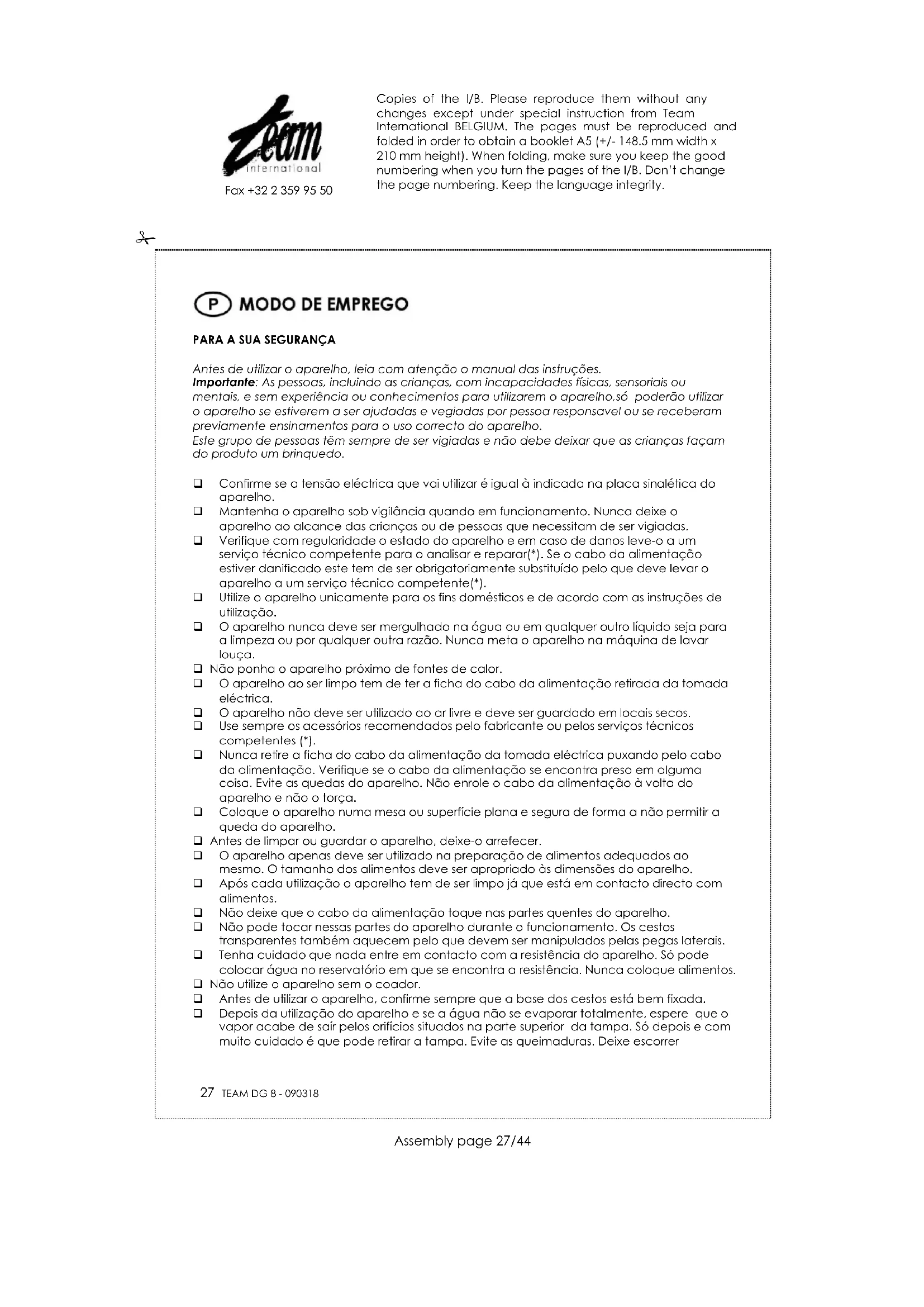 PROTECÇÃO DO MEIO AMBIENTE – DIRECTIVA 2002/96/CE Para a preservação do ambiente e da nossa saúde, a eliminação no fim da vida útil dos aparelhos eléctricos e electrónicos, deve-se efectuar no cumprimento das legislações em vigor e pela participação de todos quer sejam produtores ou utilizadores. É por esta razão que o vosso aparelho tem na placa sinalética o simbolo , informando que em caso algum o aparelho deve ser colocado no caixote do lixo camarário ou privado para que não vá para as lixeiras comuns mas sim devolvido ao revendedor ou depositado nos locais apropriados e identificados para a recolha destes aparelhos para que uma vez recolhidos sejam reciclados, reutilizados ou lhe sejam dados outras aplicações. Copies of the I/B. Please reproduce them without any changes except under special instruction from Team International BELGIUM. The pages must be reproduced and folded in order to obtain a booklet A5 (+/- 148.5 mm width x 210 mm height). When folding, make sure you keep the good numbering when you turn the pages of the I/B. Don’t change the page numbering. Keep the language integrity.