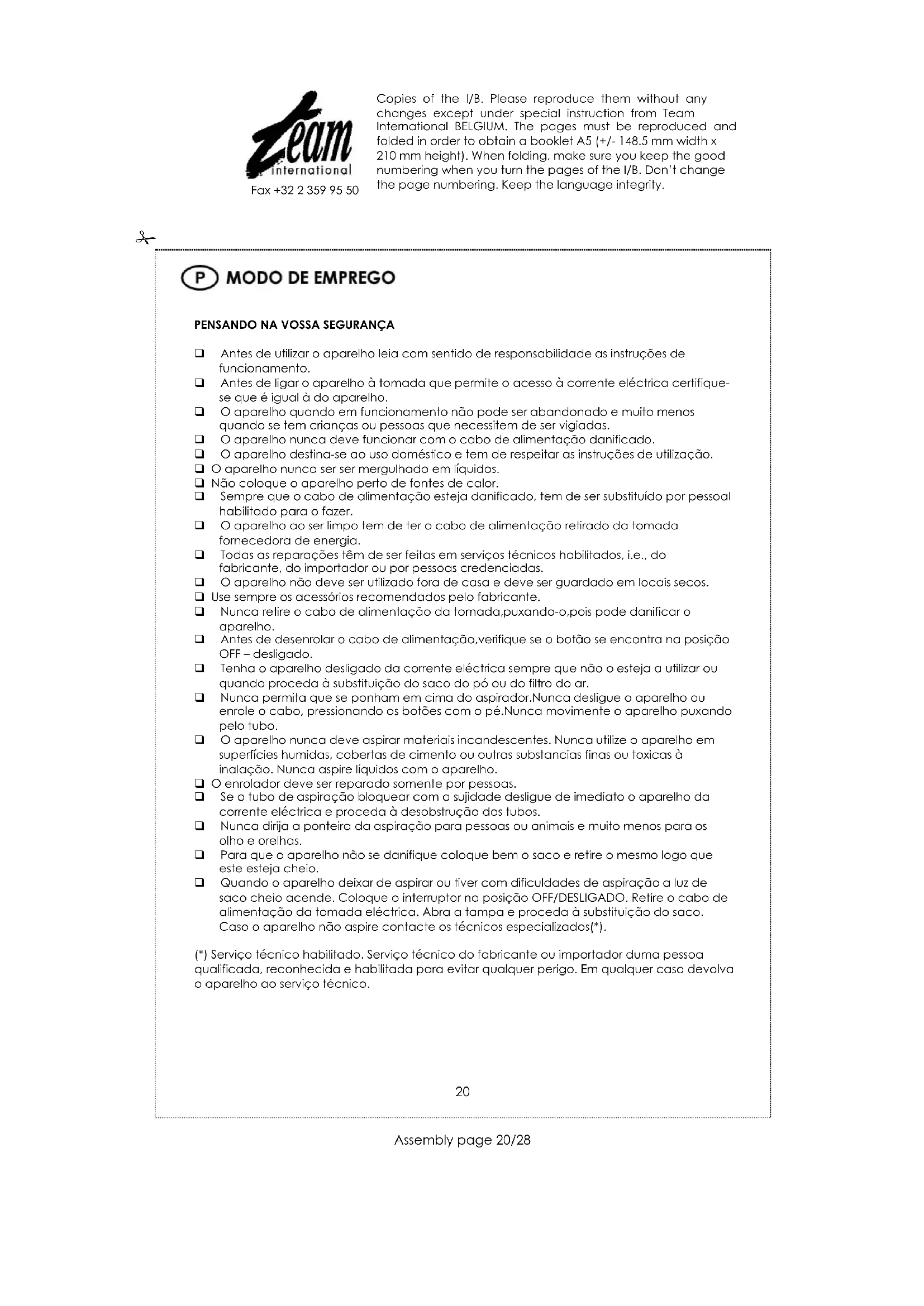 Fax +32 2 359 95 50 Filtro de protecção do motor A limpeza do filtro tem de ser feita ,regularmente de 3 em 3 meses,e de acordo com a utilização que se esteja a dar ao aparelho.Após retirar o filtro limpe-o.O filtro também pode ser lavado com agua e detergente.Se assim proceder, deixe-o secar completamente antes de o voltar a colocar no respectivo lugar. Filtro do ar A finalidade deste é manter a qualidade do ar.A substituição do filtro deve ser de 3 em 3 meses mas também tem de se ter em conta o modo de utilização e o que se aspira ATENÇÃO Toda e qualquer operação de limpeza ou manutenção tem de ser feita com o aparelho desligado da tomada de corrente eléctrica e o botão na posição de desligado. ALGUNS CONSELHOS Na limpeza dos degraus das escadas, deve utilizar o aparelho na posição vertical , tendo sempre muito cuidado para que este não caia. A manutenção do aparelho resume-se praticamente à substituição dos filtros. Sempre que verificar uma falha de funcionamento (diminuição da potência, ruído anormal, paragem completa do aparelho), verifique primeiramente se existe alguma obstrução da aspiração no tubo ou na mangueira e, em caso negativo, leve o seu aspirador a um centro autorizado para assistência técnica. Copies of the I/B. Please reproduce them without any changes except under special instruction from Team International BELGIUM. The pages must be reproduced and folded in order to obtain a booklet A5 (+/- 148.5 mm width x 210 mm height). When folding, make sure you keep the good numbering when you turn the pages of the I/B. Don‟t change the page numbering. Keep the language integrity.
