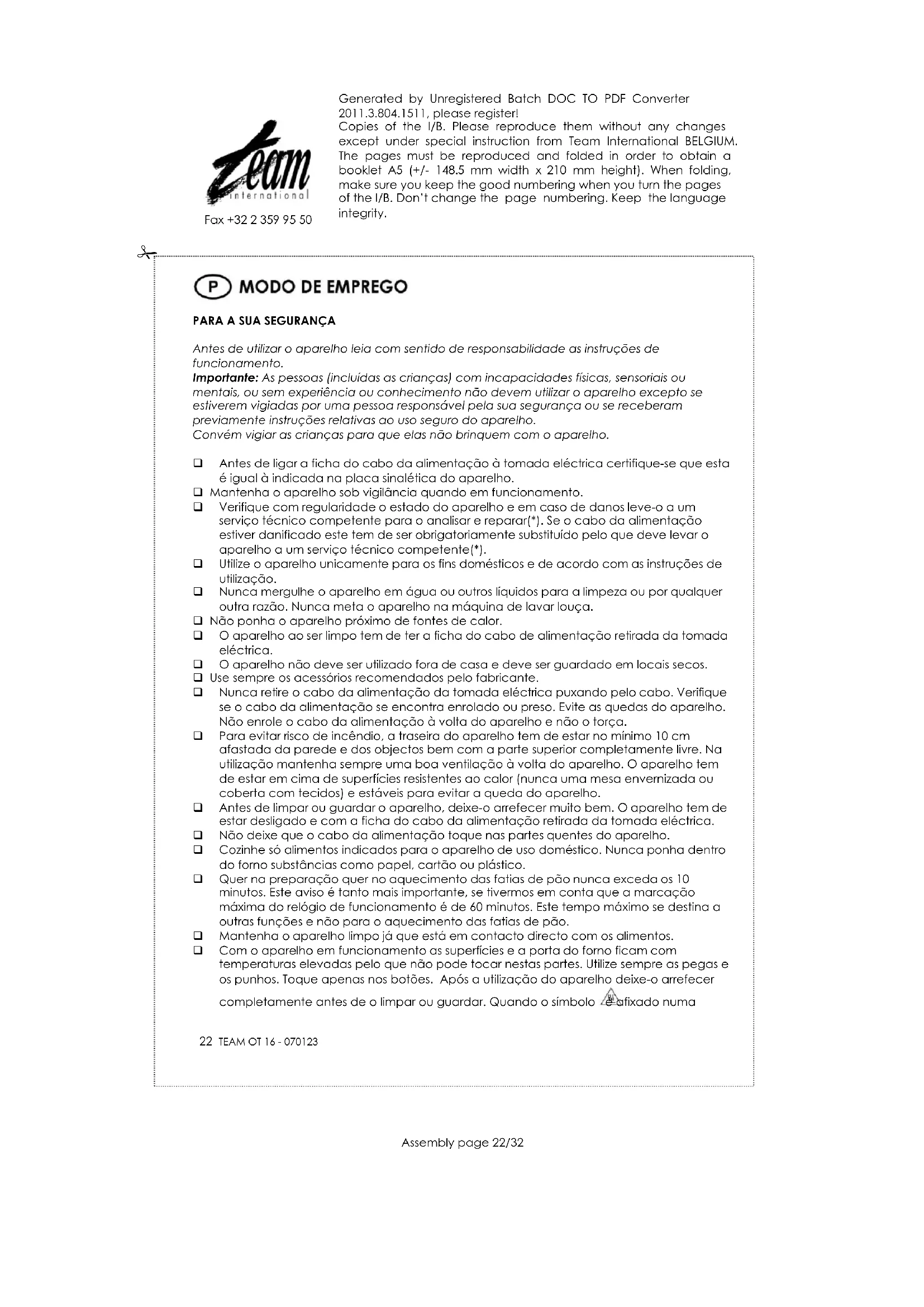Antes de utilizar o aparelho leia com sentido de responsabilidade as instruções de funcionamento. Importante: As pessoas (incluídas as crianças) com incapacidades físicas, sensoriais ou mentais, ou sem experiência ou conhecimento não devem utilizar o aparelho excepto se estiverem vigiadas por uma pessoa responsável pela sua segurança ou se receberam previamente instruções relativas ao uso seguro do aparelho. Convém vigiar as crianças para que elas não brinquem com o aparelho. Antes de ligar a ficha do cabo da alimentação à tomada eléctrica certifique-se que esta é igual à indicada na placa sinalética do aparelho. Mantenha o aparelho sob vigilância quando em funcionamento. Verifique com regularidade o estado do aparelho e em caso de danos leve-o a um serviço técnico competente para o analisar e reparar(*). Se o cabo da alimentação estiver danificado este tem de ser obrigatoriamente substituído pelo que deve levar o aparelho a um serviço técnico competente(*). Utilize o aparelho unicamente para os fins domésticos e de acordo com as instruções de utilização. Nunca mergulhe o aparelho em água ou outros líquidos para a limpeza ou por qualquer outra razão. Nunca meta o aparelho na máquina de lavar louça. Não ponha o aparelho próximo de fontes de calor. O aparelho ao ser limpo tem de ter a ficha do cabo de alimentação retirada da tomada eléctrica. O aparelho não deve ser utilizado fora de casa e deve ser guardado em locais secos. Use sempre os acessórios recomendados pelo fabricante. Nunca retire o cabo da alimentação da tomada eléctrica puxando pelo cabo. Verifique se o cabo da alimentação se encontra enrolado ou preso. Evite as quedas do aparelho. Não enrole o cabo da alimentação à volta do aparelho e não o torça. Para evitar risco de incêndio, a traseira do aparelho tem de estar no mínimo 10 cm afastada da parede e dos objectos bem com a parte superior completamente livre. Na utilização mantenha sempre uma boa ventilação à volta do aparelho. O aparelho tem de estar em cima de superfícies resistentes ao calor (nunca uma mesa envernizada ou coberta com tecidos) e estáveis para evitar a queda do aparelho. Antes de limpar ou guardar o aparelho, deixe-o arrefecer muito bem. O aparelho tem de estar desligado e com a ficha do cabo da alimentação retirada da tomada eléctrica. Não deixe que o cabo da alimentação toque nas partes quentes do aparelho. Cozinhe só alimentos indicados para o aparelho de uso doméstico. Nunca ponha dentro do forno substâncias como papel, cartão ou plástico. Quer na preparação quer no aquecimento das fatias de pão nunca exceda os 10 minutos. Este aviso é tanto mais importante, se tivermos em conta que a marcação máxima do relógio de funcionamento é de 60 minutos. Este tempo máximo se destina a outras funções e não para o aquecimento das fatias de pão. Mantenha o aparelho limpo já que está em contacto directo com os alimentos. Com o aparelho em funcionamento as superfícies e a porta do forno ficam com temperaturas elevadas pelo que não pode tocar nestas partes. Utilize sempre as pegas e os punhos. Toque apenas nos botões. Após a utilização do aparelho deixe-o arrefecer completamente antes de o limpar ou guardar. Quando o símbolo é afixado numaGenerated by Unregistered Batch DOC TO PDF Converter 2011.3.804.1511, please register! Copies of the I/B. Please reproduce them without any changes except under special instruction from Team International BELGIUM. The pages must be reproduced and folded in order to obtain a booklet A5 (+/- 148.5 mm width x 210 mm height). When folding, make sure you keep the good numbering when you turn the pages of the I/B. Don’t change the page numbering. Keep the language integrity.
