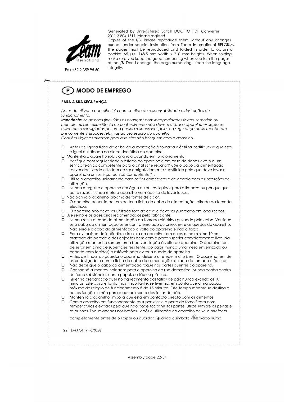 OT 19 - Forno TEAM - Manual de utilização gratuito