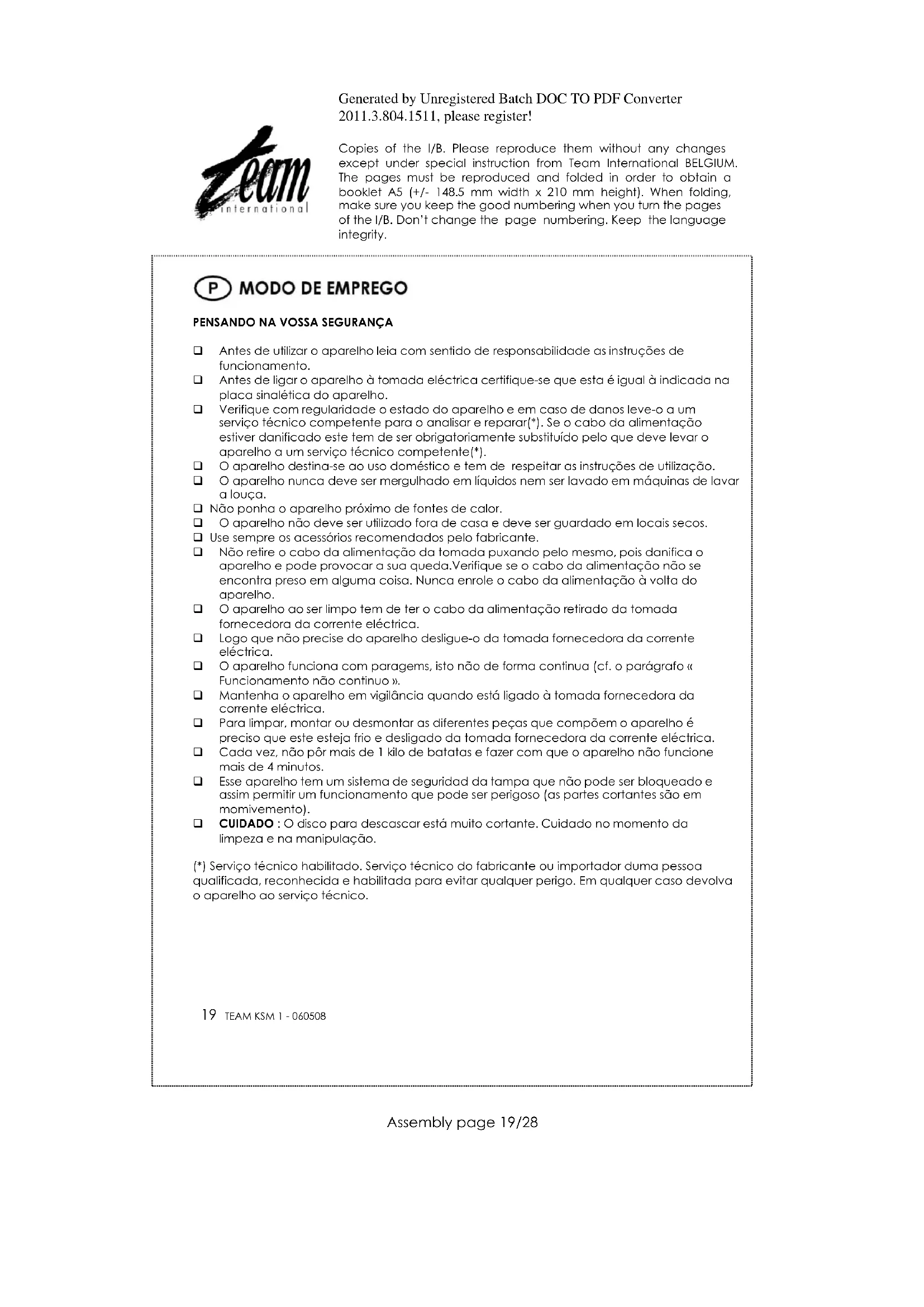 (*) Servico tcnico habilitado. Servico tcnico do fabricante ou importador duma Pessoa qualificada, reconhecida e habilitada para evitar qualquer perigo. Em qualquer caso devolva o aparelho ao service tcnico.