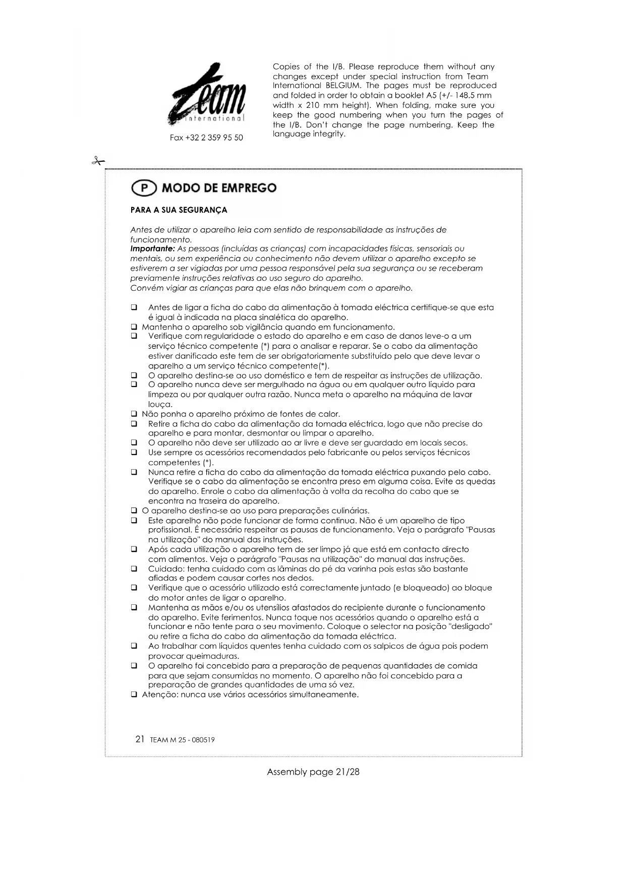 Antes de utilizar o aparelho leia com sentido de responsabilidade as instruções de funcionamento. Importante: As pessoas (incluídas as crianças) com incapacidades físicas, sensoriais ou mentais, ou sem experiência ou conhecimento não devem utilizar o aparelho excepto se estiverem a ser vigiadas por uma pessoa responsável pela sua segurança ou se receberam previamente instruções relativas ao uso seguro do aparelho. Convém vigiar as crianças para que elas não brinquem com o aparelho. Antes de ligar a ficha do cabo da alimentação à tomada eléctrica certifique-se que esta é igual à indicada na placa sinalética do aparelho. Mantenha o aparelho sob vigilância quando em funcionamento. Verifique com regularidade o estado do aparelho e em caso de danos leve-o a um serviço técnico competente (*) para o analisar e reparar. Se o cabo da alimentação estiver danificado este tem de ser obrigatoriamente substituído pelo que deve levar o aparelho a um serviço técnico competente(*). O aparelho destina-se ao uso doméstico e tem de respeitar as instruções de utilização. O aparelho nunca deve ser mergulhado na água ou em qualquer outro líquido para limpeza ou por qualquer outra razão. Nunca meta o aparelho na máquina de lavar louça. Não ponha o aparelho próximo de fontes de calor. Retire a ficha do cabo da alimentação da tomada eléctrica, logo que não precise do aparelho e para montar, desmontar ou limpar o aparelho. O aparelho não deve ser utilizado ao ar livre e deve ser guardado em locais secos. Use sempre os acessórios recomendados pelo fabricante ou pelos serviços técnicos competentes (*). Nunca retire a ficha do cabo da alimentação da tomada eléctrica puxando pelo cabo. Verifique se o cabo da alimentação se encontra preso em alguma coisa. Evite as quedas do aparelho. Enrole o cabo da alimentação à volta da recolha do cabo que se encontra na traseira do aparelho. O aparelho destina-se ao uso para preparações culinárias. Este aparelho não pode funcionar de forma continua. Não é um aparelho de tipo profissional. É necessário respeitar as pausas de funcionamento. Veja o parágrafo "Pausas na utilização" do manual das instruções. Após cada utilização o aparelho tem de ser limpo já que está em contacto directo com alimentos. Veja o parágrafo "Pausas na utilização" do manual das instruções. Cuidado: tenha cuidado com as lâminas do pé da varinha pois estas são bastante afiadas e podem causar cortes nos dedos. Verifique que o acessório utilizado está correctamente juntado (e bloqueado) ao bloque do motor antes de ligar o aparelho. Mantenha as mãos e/ou os utensílios afastados do recipiente durante o funcionamento do aparelho. Evite ferimentos. Nunca toque nos acessórios quando o aparelho está a funcionar e não tente para o seu movimento. Coloque o selector na posição "desligado" ou retire a ficha do cabo da alimentação da tomada eléctrica. Ao trabalhar com líquidos quentes tenha cuidado com os salpicos de água pois podem provocar queimaduras. O aparelho foi concebido para a preparação de pequenas quantidades de comida para que sejam consumidas no momento. O aparelho não foi concebido para a preparação de grandes quantidades de uma só vez. Atenção: nunca use vários acessórios simultaneamente. Copies of the I/B. Please reproduce them without any changes except under special instruction from Team International BELGIUM. The pages must be reproduced and folded in order to obtain a booklet A5 (+/- 148.5 mm width x 210 mm height). When folding, make sure you keep the good numbering when you turn the pages of the I/B. Don’t change the page numbering. Keep the language integrity.