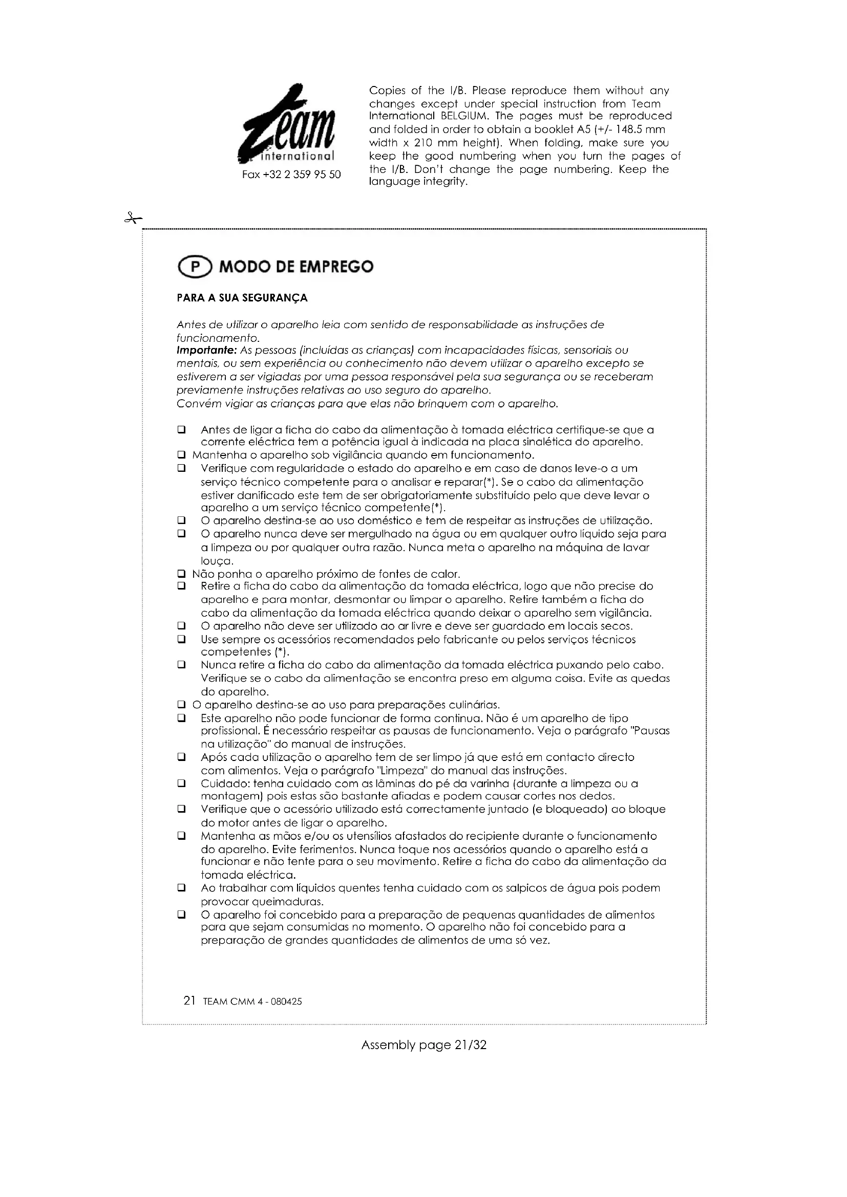 Fax +32 2 359 95 50 PROTECÇÃO DO MEIO AMBIENTE – DIRECTIVA 2002/96/CE Para a preservação do ambiente e da nossa saúde, a eliminação no fim da vida útil dos aparelhos eléctricos e electrónicos, deve-se efectuar no cumprimento das legislações em vigor e pela participação de todos quer sejam produtores ou utilizadores. É por esta razão que o vosso aparelho tem na placa sinalética o simbolo , informando que em caso algum o aparelho deve ser colocado no caixote do lixo camarário ou privado para que não vá para as lixeiras comuns mas sim devolvido ao revendedor ou depositado nos locais apropriados e identificados para a recolha destes aparelhos para que uma vez recolhidos sejam reciclados, reutilizados ou lhe sejam dados outras aplicações. Copies of the I/B. Please reproduce them without any changes except under special instruction from Team International BELGIUM. The pages must be reproduced and folded in order to obtain a booklet A5 (+/- 148.5 mm width x 210 mm height). When folding, make sure you keep the good numbering when you turn the pages of the I/B. Don’t change the page numbering. Keep the language integrity.