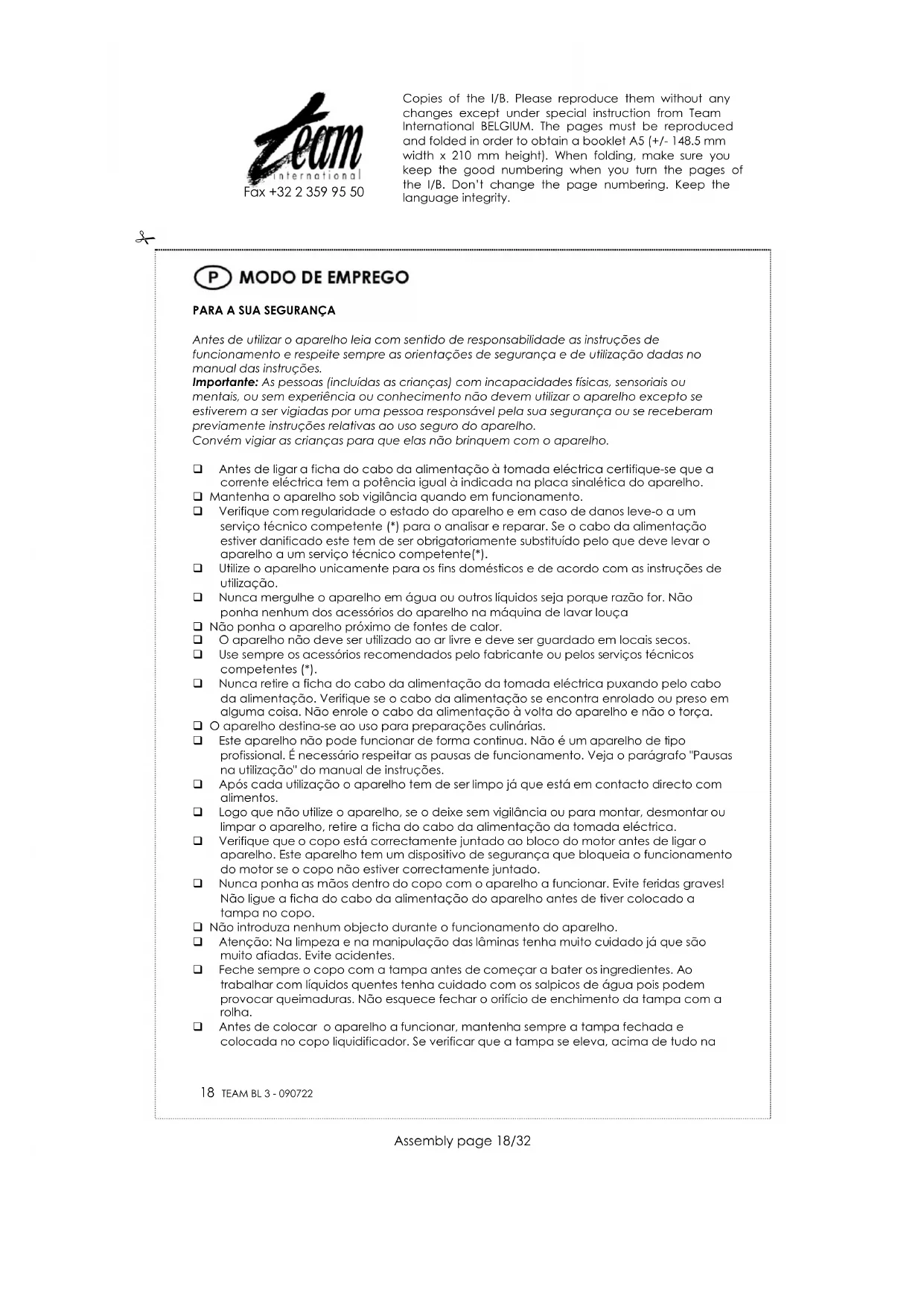 Fax +32 2 359 95 50 Reponha sempre a tampa e feche-a correctamente antes de voltar a colocar em funcionamento o copo liquidificador. Releia a secção « Para a sua segurança ». LIMPEZA Retire sempre a ficha do cabo da alimentação da tomada eléctrica antes de proceder à limpeza do aparelho. Para um enxaguar rápido do copo, entre duas misturas seguidas e diferentes, coloque água da torneira e faça funcionar o aparelho. Não utilize nenhum detergente. Para uma limpeza completa, retire o copo do bloco do motor. Então pode lavar o conjunto com água em sabonária e enxaguar bem com água limpa. Deixe secar completamente as peças antes de voltar a montar o aparelho. Não ponha nenhuma da partes do aparelho na máquina de lavar louça. Limpe o bloco do motor com um esfregão não abrasivo e ligeiramente húmido. PROTECÇÃO DO MEIO AMBIENTE – DIRECTIVA 2002/96/CE Para a preservação do ambiente e da nossa saúde, a eliminação no fim da vida útil dos aparelhos eléctricos e electrónicos, deve-se efectuar no cumprimento das legislações em vigor e pela participação de todos quer sejam produtores ou utilizadores. É por esta razão que o vosso aparelho tem na placa sinalética o símbolo , informando que em caso algum o aparelho deve ser colocado no caixote do lixo camarário ou privado para que não vá para as lixeiras comuns mas sim devolvido ao revendedor ou depositado nos locais apropriados e identificados para a recolha destes aparelhos para que uma vez recolhidos sejam reciclados, reutilizados ou lhe sejam dados outras aplicações. Copies of the I/B. Please reproduce them without any changes except under special instruction from Team International BELGIUM. The pages must be reproduced and folded in order to obtain a booklet A5 (+/- 148.5 mm width x 210 mm height). When folding, make sure you keep the good numbering when you turn the pages of the I/B. Don’t change the page numbering. Keep the language integrity.