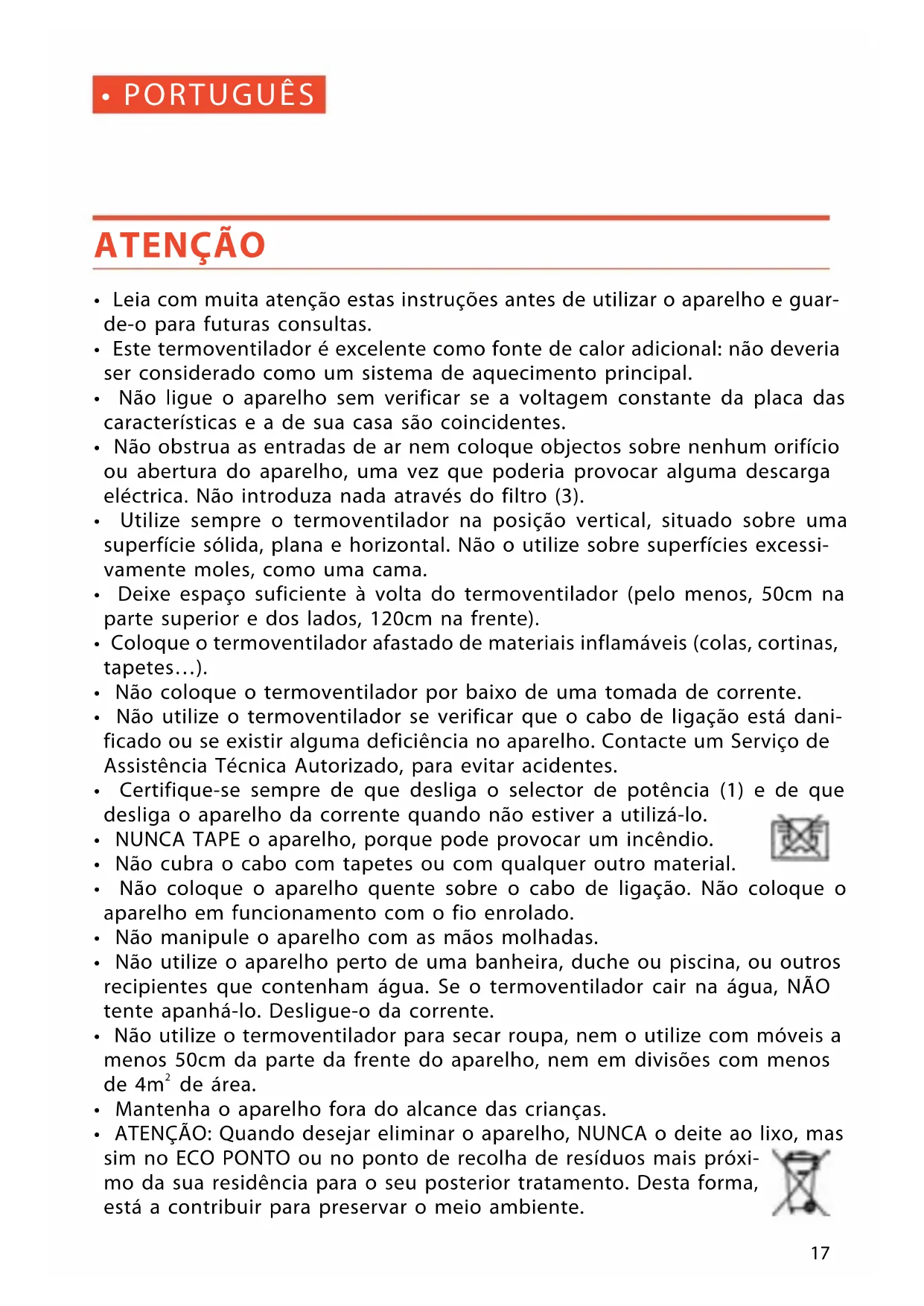 - ATENCÃO: Quando desejar eliminar o aparelho, NUNCA o deite ao lixo, mas