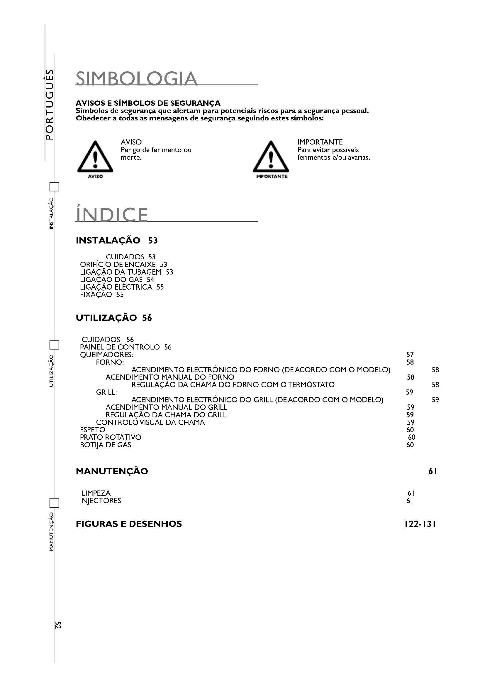 PORTUGUÊS SIMBOLOGIA AVISOS E SÍMBOLOS DE SEGURANÇA Símbolos de segurança que alertam para potenciais riscos para a segurança pessoal. Obedecer a todas as mensagens de segurança seguindo estes símbolos: ÍNDICE INSTALAÇÃO 53