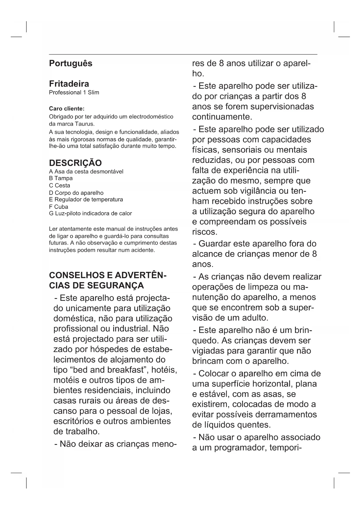 Professional 1 Slim - Fritadeira TAURUS - Manual de utilização gratuito