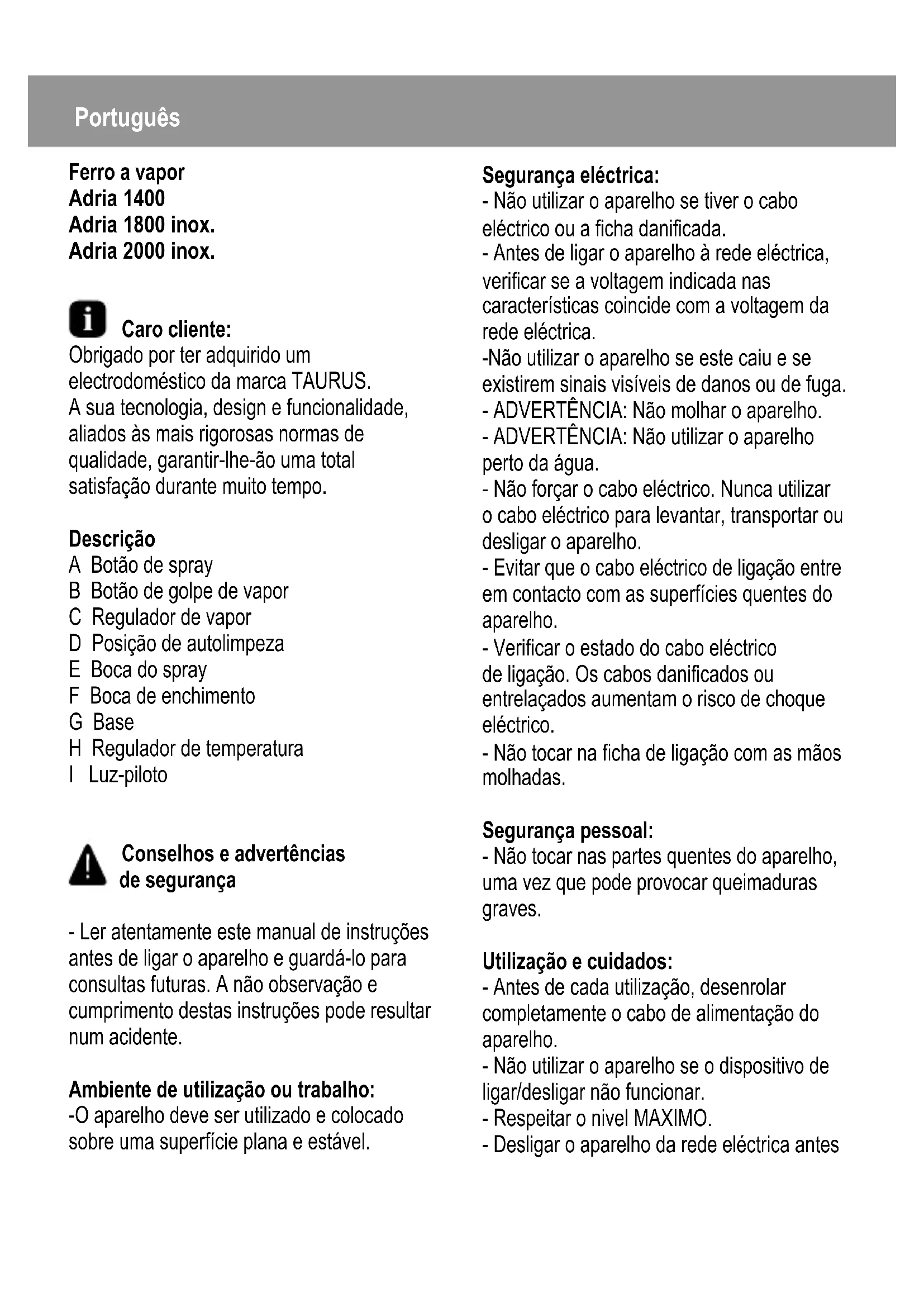 Adria 1400 - Ferro de passar TAURUS - Manual de utilização gratuito