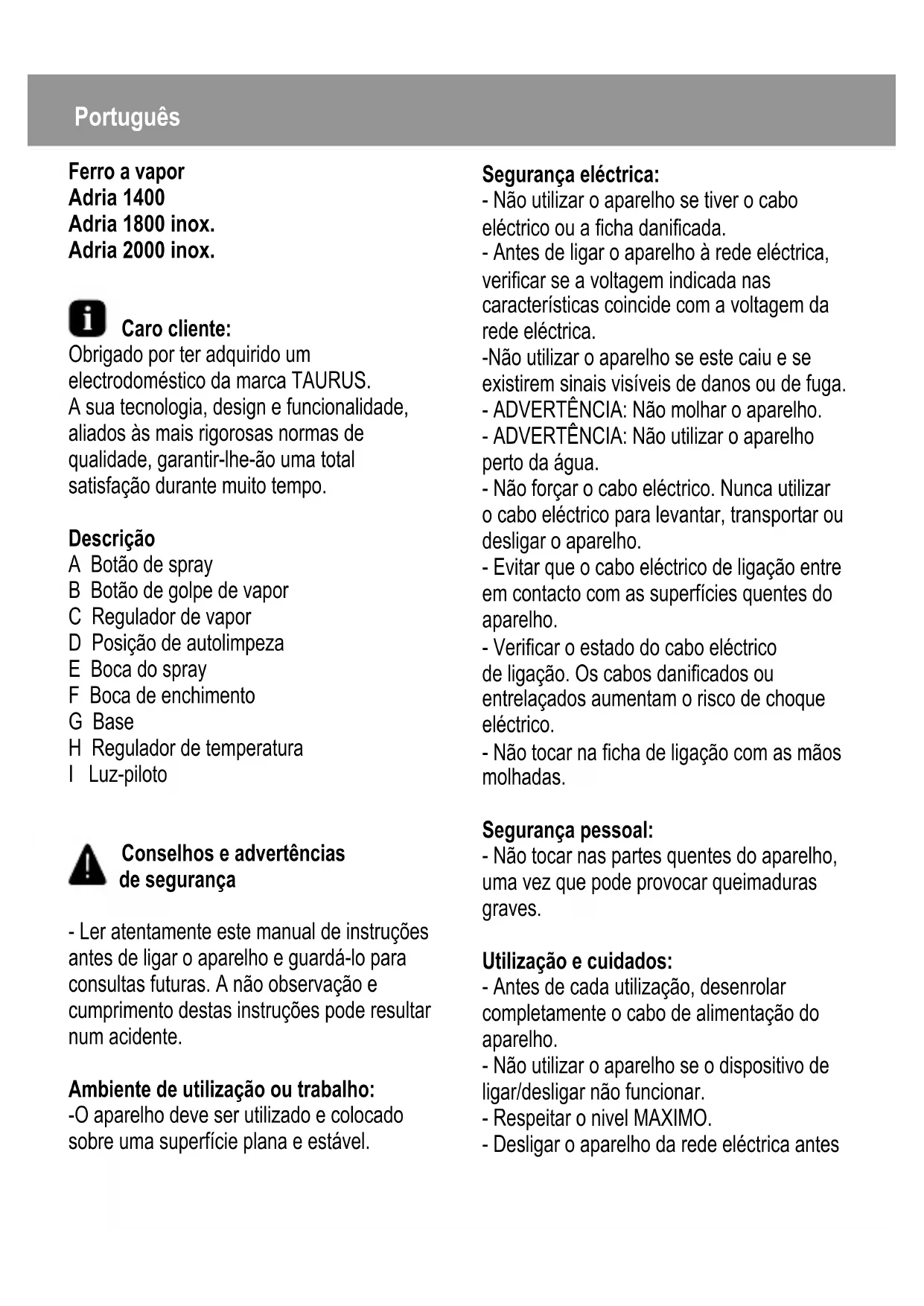 Adria 1800 inox - Ferro de passar TAURUS - Manual de utilização gratuito