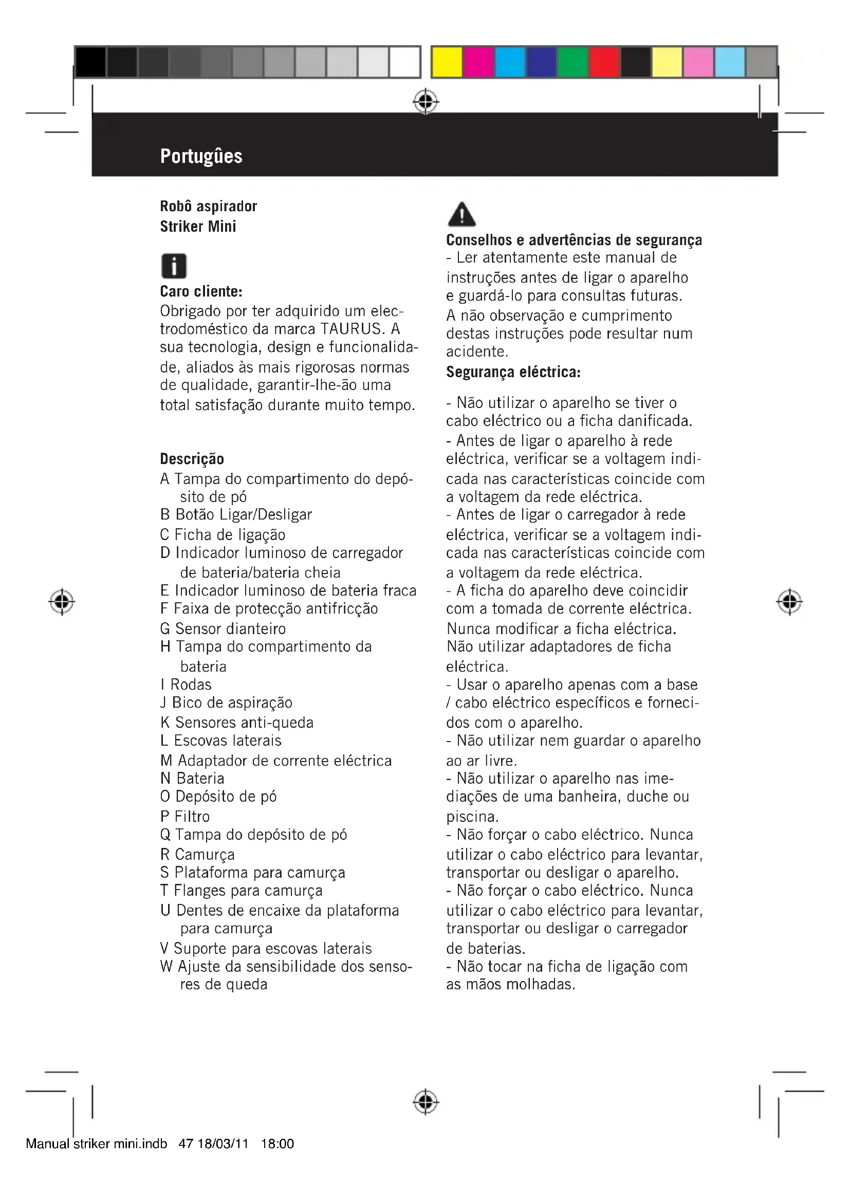 ria con una nuova 8 L’apparecchio si muove all’indietro dopo averlo messo in funzione. L’apparecchio si trova su una superficie di colore scuro (al riflesso della luce sul pavimento) Regolare i due sensori di altezza alla posizio- ne 2 o 3 (Fig.10) - In caso di guasto, telefonare al nu- mero di attenzione al cliente indicato nel foglio di garanzia. Non cercare di smontare o di riparare l’apparecchio da soli perché può essere pericoloso. - Se il cavo di collegamento alla rete è danneggiato, non cercare di sostituirlo da soli, ma rivolgersi ad un Centro d’Assistenza Tecnica autorizzato. Per i prodotti dell’Unione Europea e/o nel caso in cui sia previsto dalla legis- lazione del Suo paese di origine: Prodotto ecologico e riciclabile - I materiali che costituiscono l’imballaggio di questo apparecchio sono riciclabili. Per sbarazzarsene, utilizzare gli appositi contenitori pub- blici, adatti per ogni tipo di materiale. - Il prodotto non contiene sostanze dannose per l’ambiente. Questo simbolo indica che, per smaltire il prodotto al termine della sua durata utile, bisogna depositarlo presso un gestore di residui, autorizzato per la raccolta differenziata di rifiuti di apparecchia- ture elettriche ed elettroniche (RAEE). Questo simbolo indica che il prodotto può contenere pile o batterie. Toglierle prima di gettare il prodotto. Le pile/batterie vanno depositate negli appositi contenitori per la raccolta. E non devono mai essere gettate nel fuoco. Manual striker mini.indb 45 18/03/11 18:00Come rimuovere le batterie dall’interno dell’apparecchio: Avvertenza: È importante che le batterie siano completamente scariche prima di procedere alla loro rimozione. Per rimuovere le batterie, al termine della sua durata utile, procedere a: - Rimuovere il coperchio del vano batteria/e - Rimuovere la batteria dal suo alloggio. - Chiudere il coperchio del vano batteria/e Questo apparecchio è conforme alla Direttiva 2006/95/CE di Bassa Ten- sione e alla Direttiva 2004/108/CE sulla Compatibilità Elettromagnetica. Manual striker mini.indb 46 18/03/11 18:00Portugûes Robô aspirador Striker Mini Caro cliente: Obrigado por ter adquirido um elec- trodoméstico da marca TAURUS. A sua tecnologia, design e funcionalida- de, aliados às mais rigorosas normas de qualidade, garantir-lhe-ão uma total satisfação durante muito tempo. Descrição A Tampa do compartimento do depó- sito de pó B Botão Ligar/Desligar C Ficha de ligação D Indicador luminoso de carregador de bateria/bateria cheia E Indicador luminoso de bateria fraca F Faixa de protecção antifricção G Sensor dianteiro H Tampa do compartimento da bateria I Rodas J Bico de aspiração K Sensores anti-queda L Escovas laterais M Adaptador de corrente eléctrica N Bateria O Depósito de pó P Filtro Q Tampa do depósito de pó R Camurça S Plataforma para camurça T Flanges para camurça U Dentes de encaixe da plataforma para camurça V Suporte para escovas laterais W Ajuste da sensibilidade dos senso- res de queda Conselhos e advertências de segurança - Ler atentamente este manual de instruções antes de ligar o aparelho e guardá-lo para consultas futuras. A não observação e cumprimento destas instruções pode resultar num acidente. Segurança eléctrica: - Não utilizar o aparelho se tiver o cabo eléctrico ou a ficha danificada. - Antes de ligar o aparelho à rede eléctrica, verificar se a voltagem indi- cada nas características coincide com a voltagem da rede eléctrica. - Antes de ligar o carregador à rede eléctrica, verificar se a voltagem indi- cada nas características coincide com a voltagem da rede eléctrica. - A ficha do aparelho deve coincidir com a tomada de corrente eléctrica. Nunca modificar a ficha eléctrica. Não utilizar adaptadores de ficha eléctrica. - Usar o aparelho apenas com a base / cabo eléctrico específicos e forneci- dos com o aparelho. - Não utilizar nem guardar o aparelho ao ar livre. - Não utilizar o aparelho nas ime- diações de uma banheira, duche ou piscina. - Não forçar o cabo eléctrico. Nunca utilizar o cabo eléctrico para levantar, transportar ou desligar o aparelho. - Não forçar o cabo eléctrico. Nunca utilizar o cabo eléctrico para levantar, transportar ou desligar o carregador de baterias. - Não tocar na ficha de ligação com as mãos molhadas. Manual striker mini.indb 47 18/03/11 18:00Segurança pessoal: - Evite qualquer contacto com o líquido que se pode desprender da bateria. Em caso de contacto aciden- tal com os olhos, lave-os e consulte imediatamente um médico. O líquido derramado pela bateria pode provocar irritações ou queimaduras. Utilização e cuidados: - Antes de cada utilização, desenrolar completamente o cabo de alimen- tação do aparelho. - Não usar o aparelho no caso de os acessórios ou consumíveis não esta- rem devidamente encaixados. - Não utilizar o aparelho se o disposi- tivo de ligar/desligar não funcionar. - Não mover o aparelho enquanto estiver em funcionamento. - Não forçar a capacidade de trabalho do aparelho. - Retirar as pilhas ou baterias do aparelho no caso de não o utilizar durante longos períodos de tempo. - Desligar o carregador de baterias da rede eléctrica quando não estiver a ser utilizado e antes de iniciar qualquer operação de limpeza. - Este aparelho está projectado uni- camente para utilização doméstica, não para utilização profissional ou industrial. - Este aparelho não é um brinquedo. As crianças devem ser vigiadas para garantir que não brincam com o aparelho. - Este aparelho está projectado para ser utilizado apenas por adultos. Não permitir que seja utilizado por pes- soas não familiarizadas com este tipo de produto, pessoas incapacitadas ou crianças. - Guardar este aparelho fora do alcance de crianças e/ou pessoas incapacitadas. - Nunca aspirar objectos incandes- centes ou cortantes (beatas, cinzas, pregos, etc.). - Não abrir a(s) bateria(s) em nenhu- ma situação. - Evite provoc