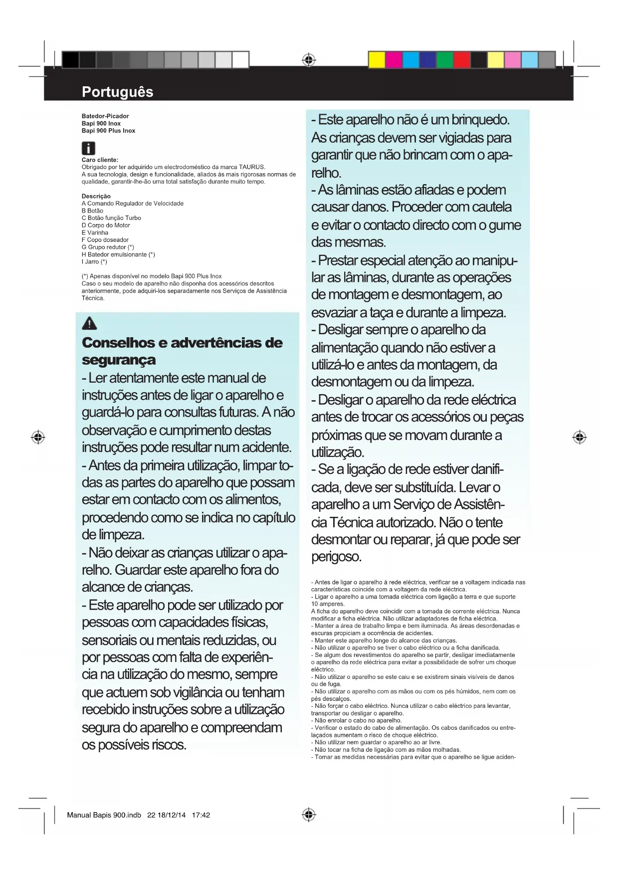 Besciamella 10 600 ml Fondere 30 gr di burro in una pentola a fuoco lento, aggiungere 100 gr di farina e 30 gr di cipolla soffritta (precedentemente tritata con il tritatutto) e aggiunge- re gradualmente i 500 ml di latte 15 s Triturare ghiac- cio 20 4/6 cubetti Introdurre i cubetti nella caraffa e triturare esercitan- do una certa pressione su ognuno di essi 15 s Montare la panna 250 ml Versare la panna liquida ben refrigerata (tra 0 e 5°C) in un recipiente e lavorare con la frusta muovendola in senso orario. Si consiglia di lavorare alla velocità minima, per poi passare alla 2 velocità una volta che la panna comincia a essere più consistente. Prestare attenzione a non eccedere il tempo di lavorazione, in quanto la panna potrebbe diventare burro 1-2 min Montare gli albumi 2 5 albumi Versare gli albumi in un recipiente e lavorare con la frusta eseguendo un movimento in senso verticale no a montarli a neve 1,5 min Purè di patate 20 400 g È possibile triturare lavorando direttamente nella pentola di cottura 30 s Pappa 20 300 g Tritare e versare nel recipiente 100 gr di mele, 100 gr di bananam 50 gr di biscotti e il succo di un'arancia 25 s Pangrattato 20 50 g Spezzettare il pane secco prima di metterlo nel bicchiere e triturare no a ottenere la consistenza desiderata 50 s Formaggio grattugiato 20 200 g Spezzettare a dadi di 1 cm e tritare no a ottenere la consistenza desiderata 30 – 40 s Carota triturata 20 300 g Pelare la buccia, sminuzzare in cubetti di 1 cm e triturare no a ottenere la consistenza desiderata 20 s Tritare frutti secchi 20 300 g Rimuovere il guscio e triturare no a ottenere la consistenza desiderata 20 s Sminuzzare uova sode 20 5 uova Tagliare a quarti e tritare no a ottenere la consisten- za desiderata 10 s Carne macinata (cruda o cotta) 20 300 g Sminuzzare in cubetti di 1 cm e tritare no a ottenere la consistenza desiderata 30 s Macinare carne 20 40 g Sminuzzare dapprima in cubetti di 1 cm. Triturare no a ottenere la consistenza desiderata 3 s Succo di pomodoro 20 400 g Tagliare i pomodori in quarti e riporli nel recipien- te setaccio. Lavorarli per far colare il succo nella caraffa 20 s Spezzettare prosciutto crudo 20 60 g Sminuzzare dapprima in cubetti di 1 cm. Tritare no a ottenere la consistenza desiderata 3 s Tritare albicoc- che secche TURBO 60 g Sminuzzare in cubetti di 1 cm e tritare no a ottenere la consistenza desiderata 3 s Manual Bapis 900.indb 21 18/12/14 17:42Português Batedor-Picador Bapi 900 Inox Bapi 900 Plus Inox Caro cliente: Obrigado por ter adquirido um electrodoméstico da marca TAURUS. A sua tecnologia, design e funcionalidade, aliados às mais rigorosas normas de qualidade, garantir-lhe-ão uma total satisfação durante muito tempo. Descrição A Comando Regulador de Velocidade B Botão C Botão função Turbo D Corpo do Motor E Varinha F Copo doseador G Grupo redutor (*) H Batedor emulsionante (*) I Jarro (*) (*) Apenas disponível no modelo Bapi 900 Plus Inox Caso o seu modelo de aparelho não disponha dos acessórios descritos anteriormente, pode adquiri-los separadamente nos Serviços de Assistência Técnica. Conselhos e advertências de segurança - Ler atentamente este manual de instruções antes de ligar o aparelho e guardá-lo para consultas futuras. A não observação e cumprimento destas instruções pode resultar num acidente. - Antes da primeira utilização, limpar to- das as partes do aparelho que possam estar em contacto com os alimentos, procedendo como se indica no capítulo de limpeza. - Não deixar as crianças utilizar o apa- relho. Guardar este aparelho fora do alcance de crianças. - Este aparelho pode ser utilizado por pessoas com capacidades físicas, sensoriais ou mentais reduzidas, ou por pessoas com falta de experiên- cia na utilização do mesmo, sempre que actuem sob vigilância ou tenham recebido instruções sobre a utilização segura do aparelho e compreendam os possíveis riscos. - Este aparelho não é um brinquedo. As crianças devem ser vigiadas para garantir que não brincam com o apa- relho. - As lâminas estão afiadas e podem causar danos. Proceder com cautela e evitar o contacto directo com o gume das mesmas. - Prestar especial atenção ao manipu- lar as lâminas, durante as operações de montagem e desmontagem, ao esvaziar a taça e durante a limpeza. - Desligar sempre o aparelho da alimentação quando não estiver a utilizá-lo e antes da montagem, da desmontagem ou da limpeza. - Desligar o aparelho da rede eléctrica antes de trocar os acessórios ou peças próximas que se movam durante a utilização. - Se a ligação de rede estiver danifi- cada, deve ser substituída. Levar o aparelho a um Serviço de Assistên- cia Técnica autorizado. Não o tente desmontar ou reparar, já que pode ser perigoso. - Antes de ligar o aparelho à rede eléctrica, vericar se a voltagem indicada nas características coincide com a voltagem da rede eléctrica. - Ligar o aparelho a uma tomada eléctrica com ligação a terra e que suporte 10 amperes. A cha do aparelho deve coincidir com a tomada de corrente eléctrica. Nunca modicar a cha eléctrica. Não utilizar adaptadores de cha eléctrica. - Manter a área de trabalho limpa e bem iluminada. As áreas desordenadas e escuras propiciam a ocorrência de acidentes. - Manter este aparelho longe do alcance das crianças. - Não utilizar o aparelho se tiver o cabo eléctrico ou a cha danicada. - Se algum dos revestimentos do aparelho se partir, desligar imediatamente o aparelho da rede eléctrica para evitar a possibilidade de sofrer um choque eléctrico. - Não utilizar o aparelho se este caiu e se existirem sinais visíveis de danos ou de fuga. - Não utilizar o aparelho com as mãos ou com os pés húmidos, nem com os pés descalços. - Não forçar o cabo eléctrico. Nunca utilizar o cabo eléctrico para levantar, transportar ou desligar o aparelho. - Não enrolar o cabo no aparelho. - Vericar o estado do cabo de alimentação. Os cabos danicados ou ent